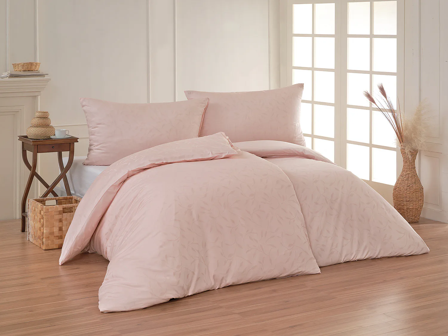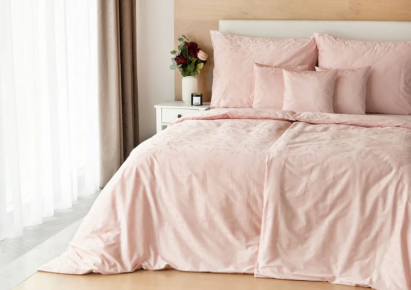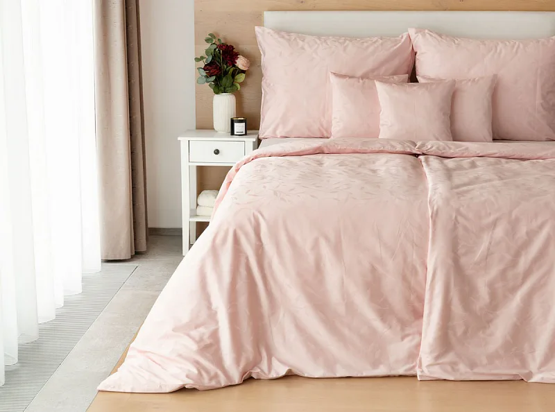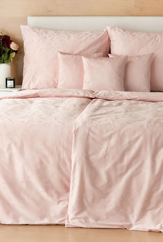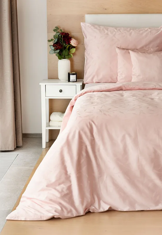 Tato synonyma vystihují žakárové damaškové povlečení VICTORIA s decentním florálním vzorem. Přirozený lesk a jemné vytkané lístky se dokonale snoubí s romantickým pastelově růžovým odstínem.