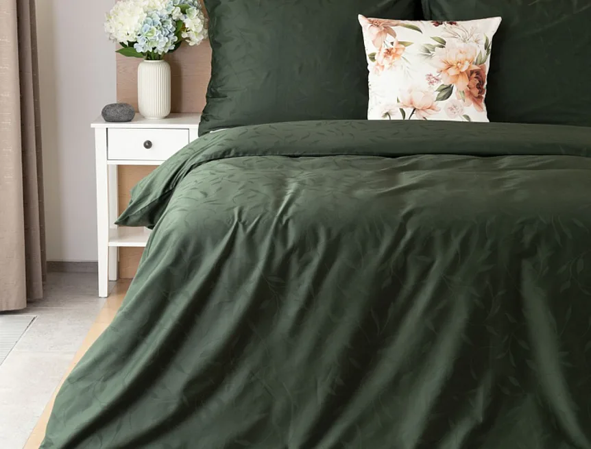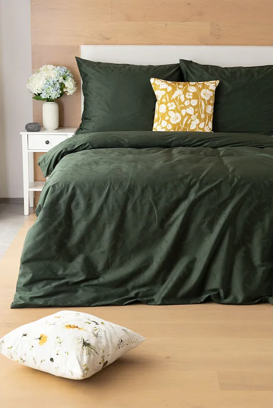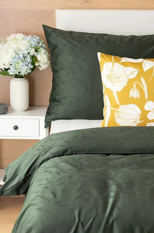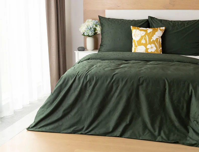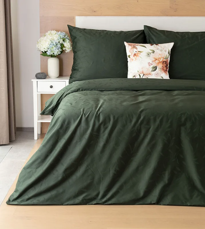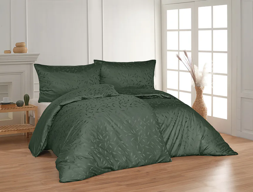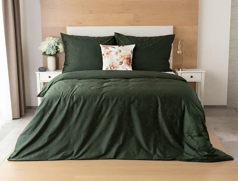 Tato synonyma vystihují žakárové damaškové povlečení VICTORIA s decentním florálním vzorem. Přirozený lesk a jemné vytkané lístky se dokonale snoubí s temně zeleným odstínem.