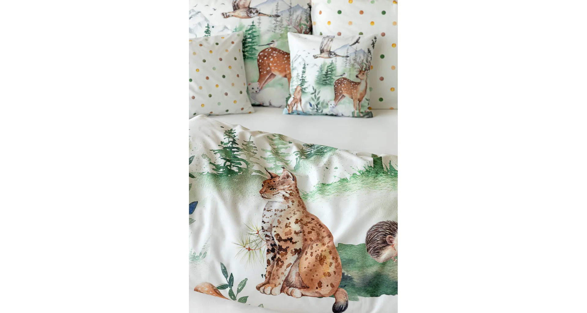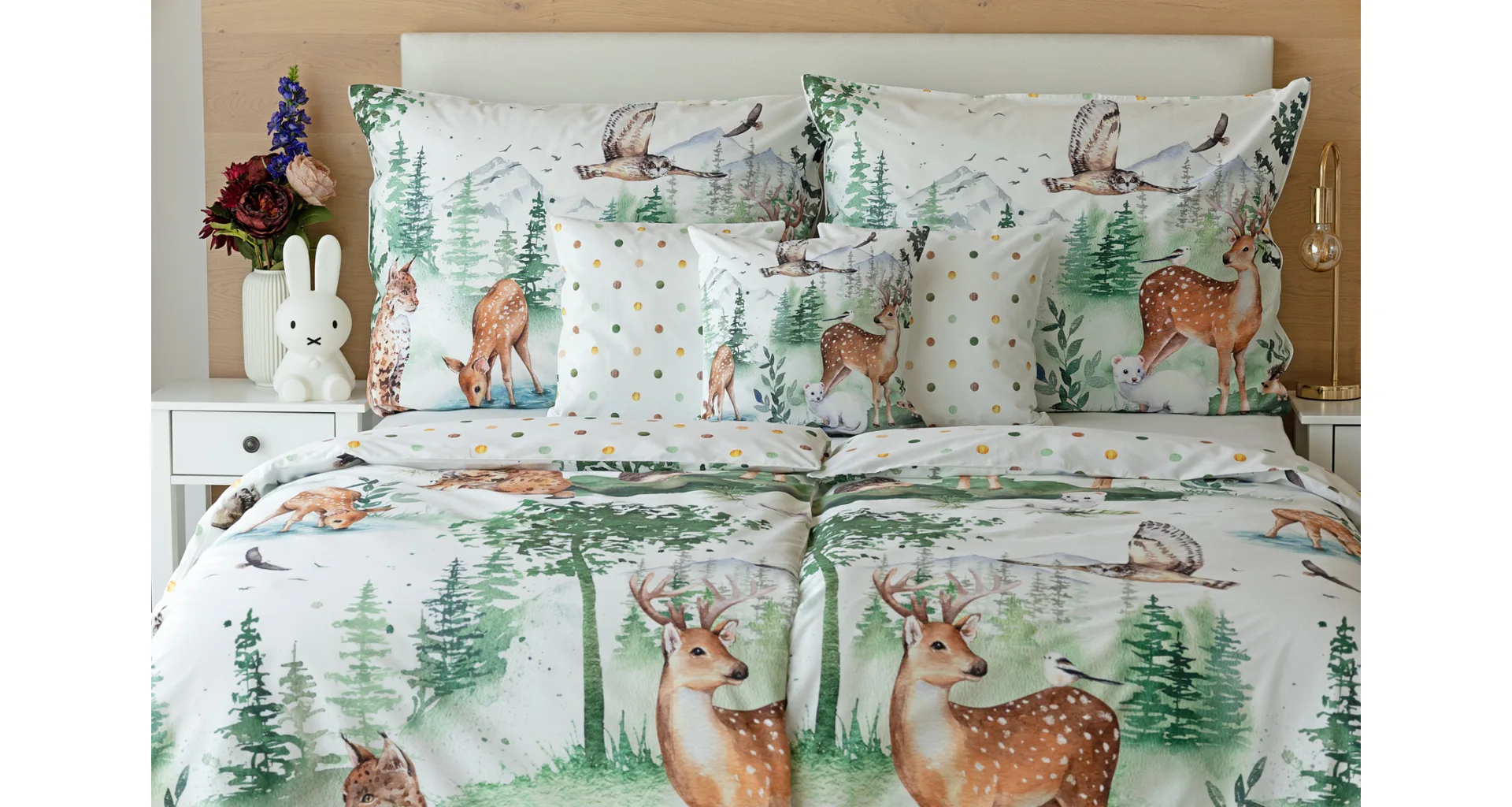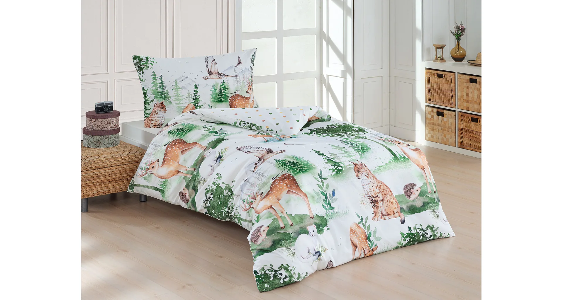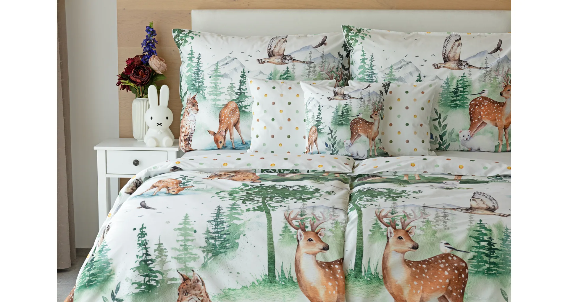 S bavlněným povlečením Wild se dětský pokojíček promění v útulnou říši lesních zvířátek, o kterých můžete před spaním vyprávět příběhy. Podkladem tohoto vzoru se stala ruční malba, která vyniká na povlečení v precizním detailu díky nejmodernějšímu digitálnímu tisku. Vaše děti budou spokojeně snít díky vysoce kvalitnímu materiálu z výběrové 100% bavlny.