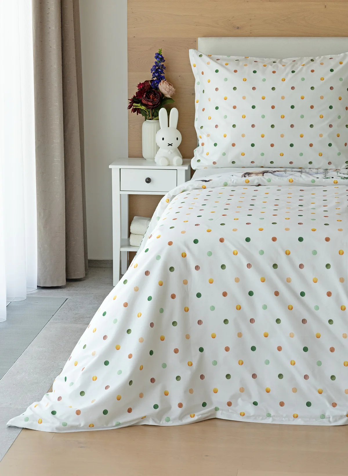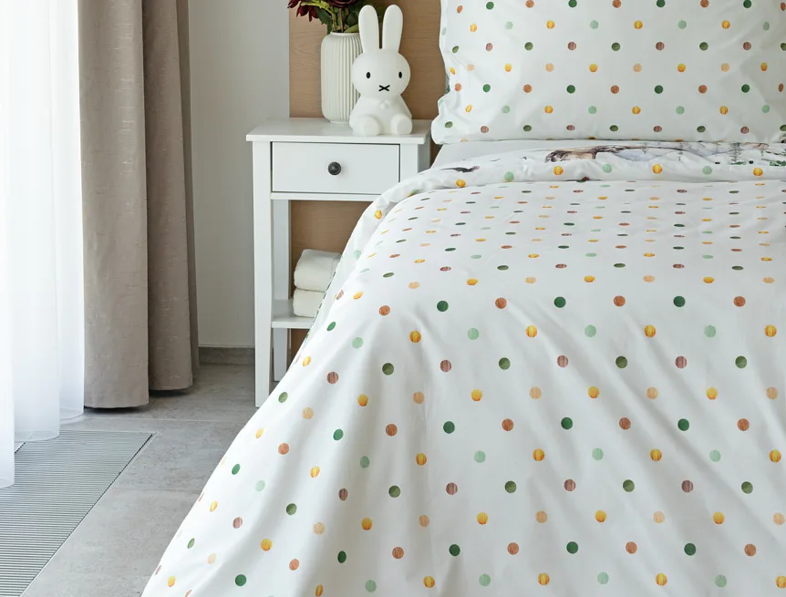 S povlečením Wild si můžete užít hravé stlaní díky oblíbenému oboustrannému provedení, kdy spodní stranu tvoří motiv barevně sladěných puntíků na bílém podkladu. Povlečení je opatřeno praktickým zipovým uzávěrem.