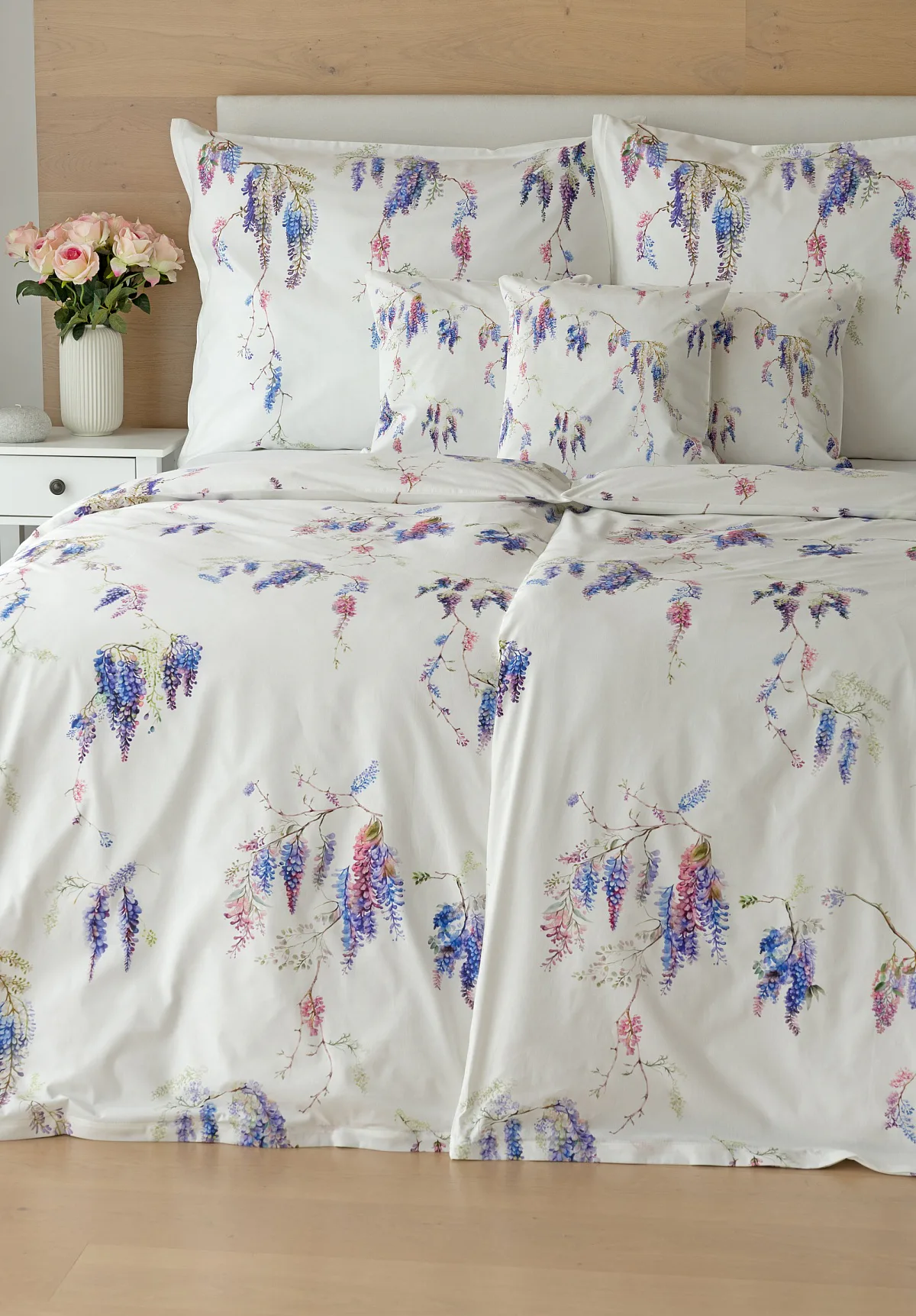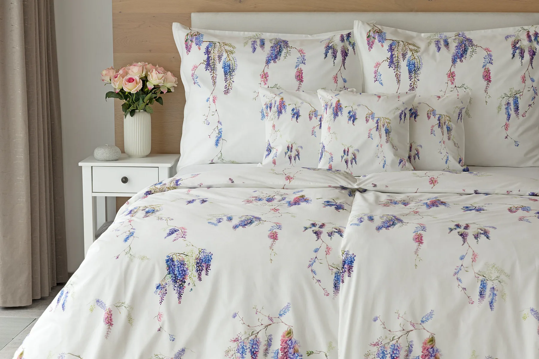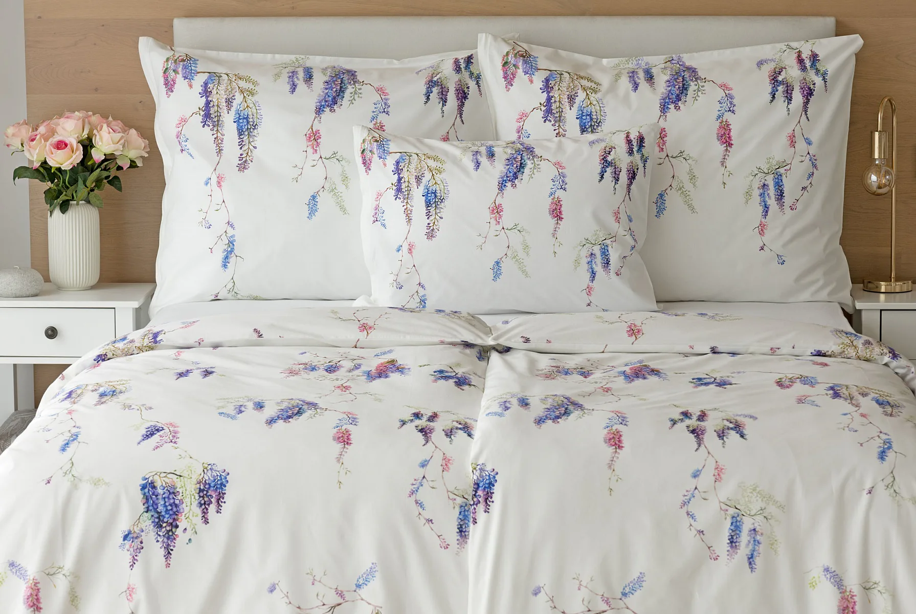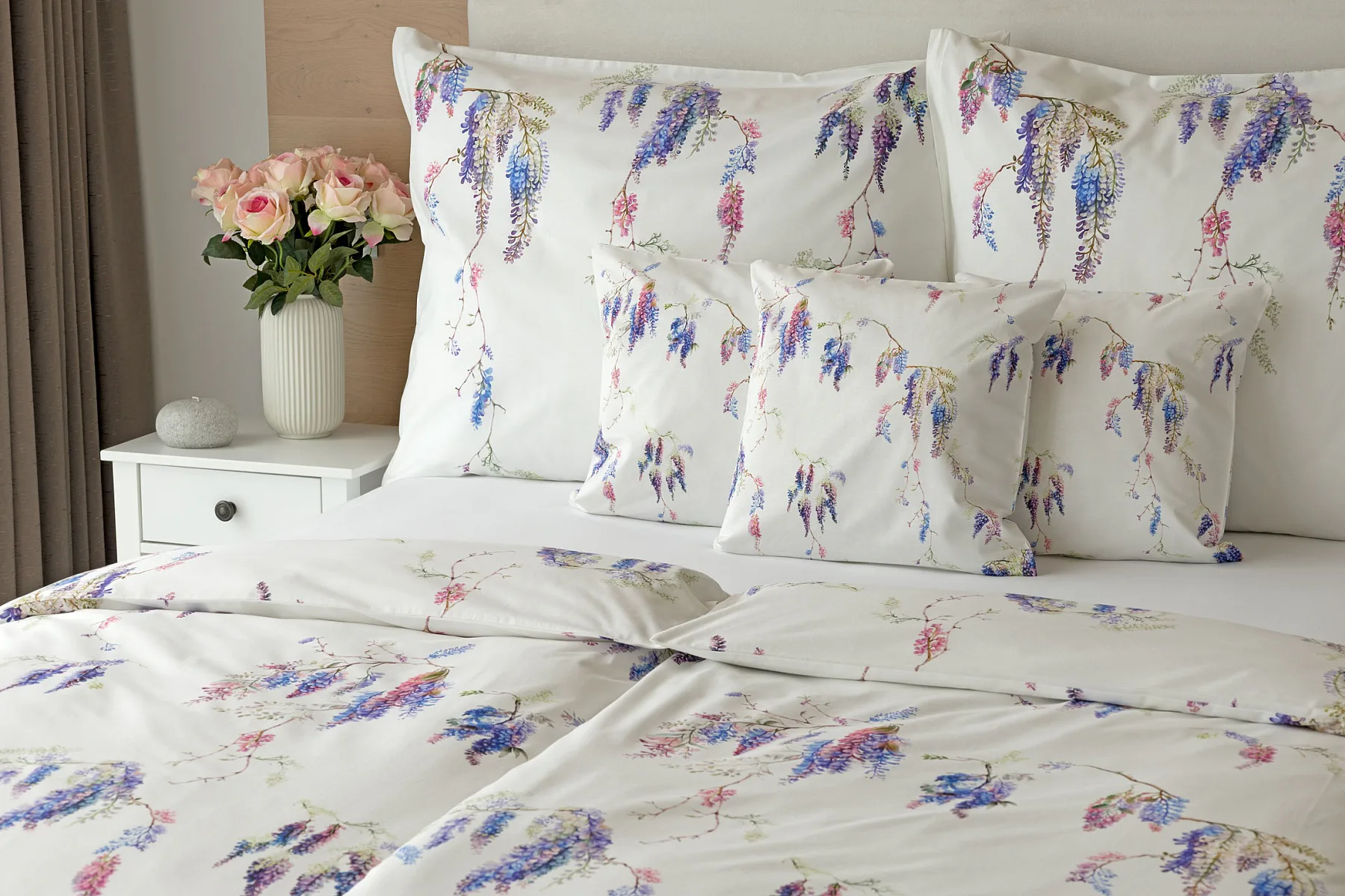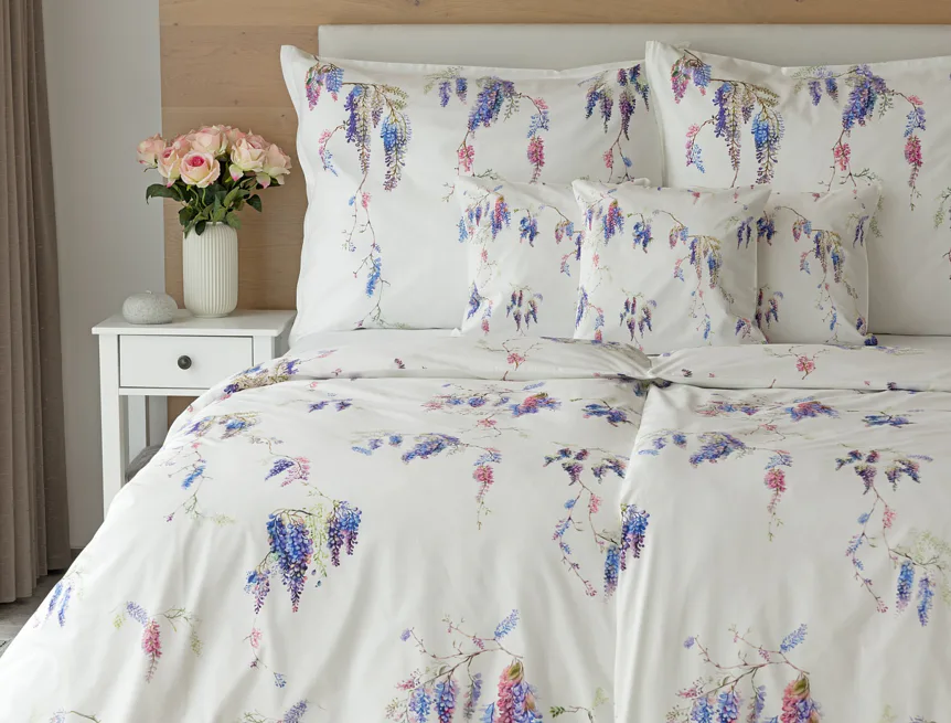 Bavlněné povlečení Wisteria s něžným květinovým motivem vás nadchne svou jednoduchou krásou. Fialovo-růžové květy vistárie vynikají na sněhově bílém podkladu, který podtrhuje čistotu a eleganci tohoto romantického vzoru.