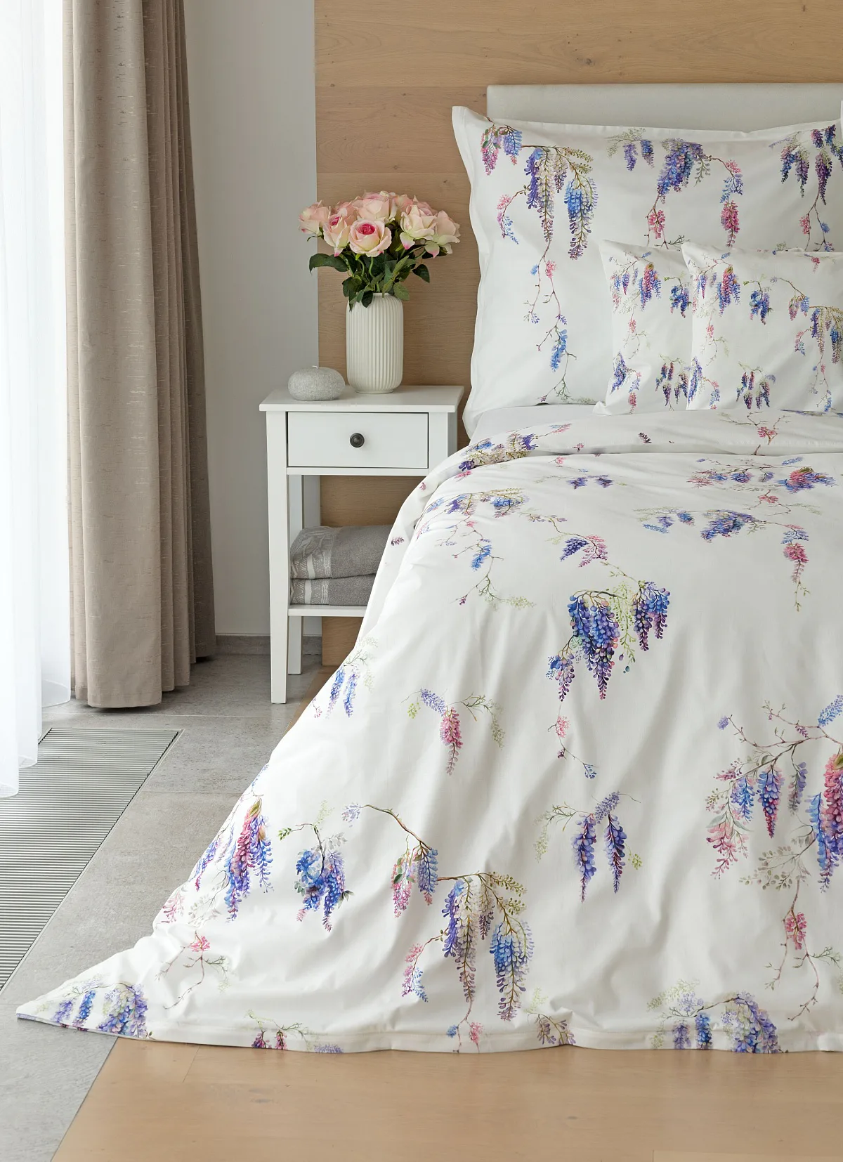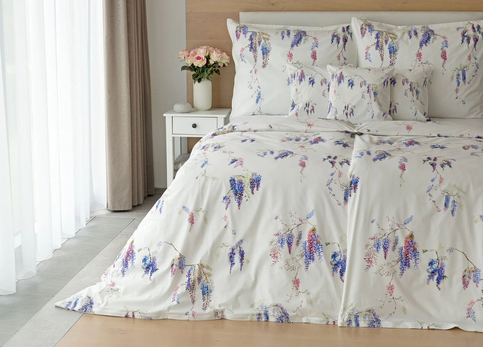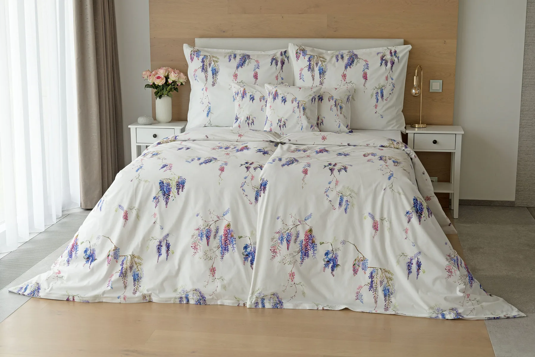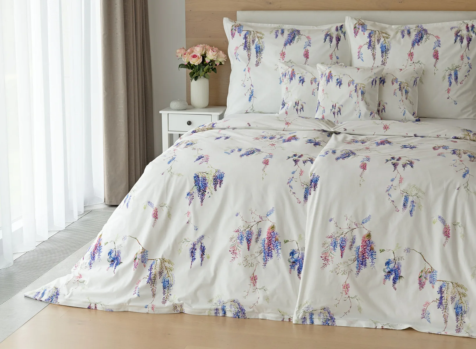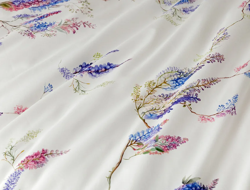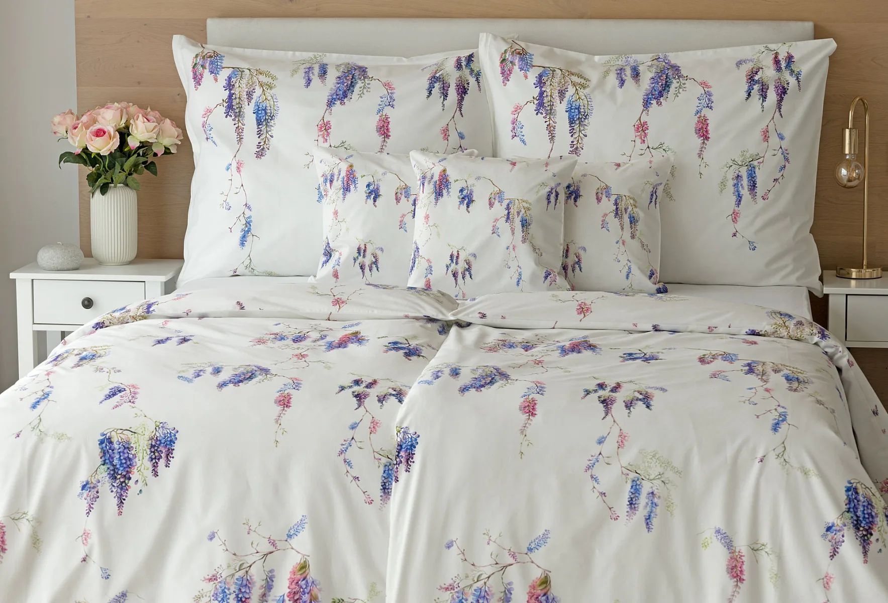 Bavlněné povlečení Wisteria s něžným květinovým motivem vás nadchne svou jednoduchou krásou. Fialovo-růžové květy vistárie vynikají na sněhově bílém podkladu, který podtrhuje čistotu a eleganci tohoto romantického vzoru.