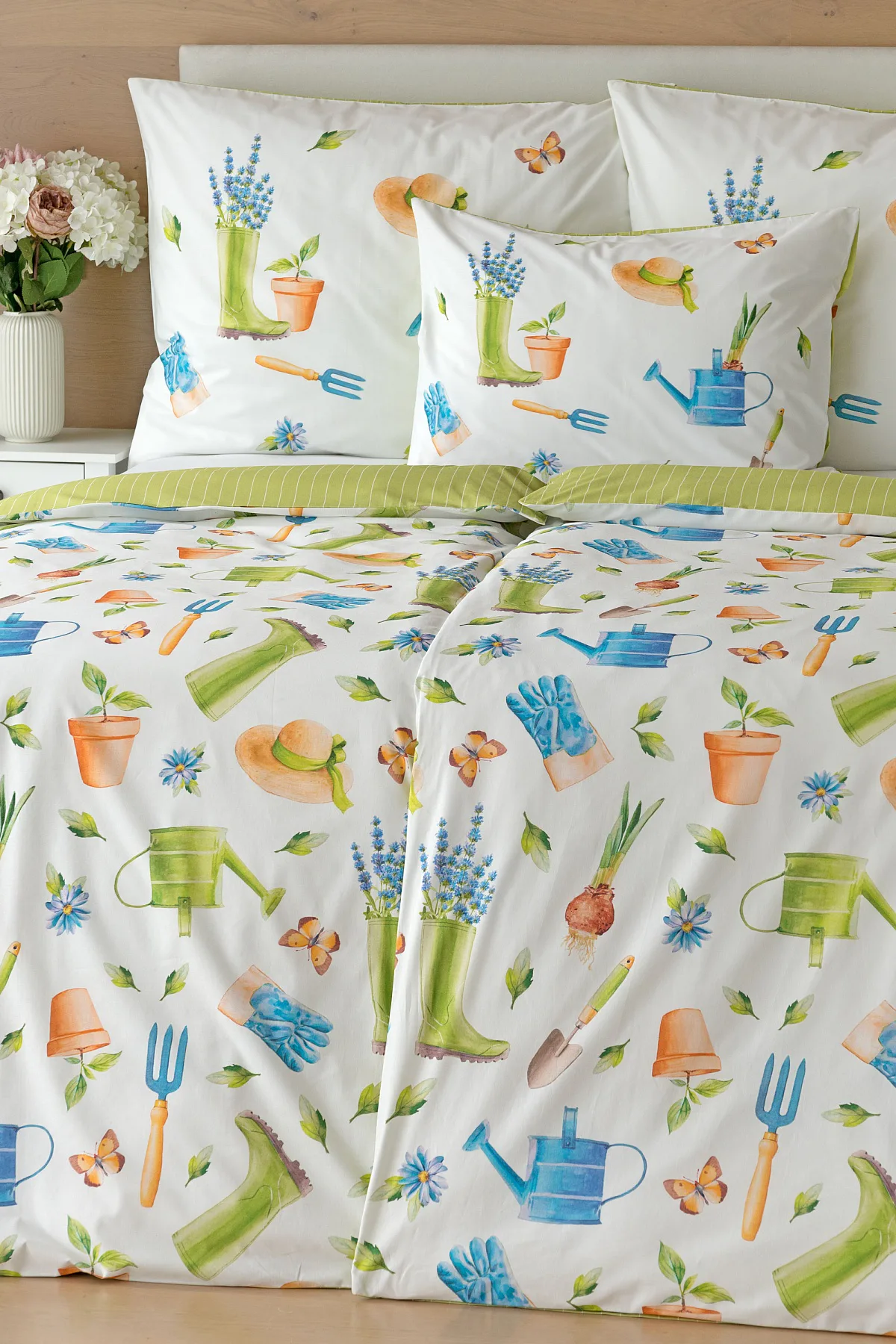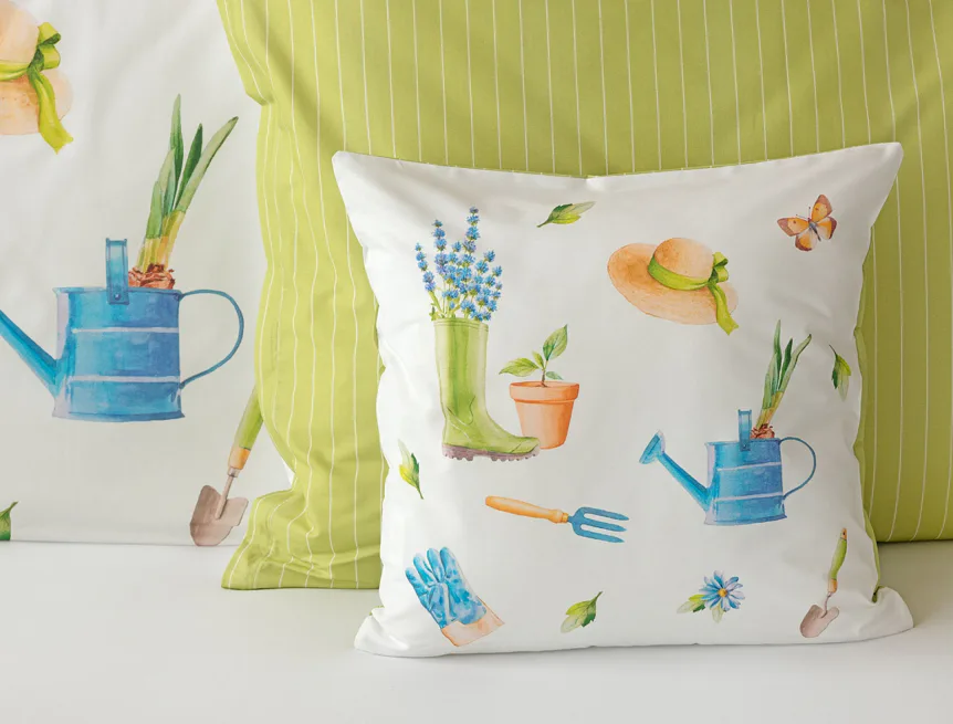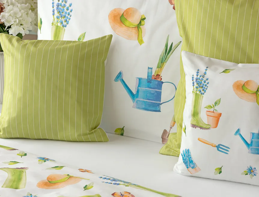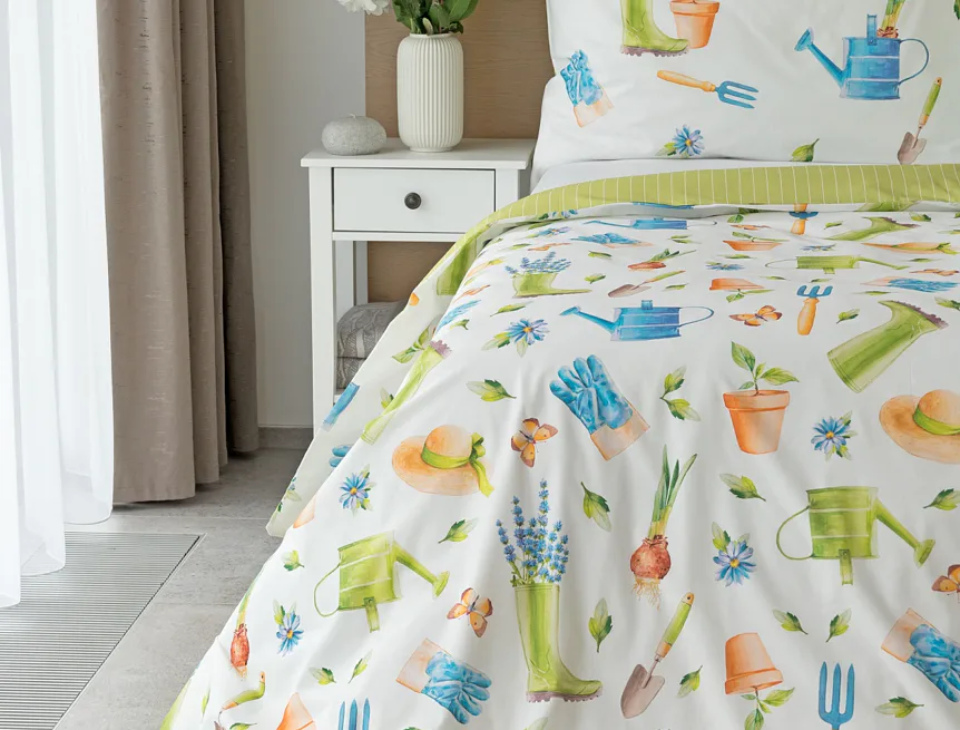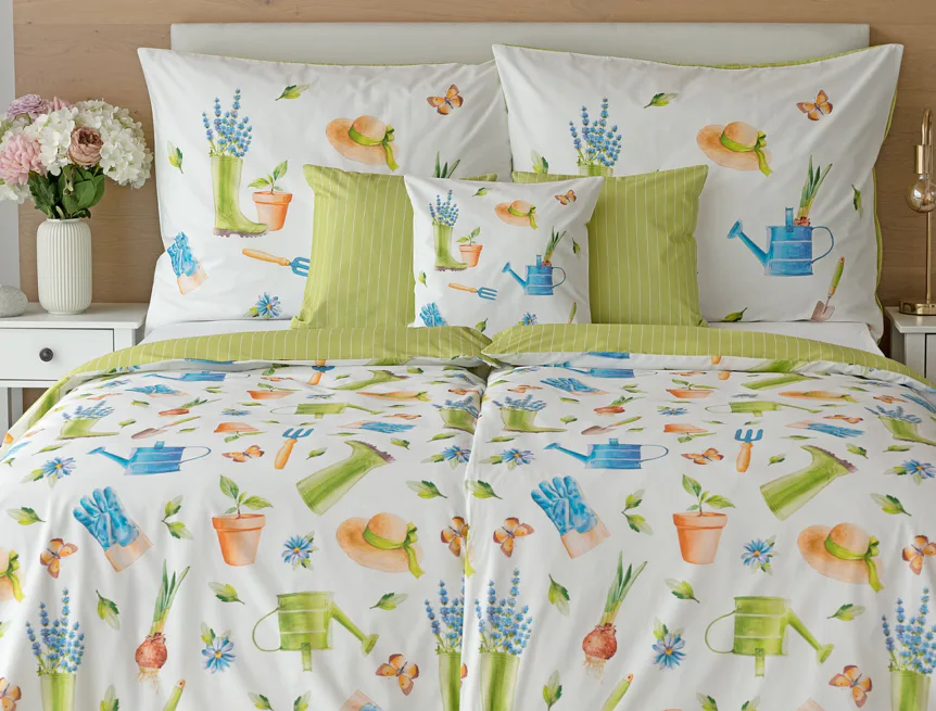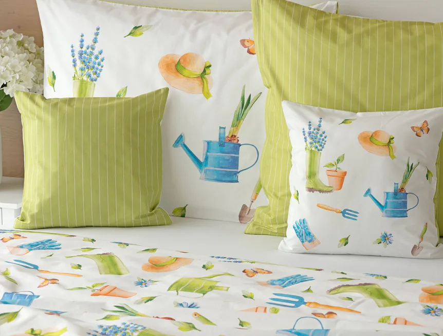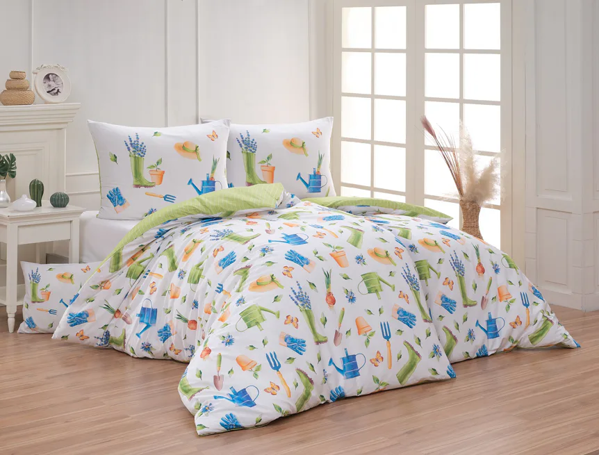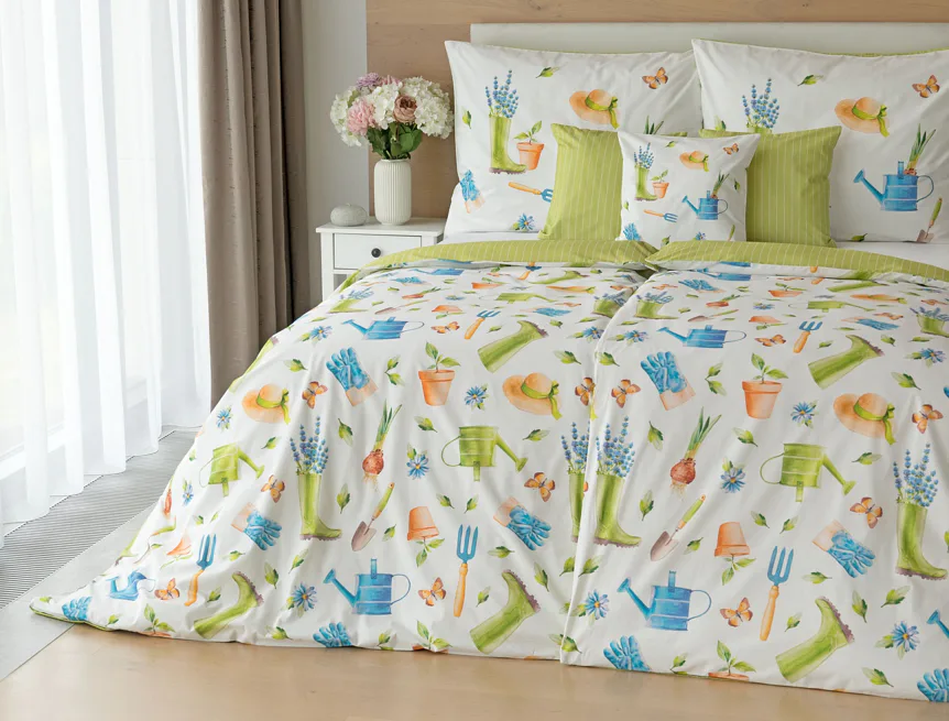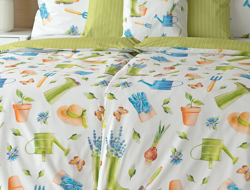 Veselý pestrobarevný vzor povlečení Zahrádka potěší všechny milovníky pěstitelských činností. Hravě poskládané zahradní náčiní na vrchní straně povlečení doplňuje jednobarevné zelené provedení spodní strany protnuté jemným bílým proužkem. Díky tomuto oblíbenému oboustrannému provedení můžete při stlaní každý den experimentovat. A protože je motiv opravdu veselý a hravý, najde uplatnění i v dětském pokojíku.