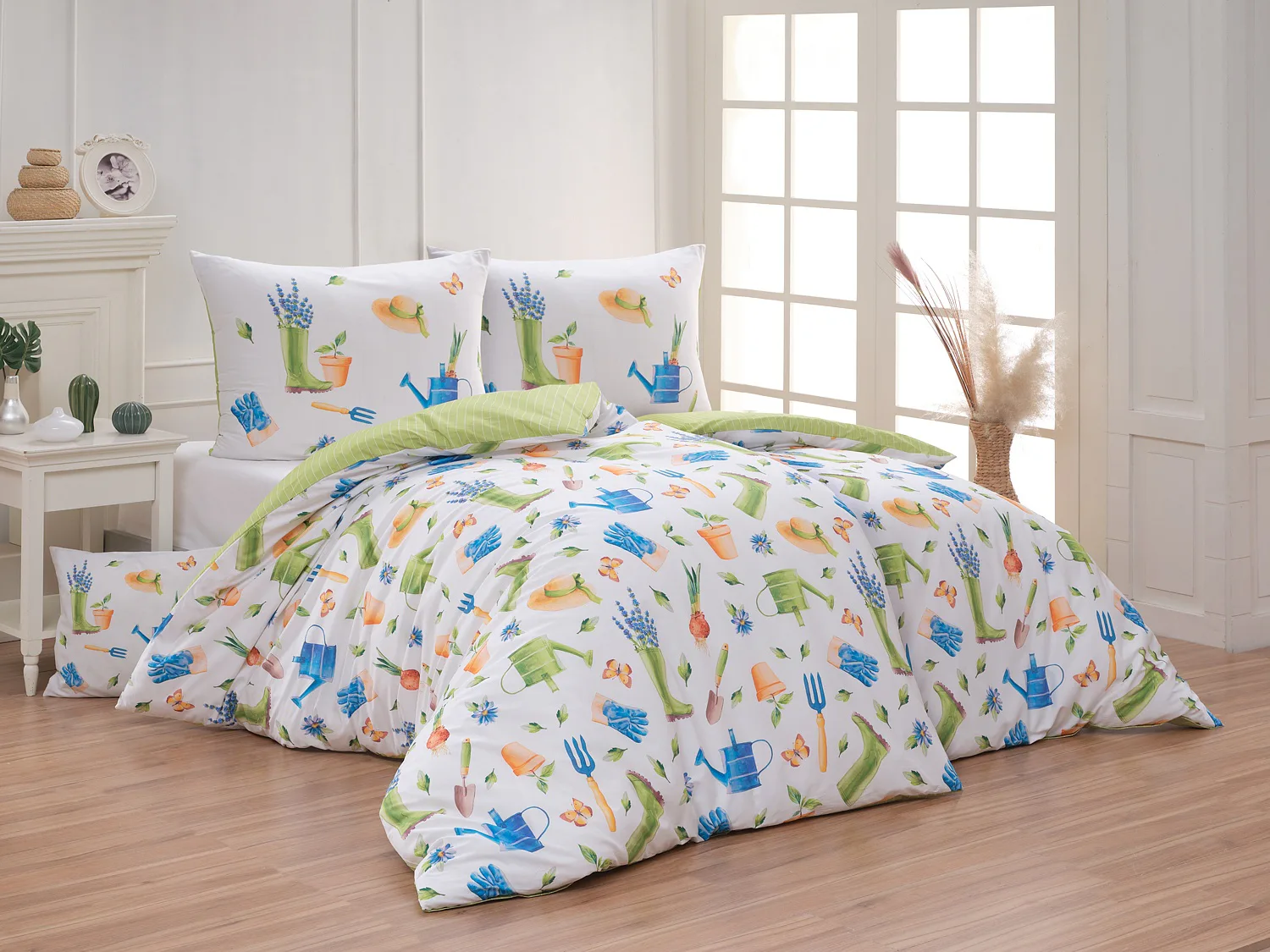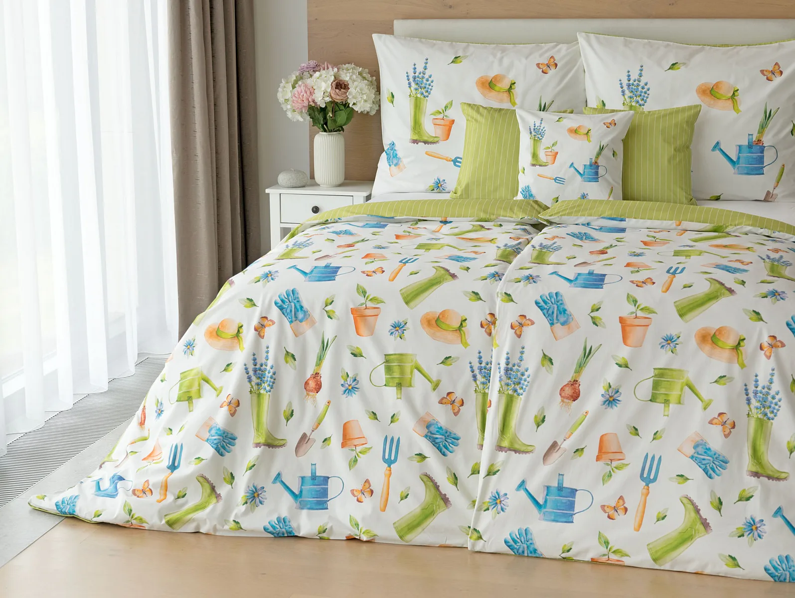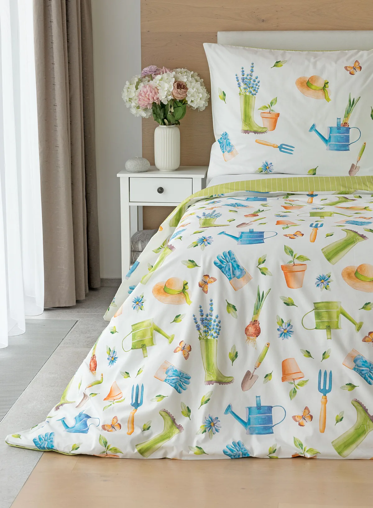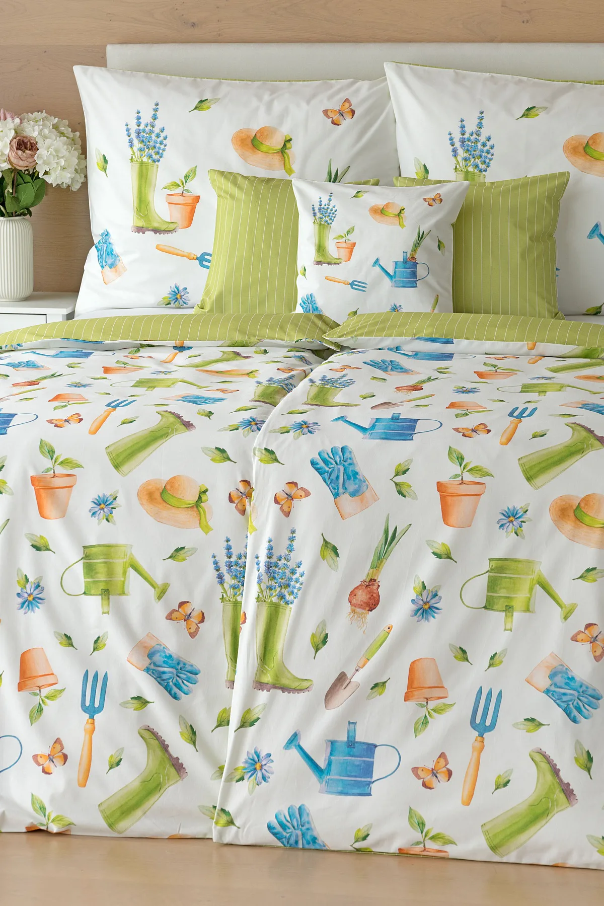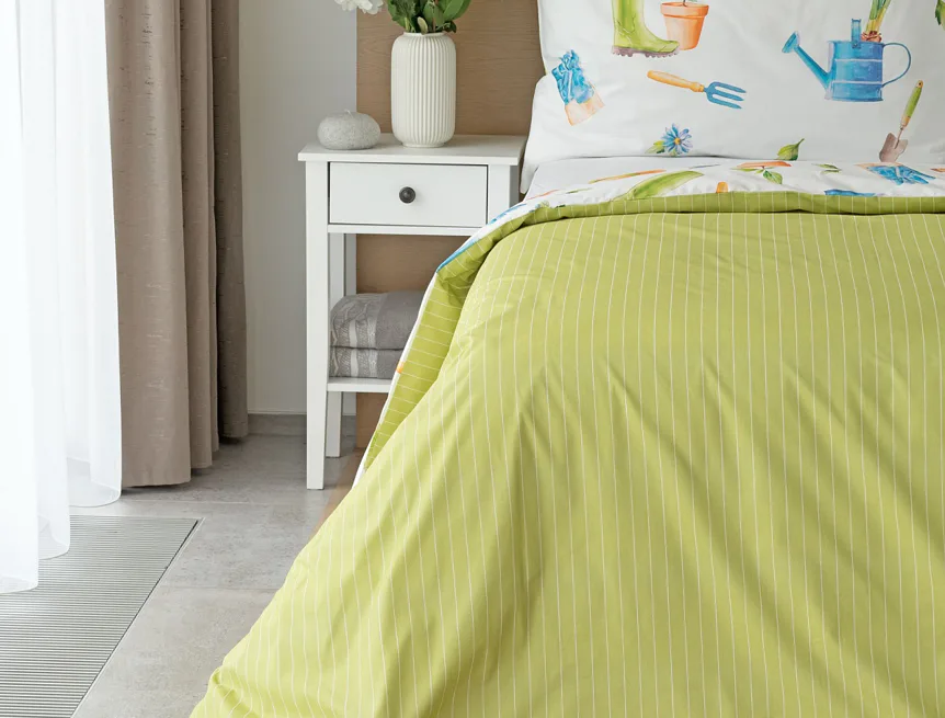 Veselý pestrobarevný vzor povlečení Zahrádka potěší všechny milovníky pěstitelských činností. Hravě poskládané zahradní náčiní na vrchní straně povlečení doplňuje jednobarevné zelené provedení spodní strany protnuté jemným bílým proužkem. Díky tomuto oblíbenému oboustrannému provedení můžete při stlaní každý den experimentovat. A protože je motiv opravdu veselý a hravý, najde uplatnění i v dětském pokojíku.
