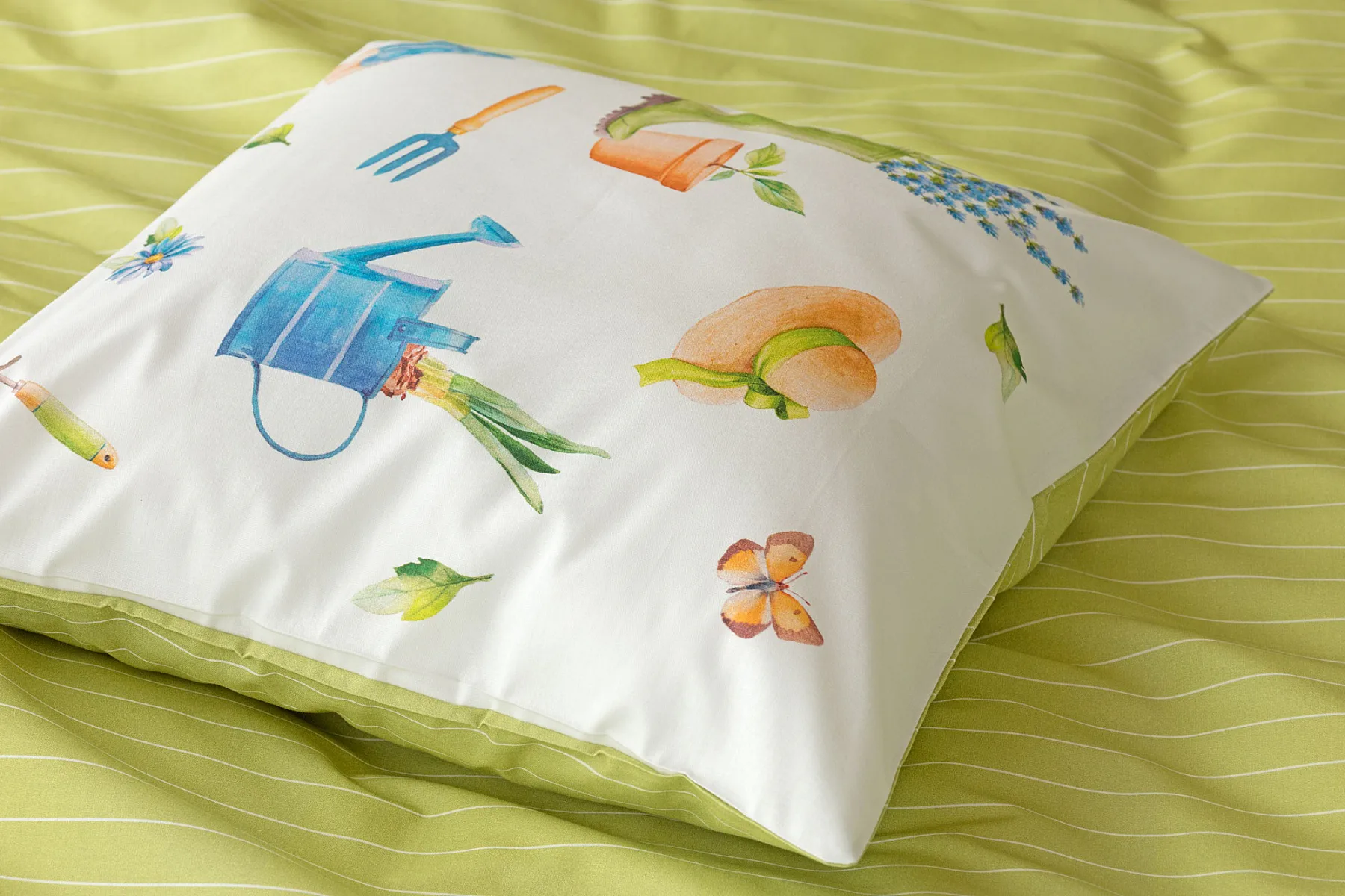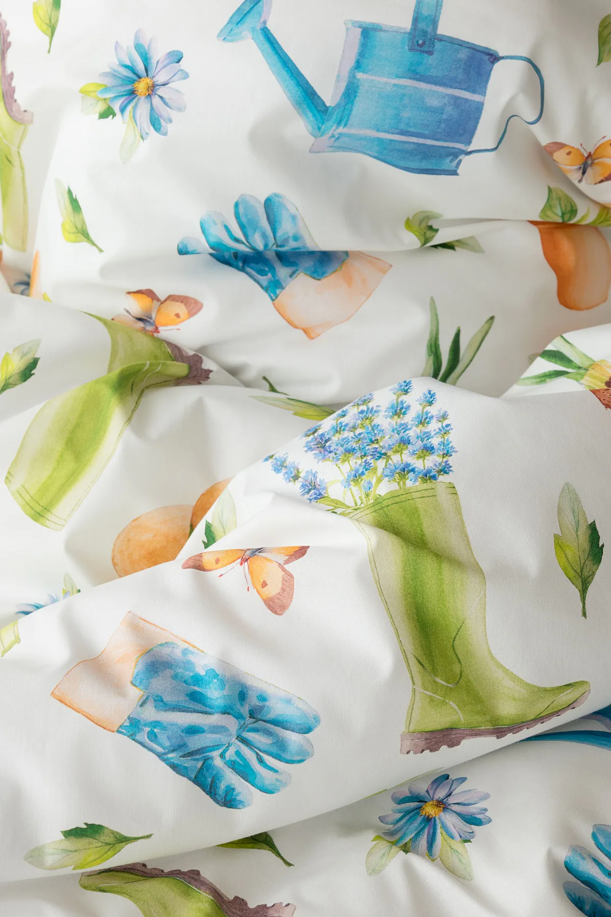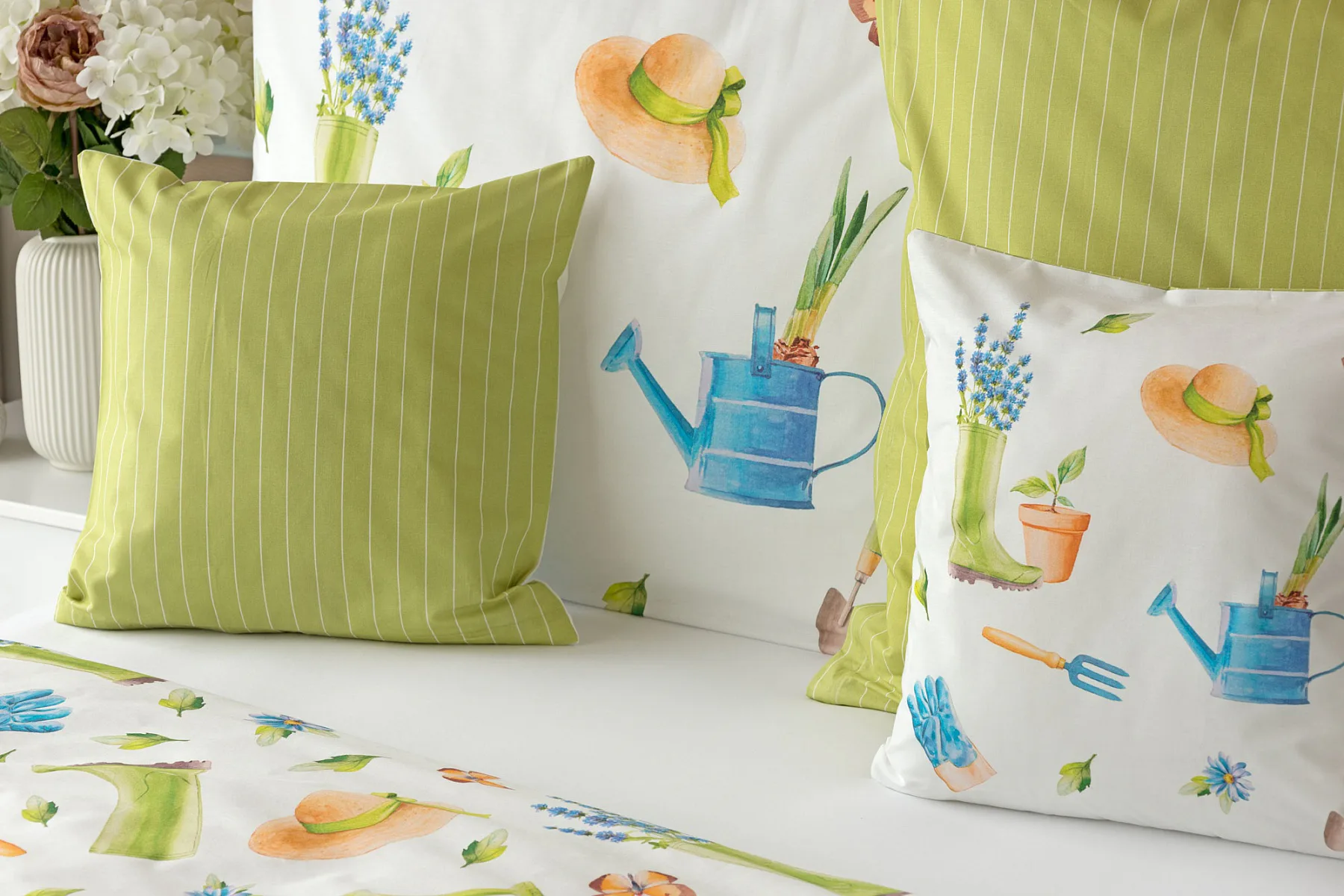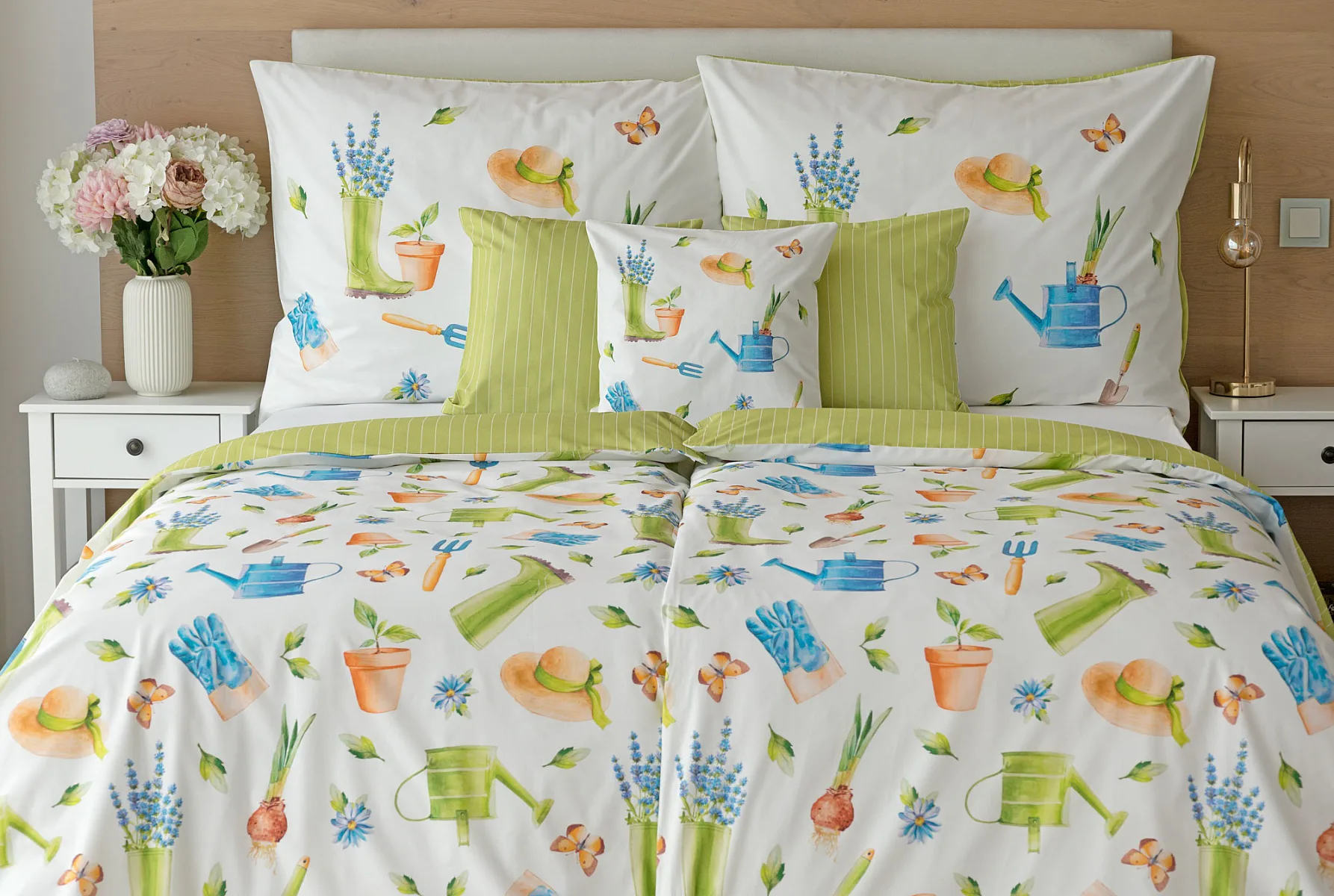 Veselý pestrobarevný vzor povlečení Zahrádka potěší všechny milovníky pěstitelských činností. Hravě poskládané zahradní náčiní na vrchní straně povlečení doplňuje jednobarevné zelené provedení spodní strany protnuté jemným bílým proužkem. Díky tomuto oblíbenému oboustrannému provedení můžete při stlaní každý den experimentovat. A protože je motiv opravdu veselý a hravý, najde uplatnění i v dětském pokojíku.