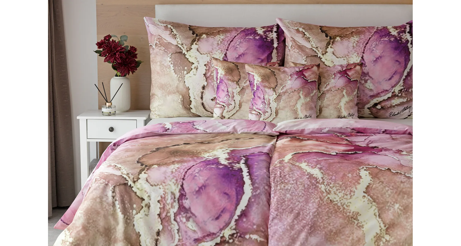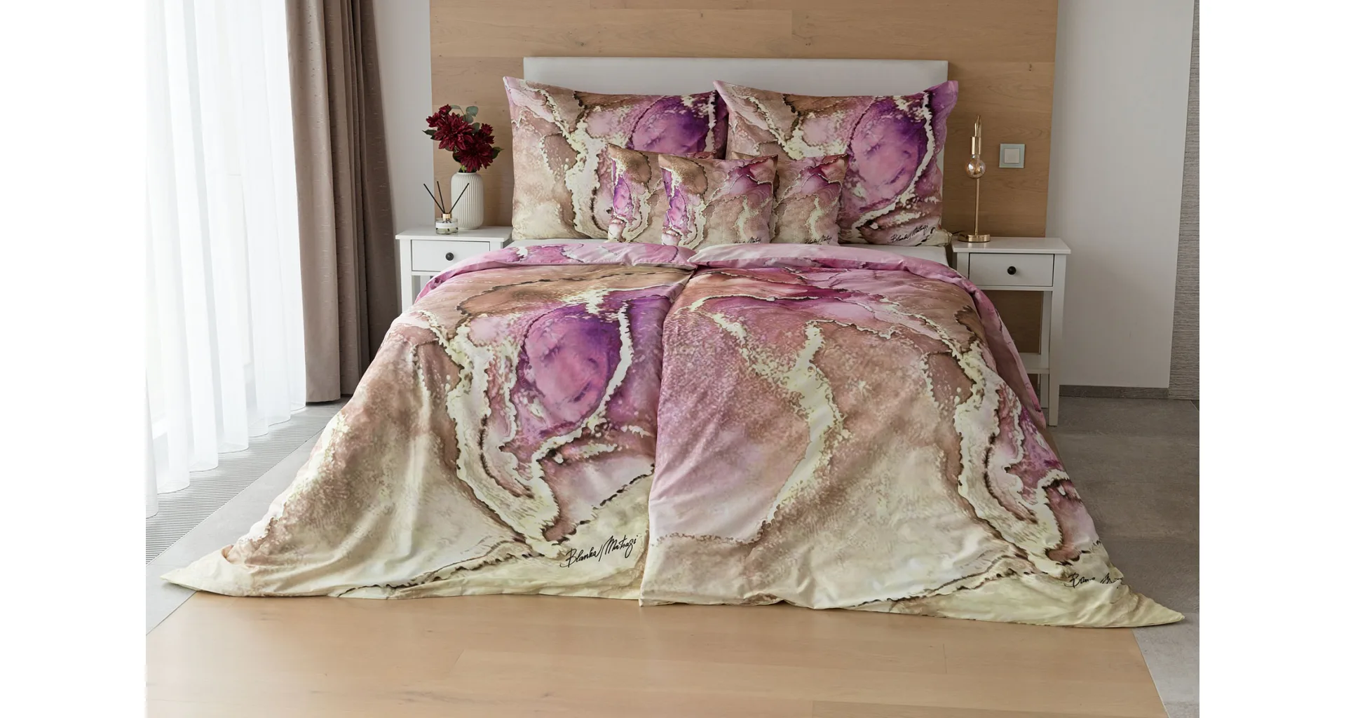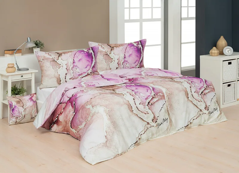 The eye-catching abstract pattern of the Pramen bedding directly radiates the energetic spirit of the renowned designer. The author's digitally processed motif combines warm shades of natural beige with a bright palette of pink-purple tones. Dress up your bedroom in the style of refined elegance.. Sophisticated details make this luxury bedding a distinctive work of art.
