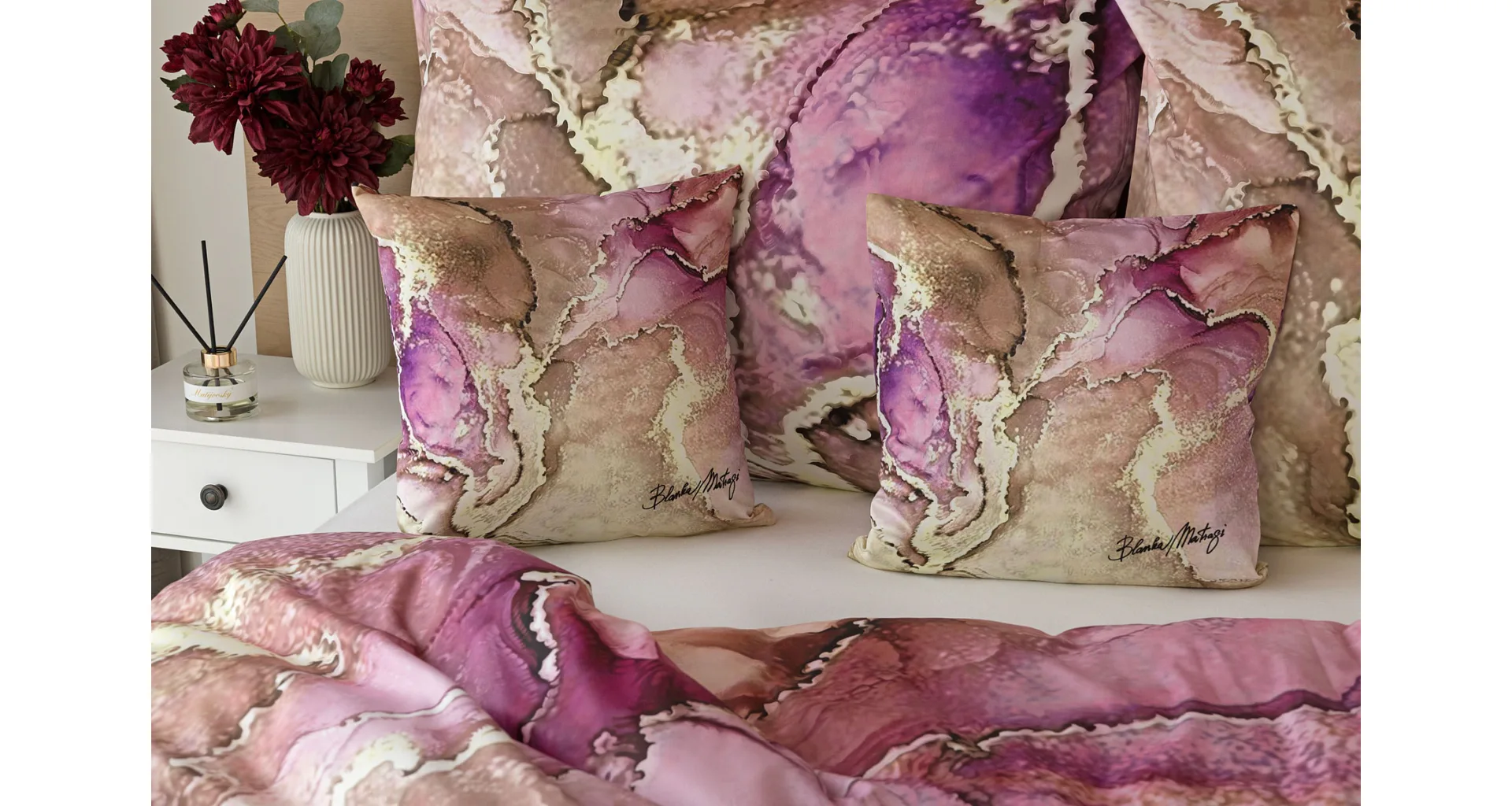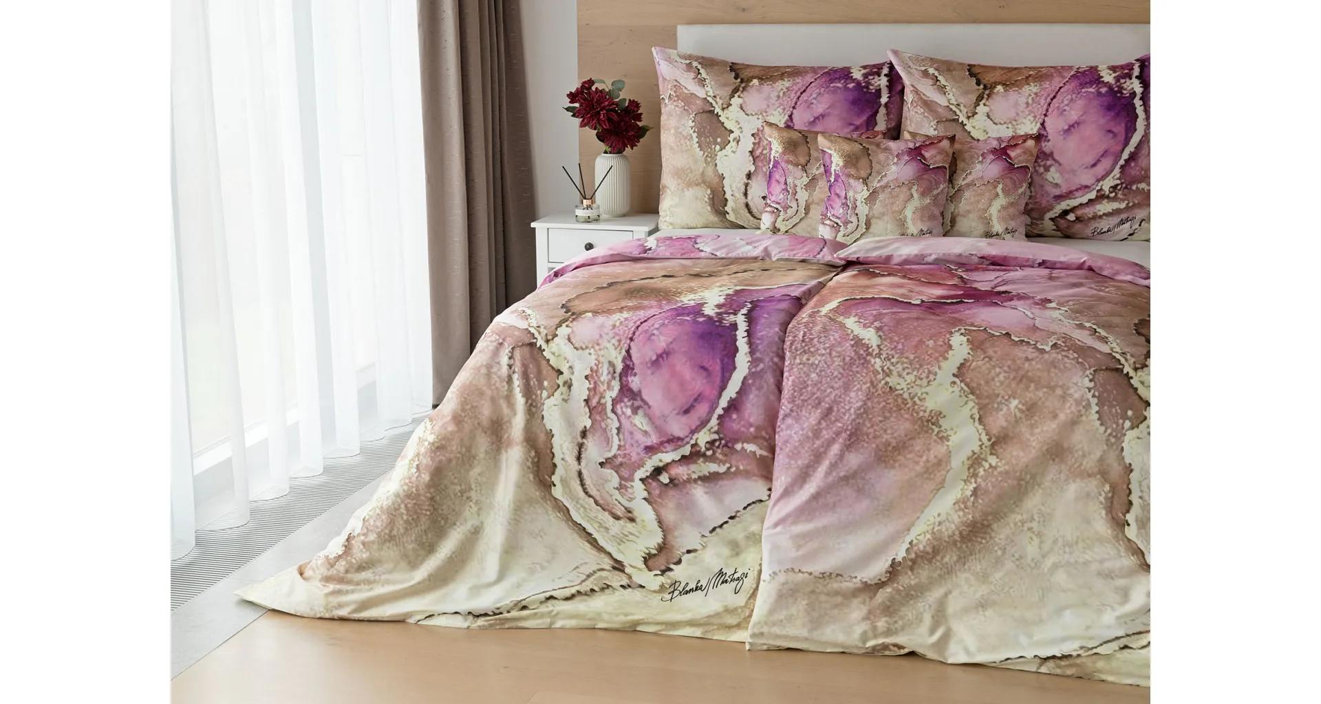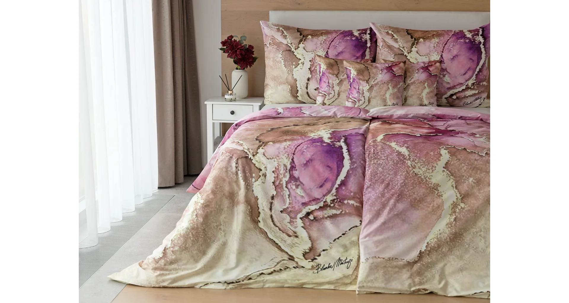 The bed linen is made from luxury mako cotton sateen. It is printed with modern digital print, which ensures that the details are made exactly according to the author´s intention. The bed linen is also printed with Blanka Matragi´s signature – it is placed on the blanket cover, pillowcase and on the small pillowcase. The motive is on both sides of the bed linen, as you can see in the photo. It is also equipped with a zipper closure for easier manipulation.