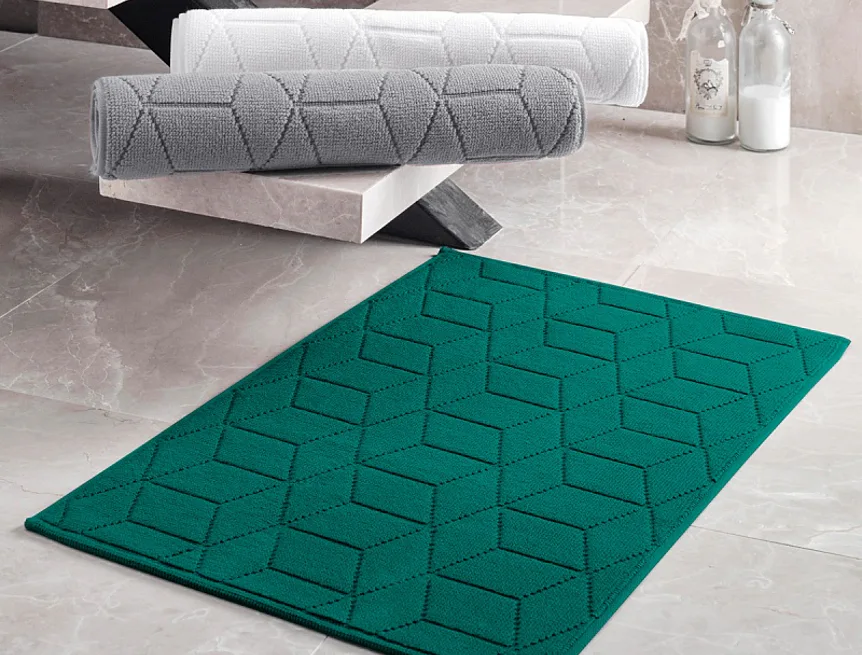 Nepostradatelný doplněk každé koupelny v provedení výběrové bavlny s vysokou gramáží, která zajistí nezaměnitelný komfort. Jednoduchý vytkávaný geometrický vzor na koupelnové předložce v kombinaci s dokonalým odstínem petrolejové barvy zútulní vaši koupelnu.