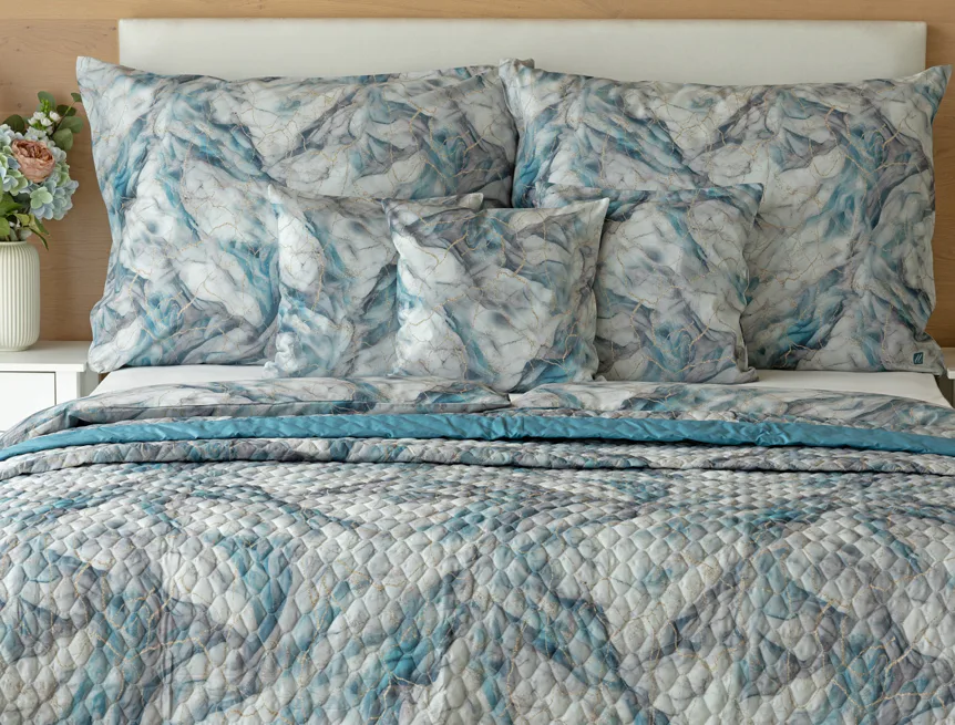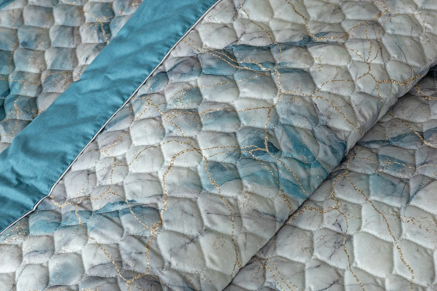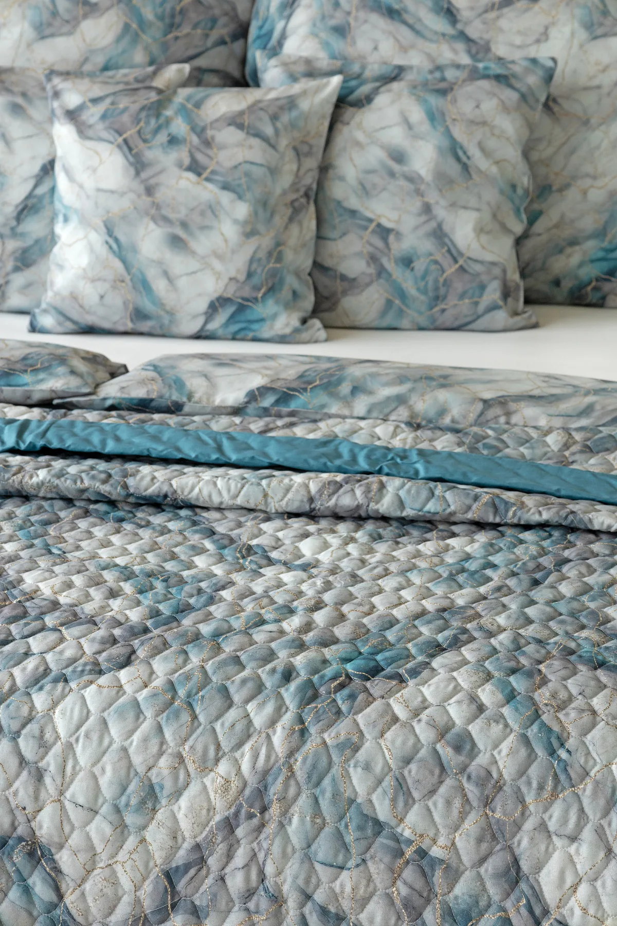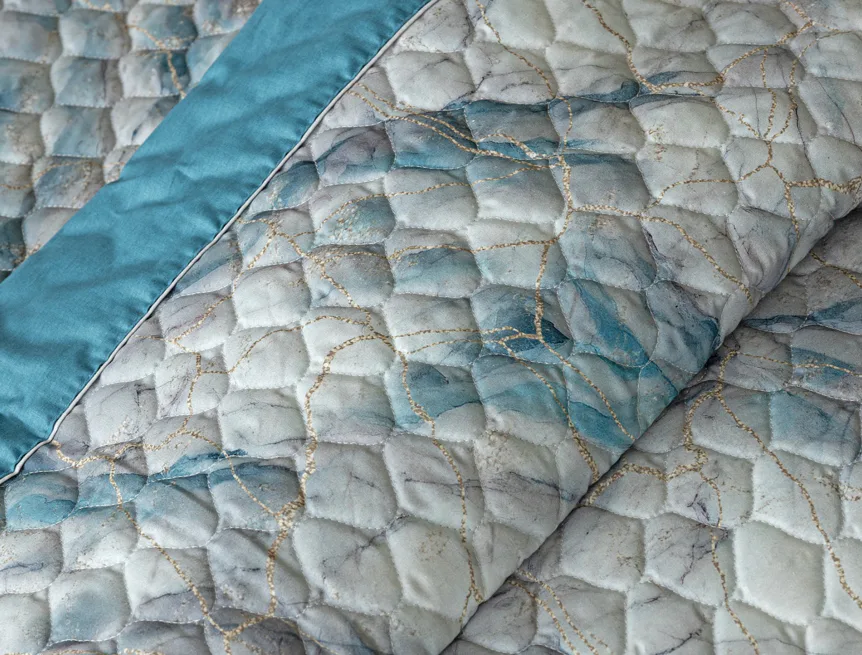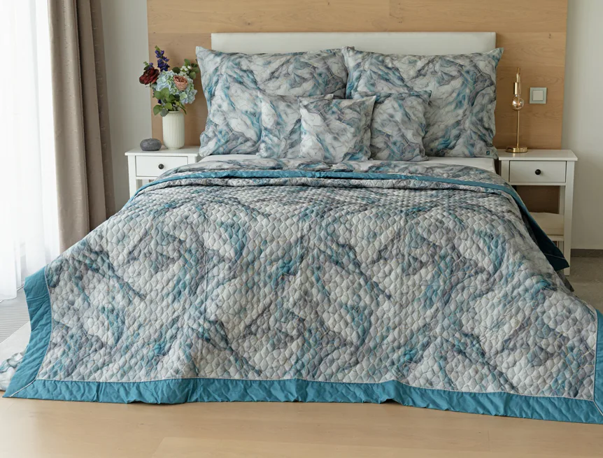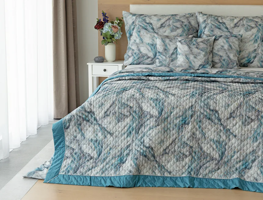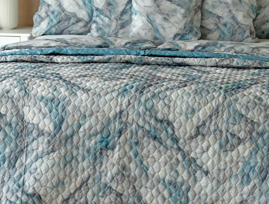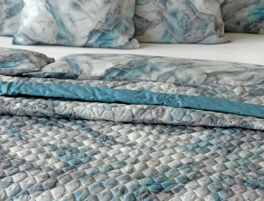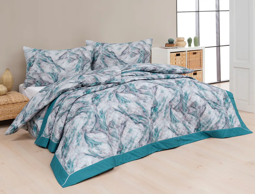 Barevné provedení: Elegantní mramorový vzor, který je z obou stran přehozu stejný. Okraje zdobí petrolejové lemování doplněné na vrchní straně světle šedou paspulí.