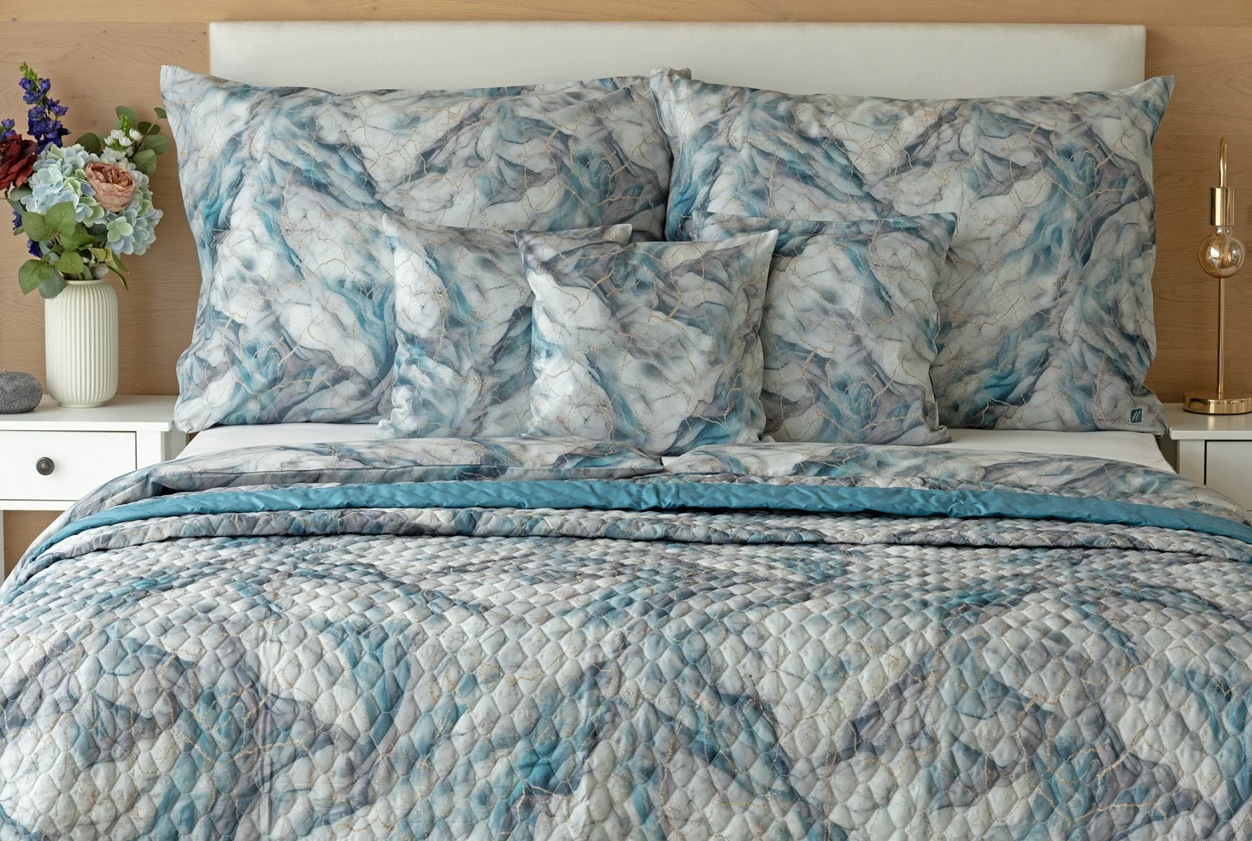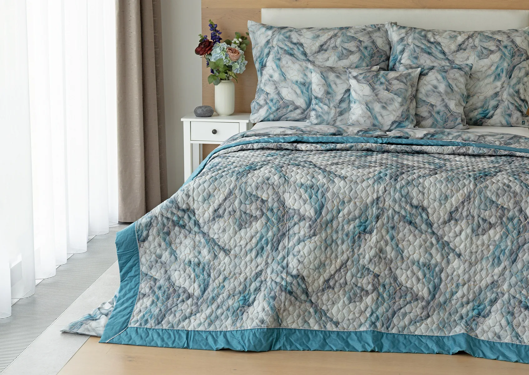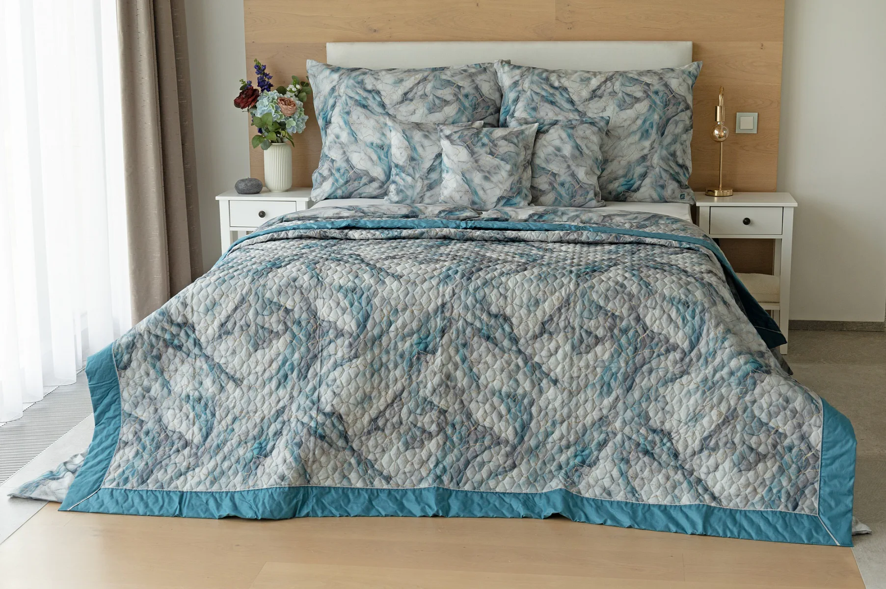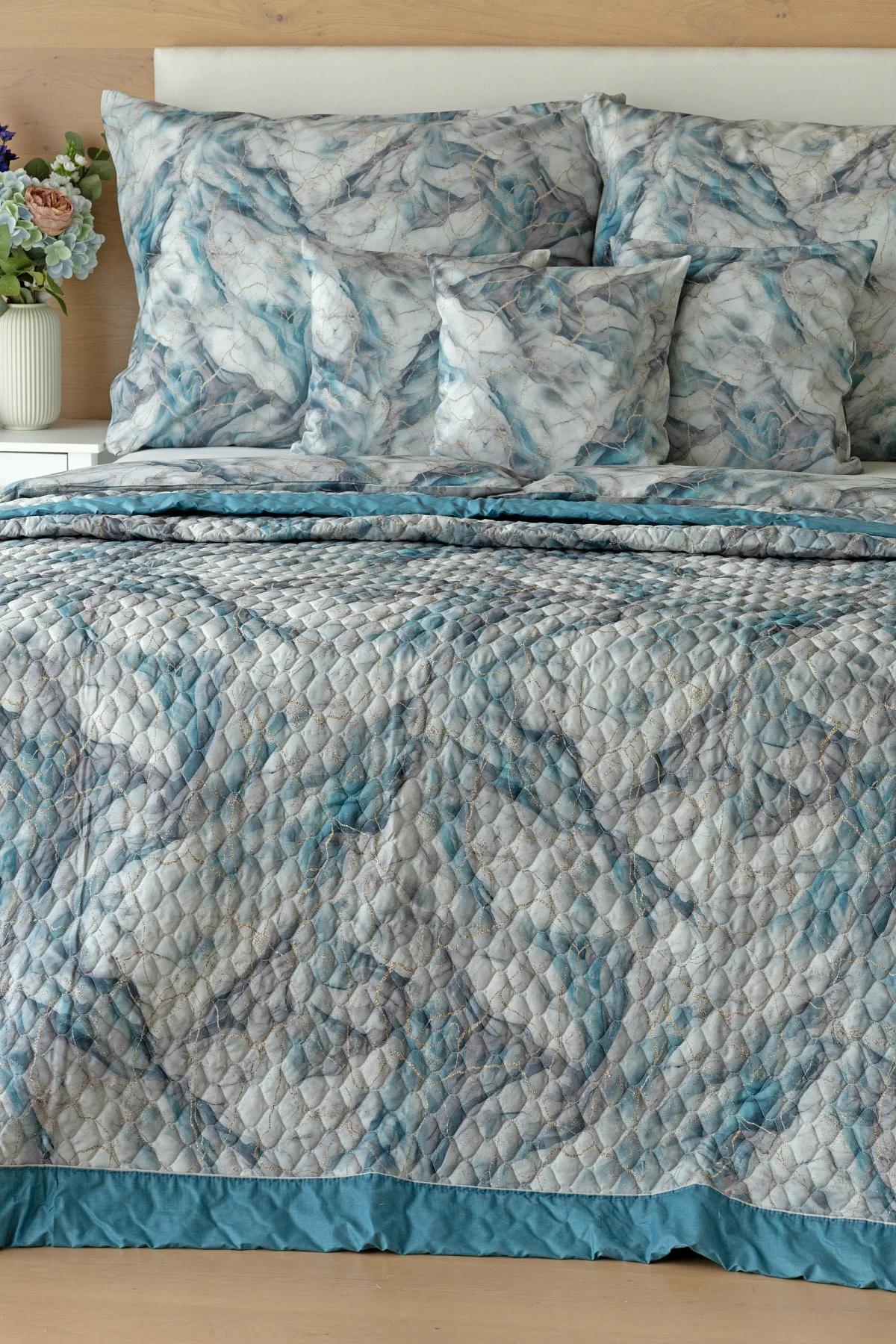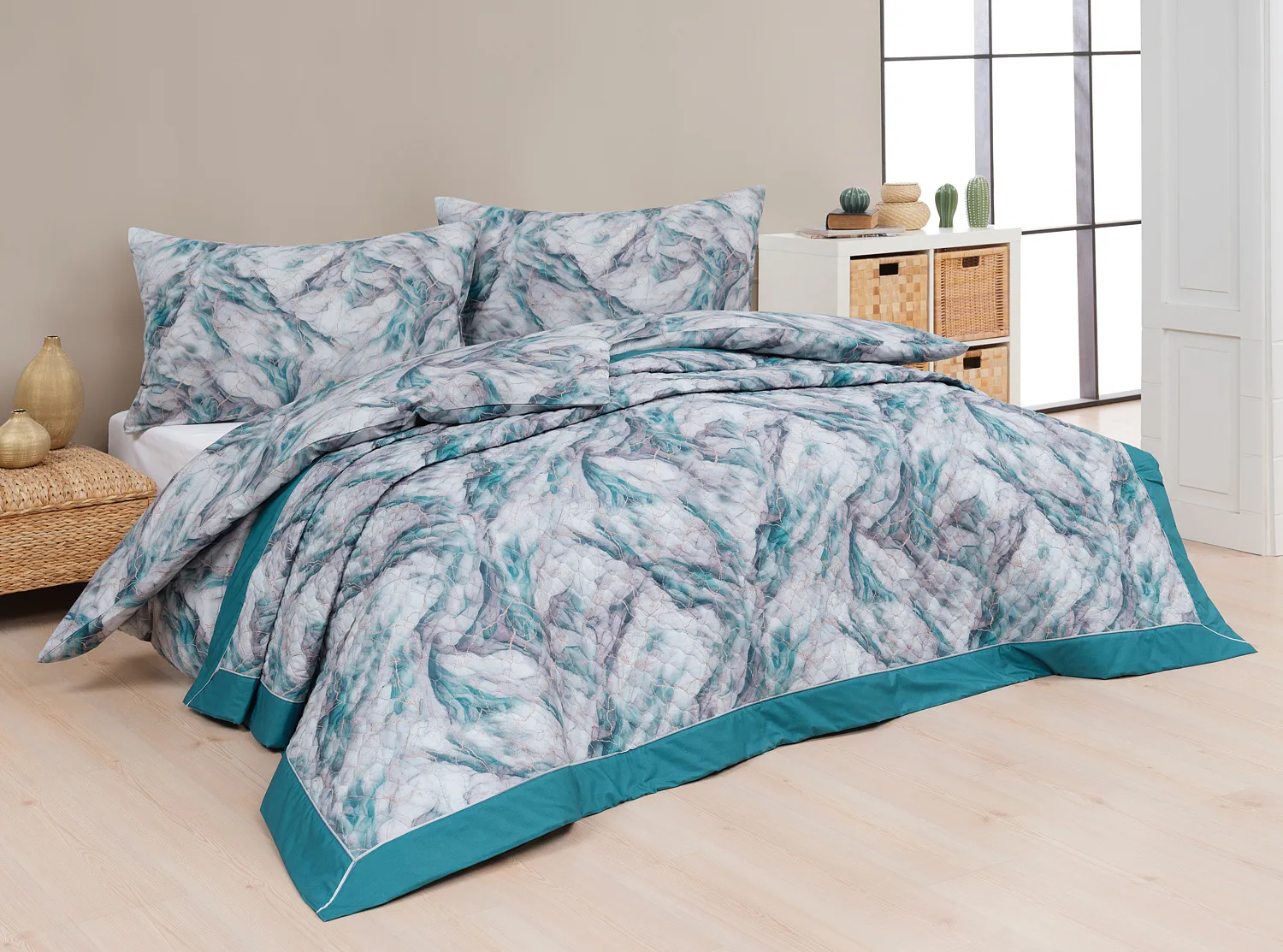 Barevné provedení: Elegantní mramorový vzor, který je z obou stran přehozu stejný. Okraje zdobí petrolejové lemování doplněné na vrchní straně světle šedou paspulí.