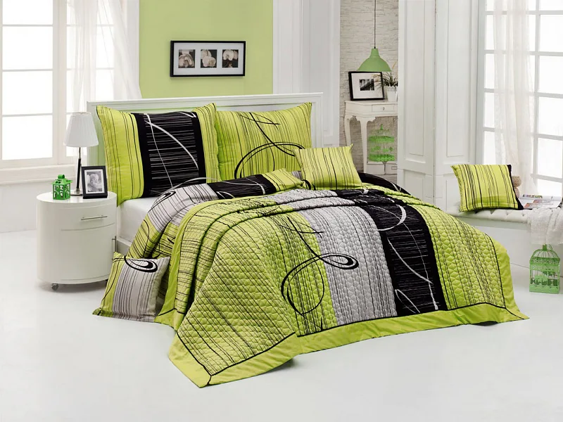 Přehoz ETERNITY GREEN je jedinečný, estetický a praktický doplněk, se kterým bude Vaše postel vždy dokonale ustlaná. Jako výplň je použito vrstvené duté vlákno, povrchový materiál je 100% bavlněná látka, ve stejném dezénu jako ložní povlečení. Po celé ploše je aplikováno ozdobné prošití, tak aby se zajistila stabilita výplně a současně podtrhl celkový vzhled přehozu.