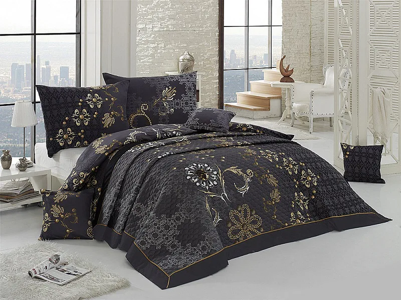 Přehoz GOLD je jedinečný, estetický a praktický doplněk, se kterým bude Vaše postel vždy dokonale ustlaná. Jako výplň je použito vrstvené duté vlákno, povrchový materiál je 100 % bavlněná látka, ve stejném dezénu jako ložní povlečení. Po celé ploše je aplikováno ozdobné prošití, tak aby se zajistila stabilita výplně a současně podtrhl celkový vzhled přehozu. Ozdobná paspule přehozu je provedena v ladící šedé barvě.