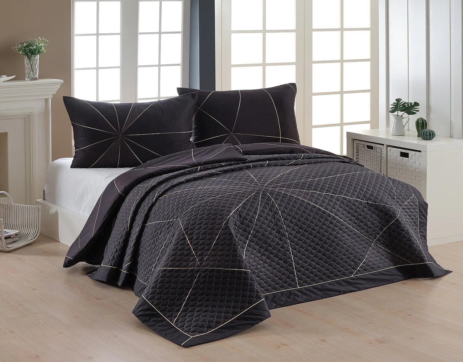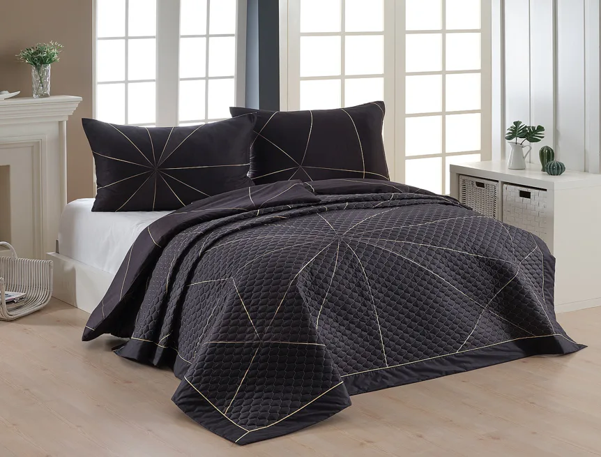 Barevné provedení: Poutavý geometrický vzor, který je z obou stran přehozu stejný. Okraje zdobí černé lemování doplněné na vrchní straně zlatavou paspulí.