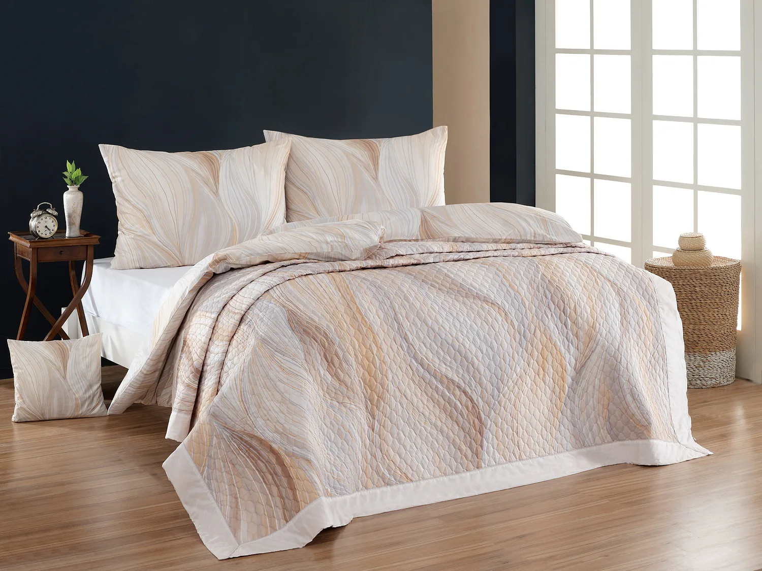 Přehoz Infinitum Beige je jedinečný estetický a praktický doplněk, se kterým bude vaše postel vždy dokonale ustlaná. Jako výplň je použito vrstvené duté vlákno se sníženou gramáží. Povrchový materiál tvoří 100% bavlněná látka ve stejném dezénu jako ložní povlečení. Po celé ploše je aplikováno ozdobné prošití, aby se zajistila stabilita výplně a současně podtrhl celkový vzhled přehozu.