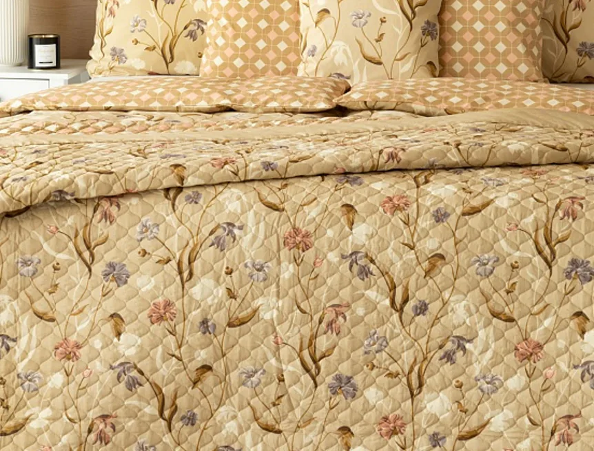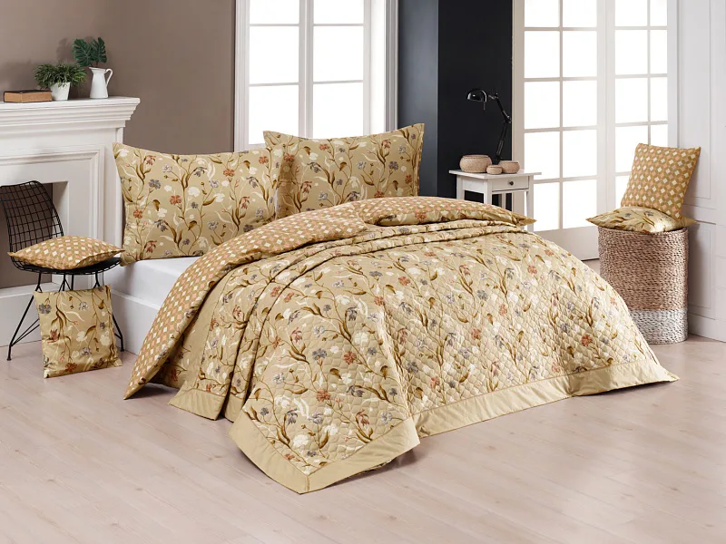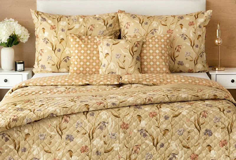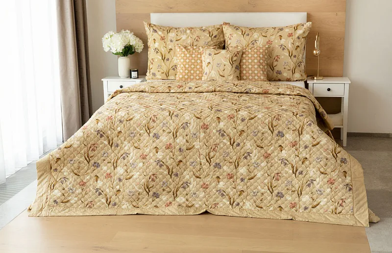 Přehoz Joanna je jedinečný estetický a praktický doplněk, se kterým bude vaše postel vždy dokonale ustlaná. Jako výplň je použito vrstvené duté vlákno se sníženou gramáží. Povrchový materiál tvoří 100% bavlněná látka ve stejném dezénu jako ložní povlečení. Po celé ploše je aplikováno ozdobné prošití, aby se zajistila stabilita výplně a současně podtrhl celkový vzhled přehozu.
