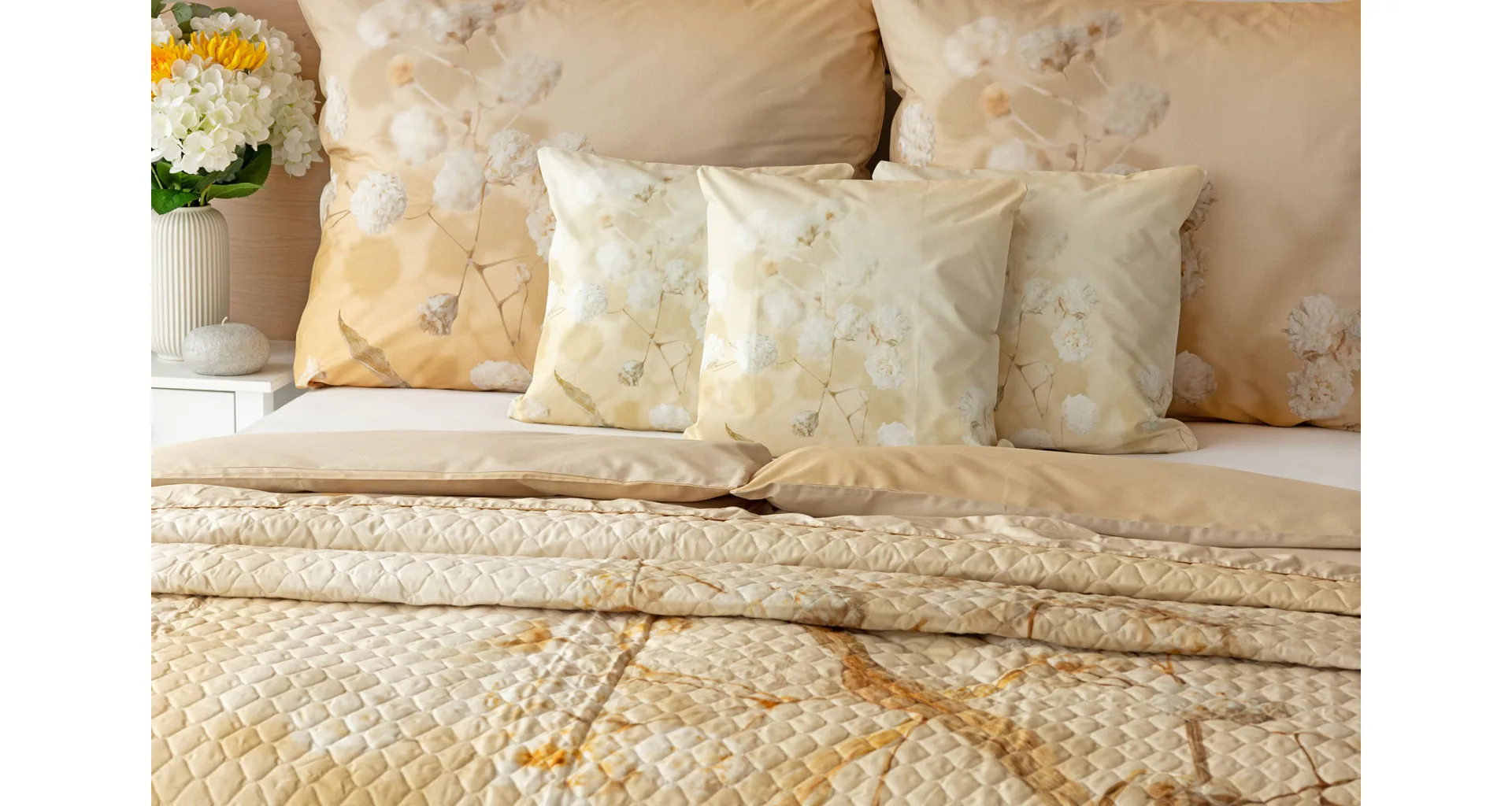 Barevné provedení: Jemný květinový vzor, který je z obou stran přehozu stejný. Okraje zdobí barevně sladěné krémové lemování doplněné na vrchní straně světle hnědou paspulí.