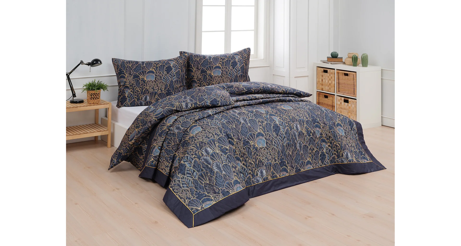 Barevné provedení: Elegantní vějířový vzor, který je z obou stran přehozu stejný. Okraje zdobí tmavě modré lemování doplněné na vrchní straně pískově žlutou paspulí.
