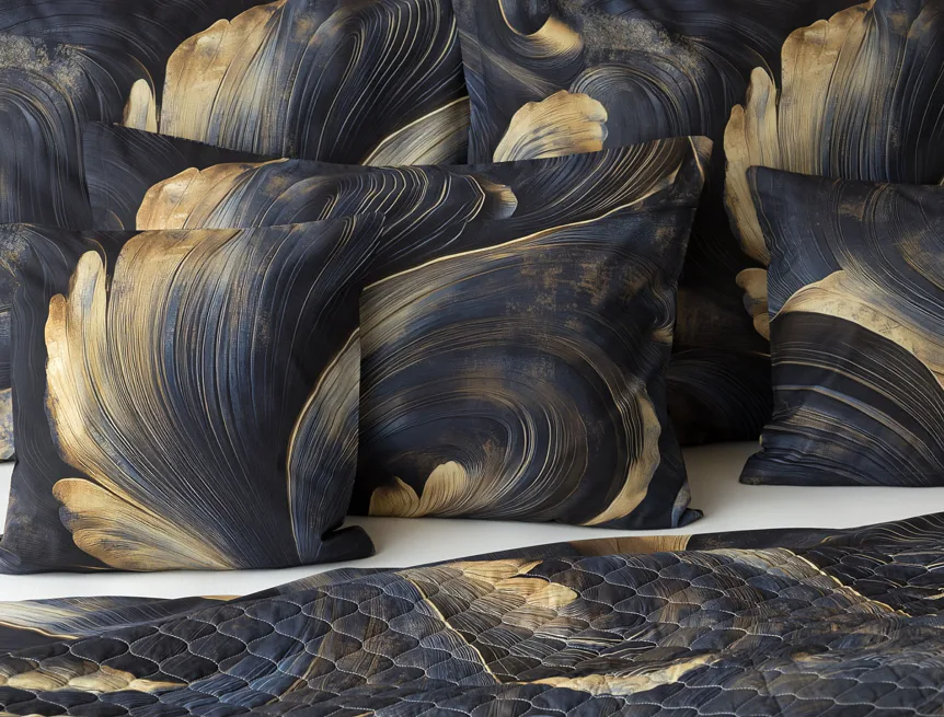 Barevné provedení: Abstraktní motiv ve tvaru lyry v paletě tmavě modrých a pískových tónů, který je z obou stran přehozu stejný. Okraje zdobí černé lemování doplněné na vrchní straně paspulí v pískové barvě.