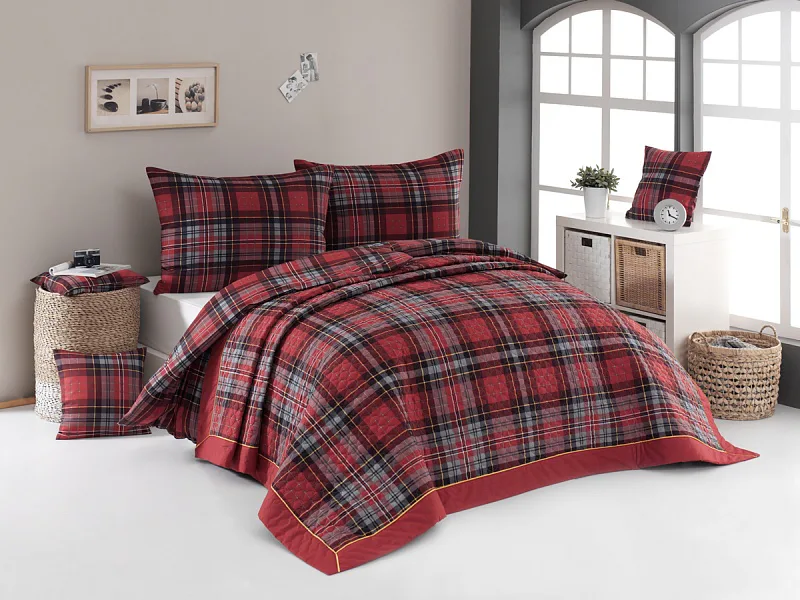 Barevné provedení: kombinace tmavě červené a lahvově zelené, přehoz je doplněný elegantním okrajem v tmavě červeném odstínu a ozdobnou žlutou paspulí