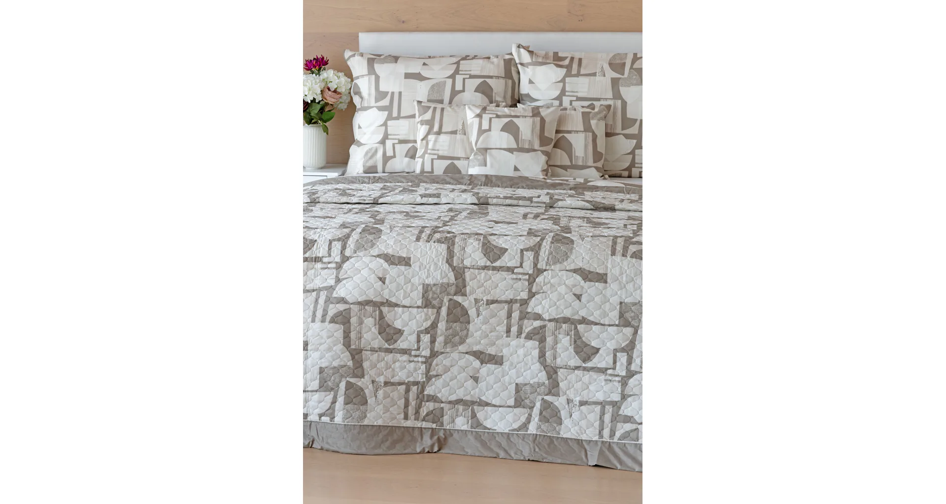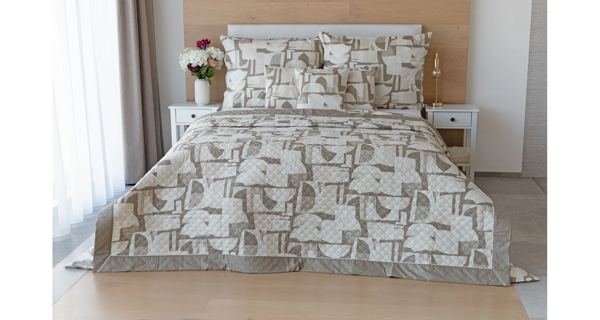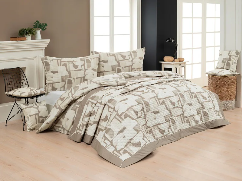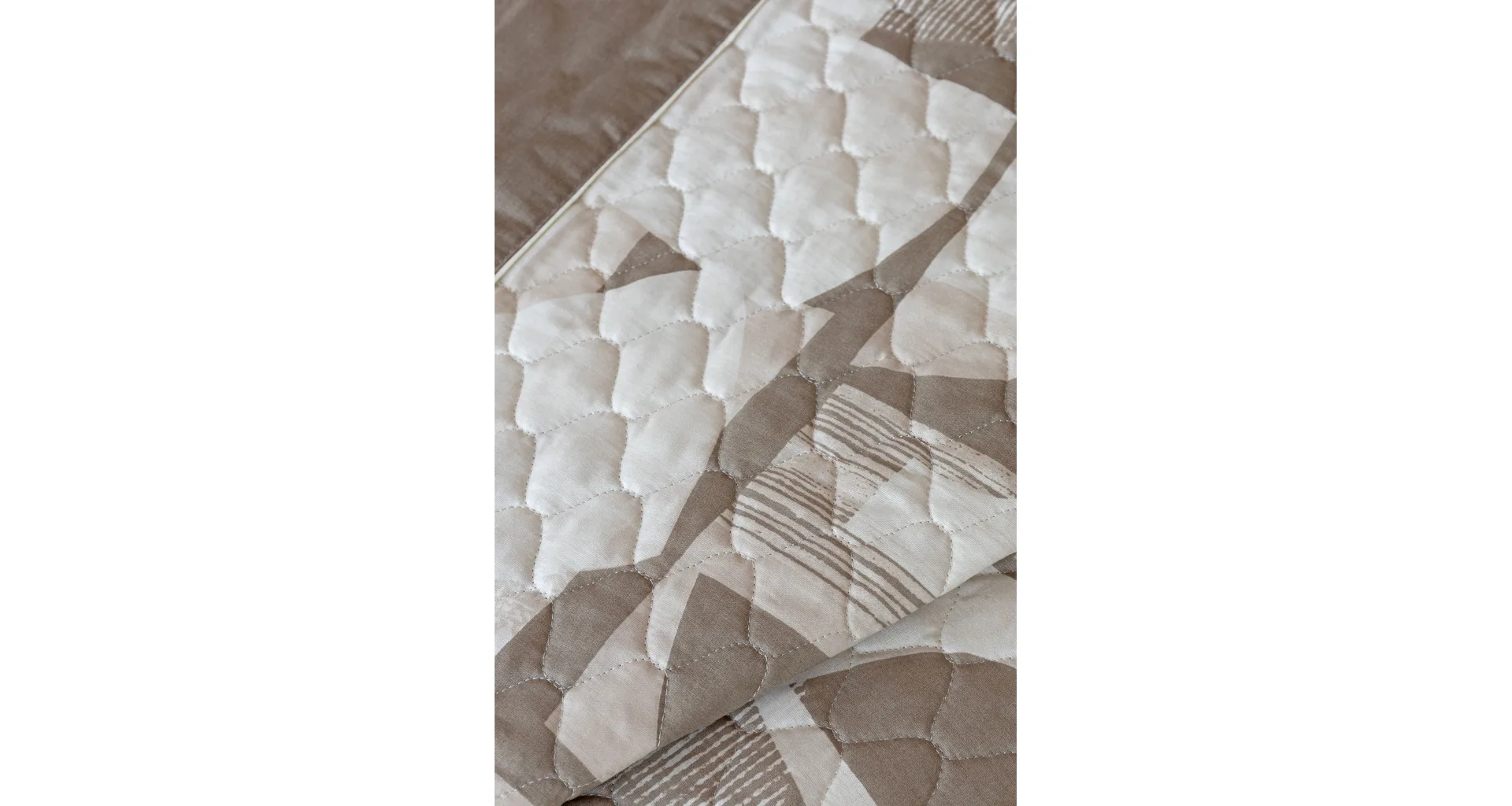 Barevné provedení: Vrchní i spodní stranu přehozu tvoří moderní geometrický vzor v odstínech přírodní béžové a šedohnědé barvy. Okraje zdobí šedohnědé lemování doplněné na vrchní straně krémovou paspulí.