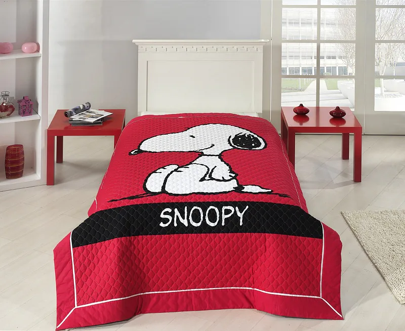 Přehoz SNOOPY s nestárnoucím hrdinou je jedinečný estetický a praktický doplněk, se kterým bude Vaše postel vždy dokonale ustlaná. Jako výplň je použito vrstvené duté vlákno, potvrchový materiál je 100 % bavlněná látka, ve stejném dezénu jako ložní povlečení. Po celé ploše je aplikováno ozdobné prošití, tak aby se zajistila stabilita výplně a současně podtrhl celkový vzhled přehozu. K přehozu doporučujeme zakoupit povlečení ve stejném dezénu.