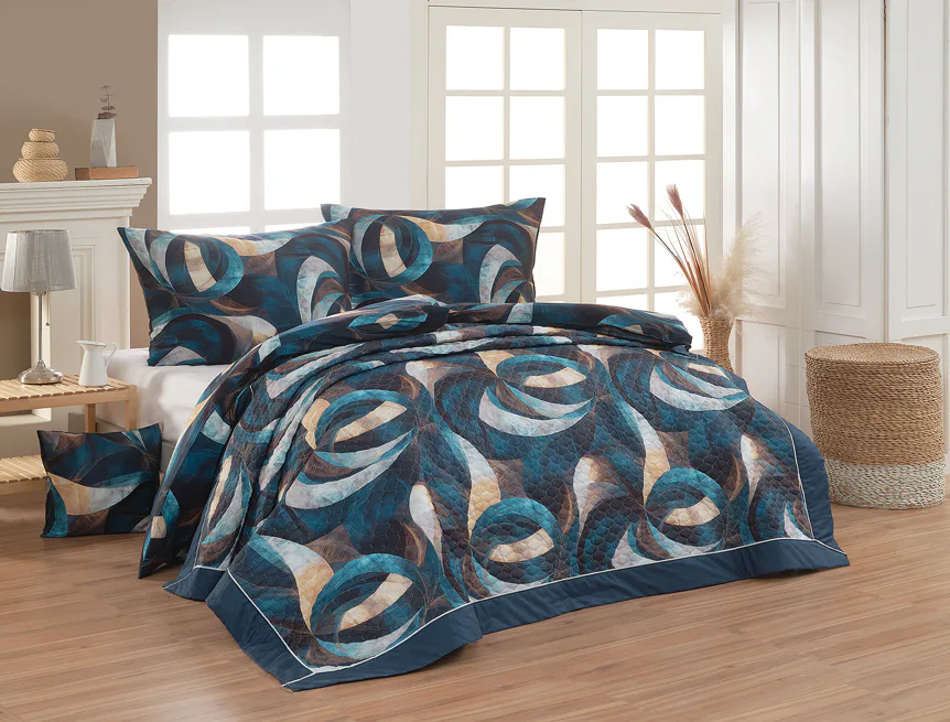 Barevné provedení: Abstraktní motiv v paletě modrých, petrolejových a pískových tónů, který je z obou stran přehozu stejný. Okraje zdobí modrozelené lemování doplněné na vrchní straně světlou paspulí.
