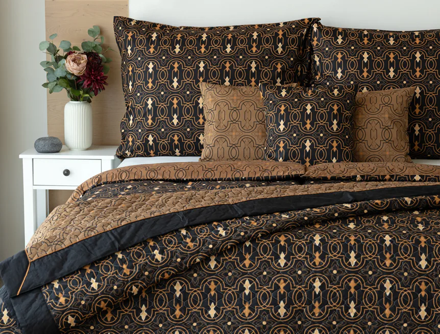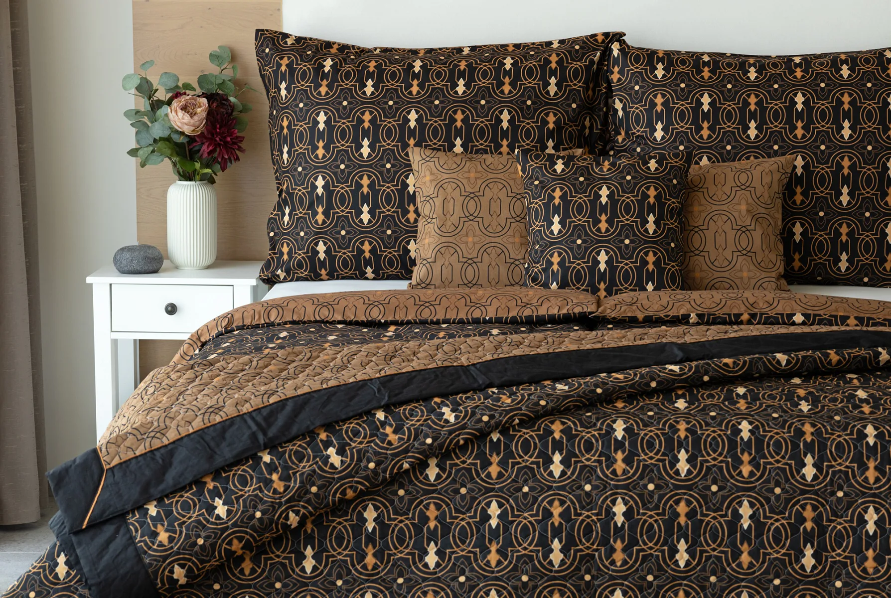 Barevné provedení: Elegantní art deco motiv v hřejivých odstínech nugátu v kombinaci s černou. Přehoz je z každé strany v jiném barevném provedení, stejně jako ložní povlečeníOkraje zdobí černé lemování doplněné na vrchní straně karamelově hnědou paspulí.