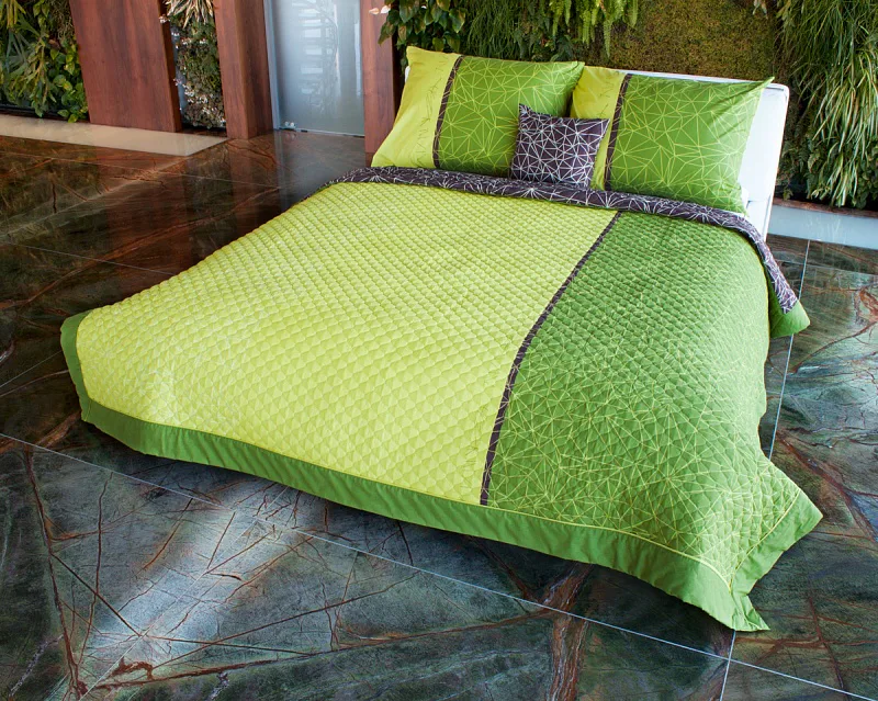 Přehoz TOILE GREEN je jedinečný, estetický a praktický doplněk, se kterým bude Vaše postel vždy dokonale ustlaná. Jako výplň je použito vrstvené duté vlákno, povrchový materiál je 100% bavlněná látka, ve stejném dezénu jako ložní povlečení. Spodní strana přehozu je hnědá s bílým geomterickým vzorem. Po celé ploše je aplikováno ozdobné prošití tak, aby se zajistila stabilita výplně a současně podtrhl celkový vzhled přehozu.