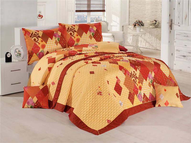 Přehoz VALENCIA ORANGE je jedinečný, estetický a praktický doplněk, se kterým bude Vaše postel vždy dokonale ustlaná. Jako výplň je použito vrstvené duté vlákno, povrchový materiál je 100% bavlněná látka, ve stejném dezénu jako ložní povlečení. Po celé ploše je aplikováno ozdobné prošití tak, aby se zajistila stabilita výplně a současně podtrhl celkový vzhled přehozu.