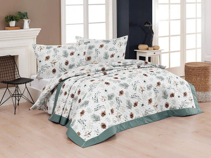 Barevné provedení: Jemný přírodní motiv, který je z obou stran přehozu stejný. Okraje zdobí šedozelené lemování doplněné na vrchní straně zelinkavou paspulí.