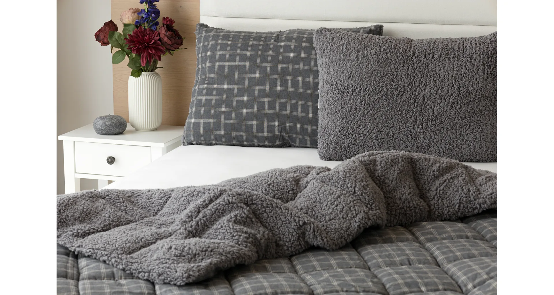 Elegantní vzor Arno s jemnou krémovou kostkou na antracitově šedém podkladu doplňuje barevně sladěný beránek v tmavě šedém odstínu. K přikrývce lze dokoupit také polštář ve stejném designu.