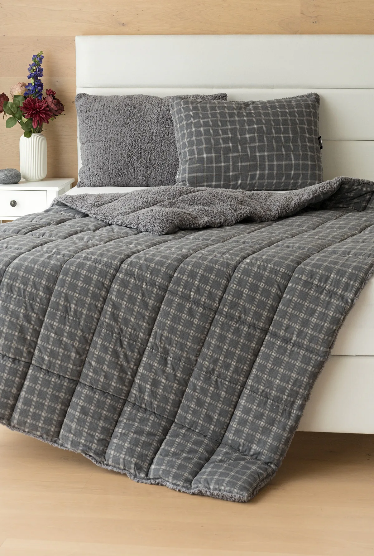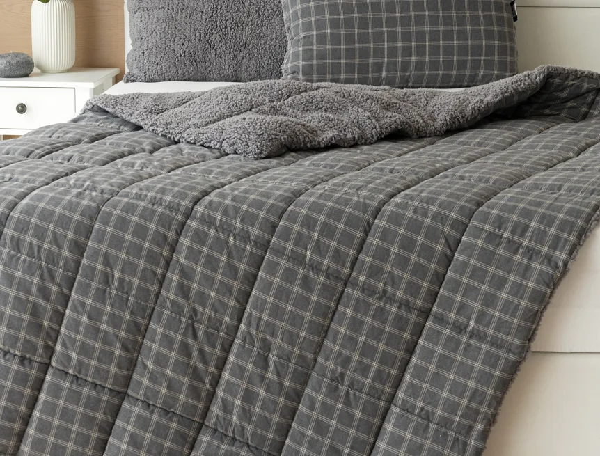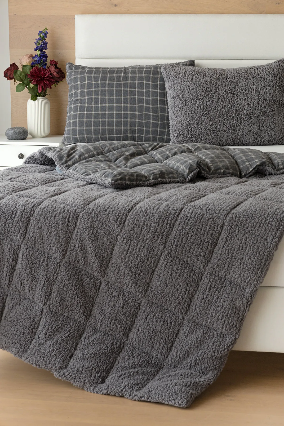 Elegantní vzor Arno s jemnou krémovou kostkou na antracitově šedém podkladu doplňuje barevně sladěný beránek v tmavě šedém odstínu. K přikrývce lze dokoupit také polštář ve stejném designu.