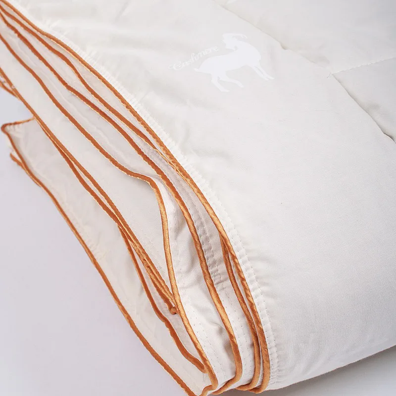Povrch polštářů a přikrývek je z kvalitní 100% bavlny, přírodně bílý potah je prošívaný. Okraje lemuje precizní zlatá bordura, látku zdobí vytkaný decentní bílý vzor kašmírských koz.