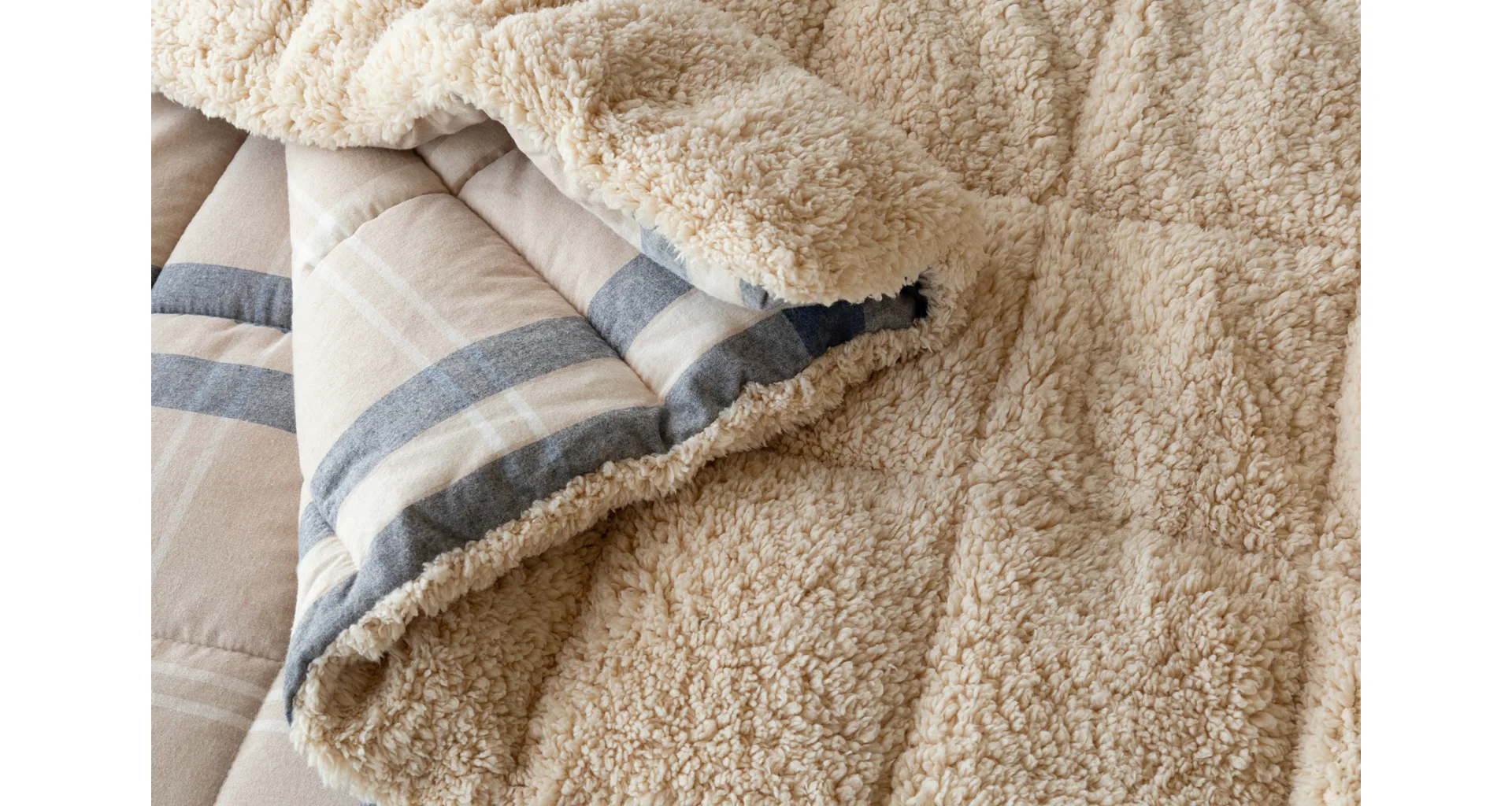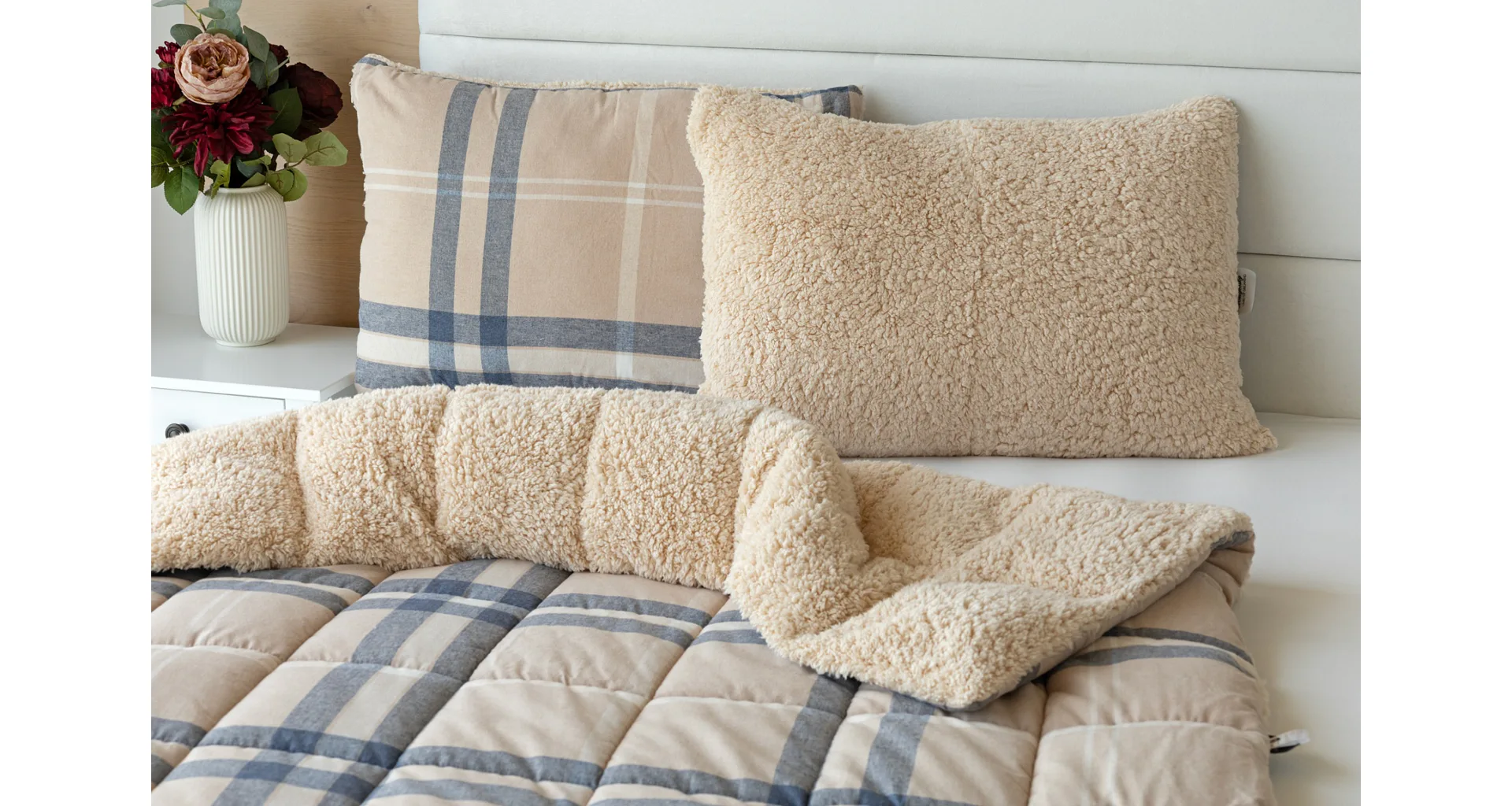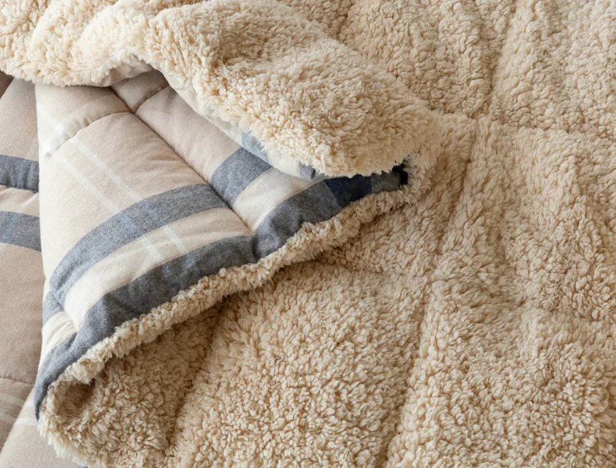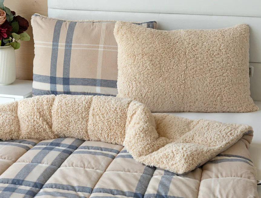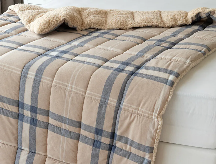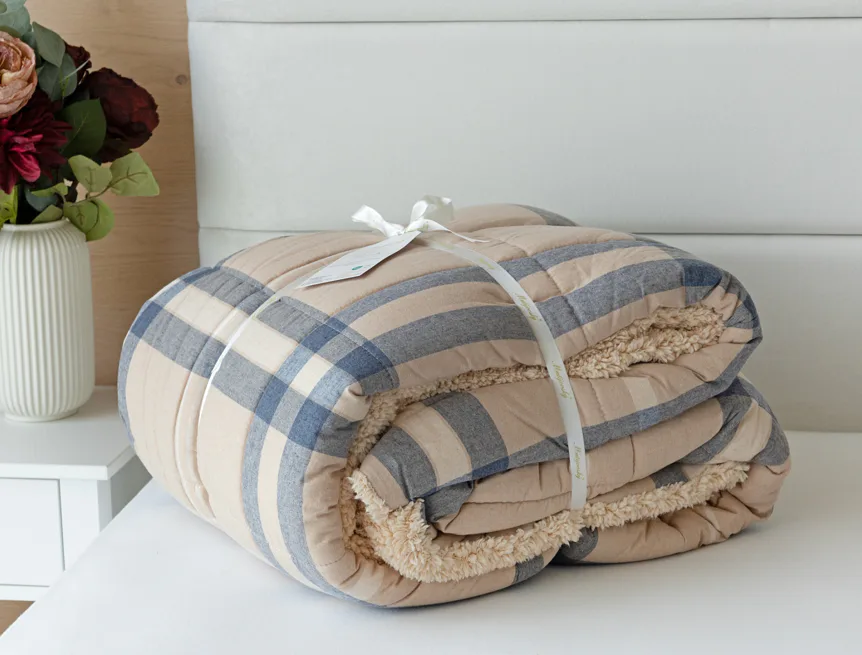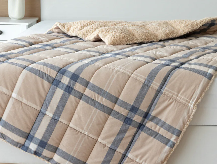 Nová kolekce prošívaných flanelových přikrývek s beránkem vám zajistí jedinečný tepelný komfort a úžasné pohodlí během sychravých dnů, chladných večerů a zimních nocí. Vrchní stranu prošívané deky tvoří hebký flanel s jemným chloupkem, spodní stranu pokrývá hřejivý nadýchaný beránek. Vnitřní výplň s plošnou gramáží 250 g/m2 tvoří mikrogelové polyesterové nano vlákno, které je prodyšné, lehké a nesléhá. Stabilitu výplně zajišťuje precizní prošití po celé ploše.