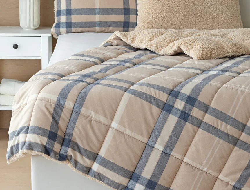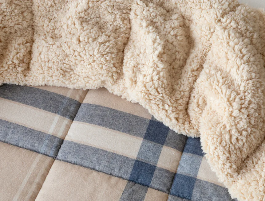 Atraktivní kostkovaný vzor Ella v kombinaci béžové, tmavě modré a bílé doplňuje barevně sladěný beránek v béžovém odstínu. K přikrývce lze dokoupit také polštář ve stejném designu.