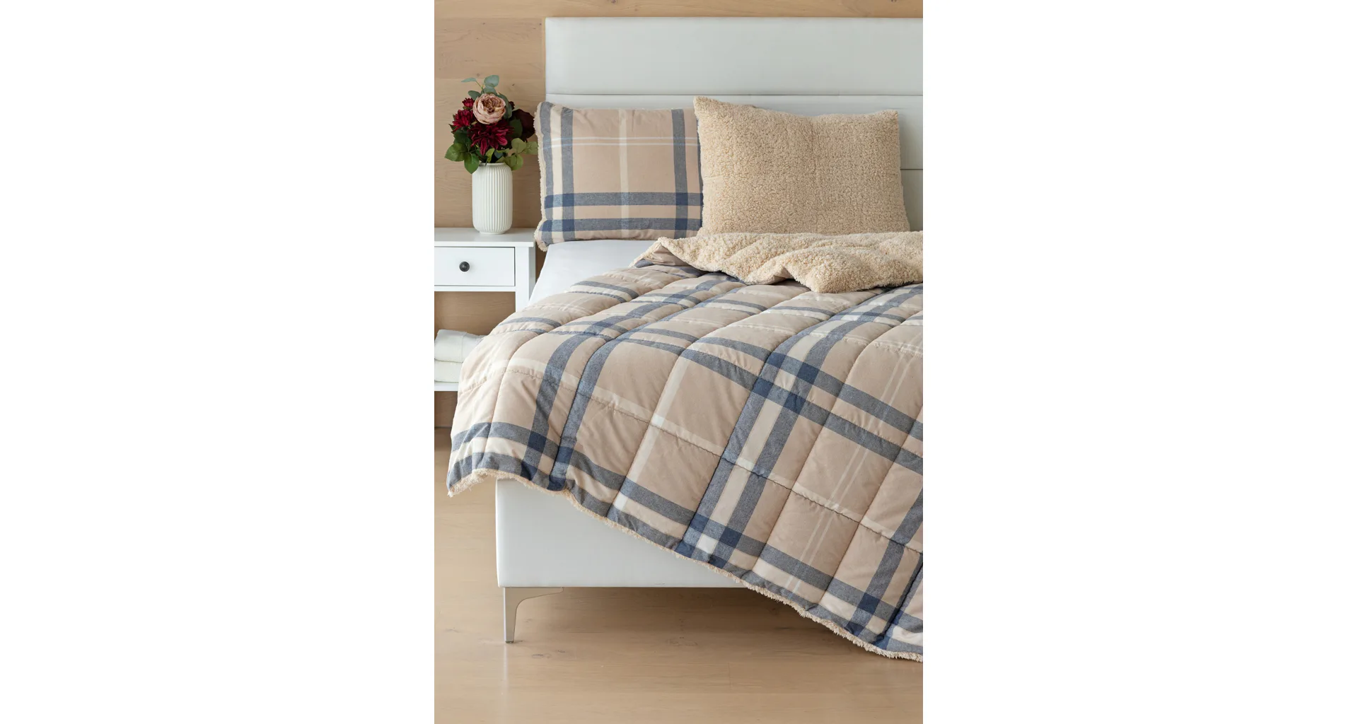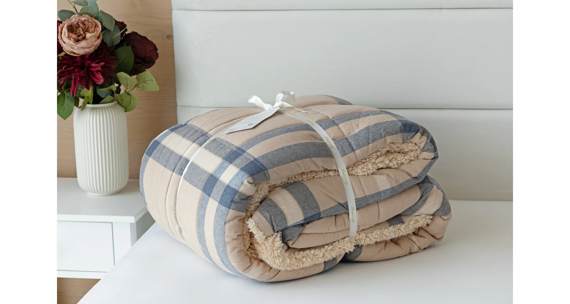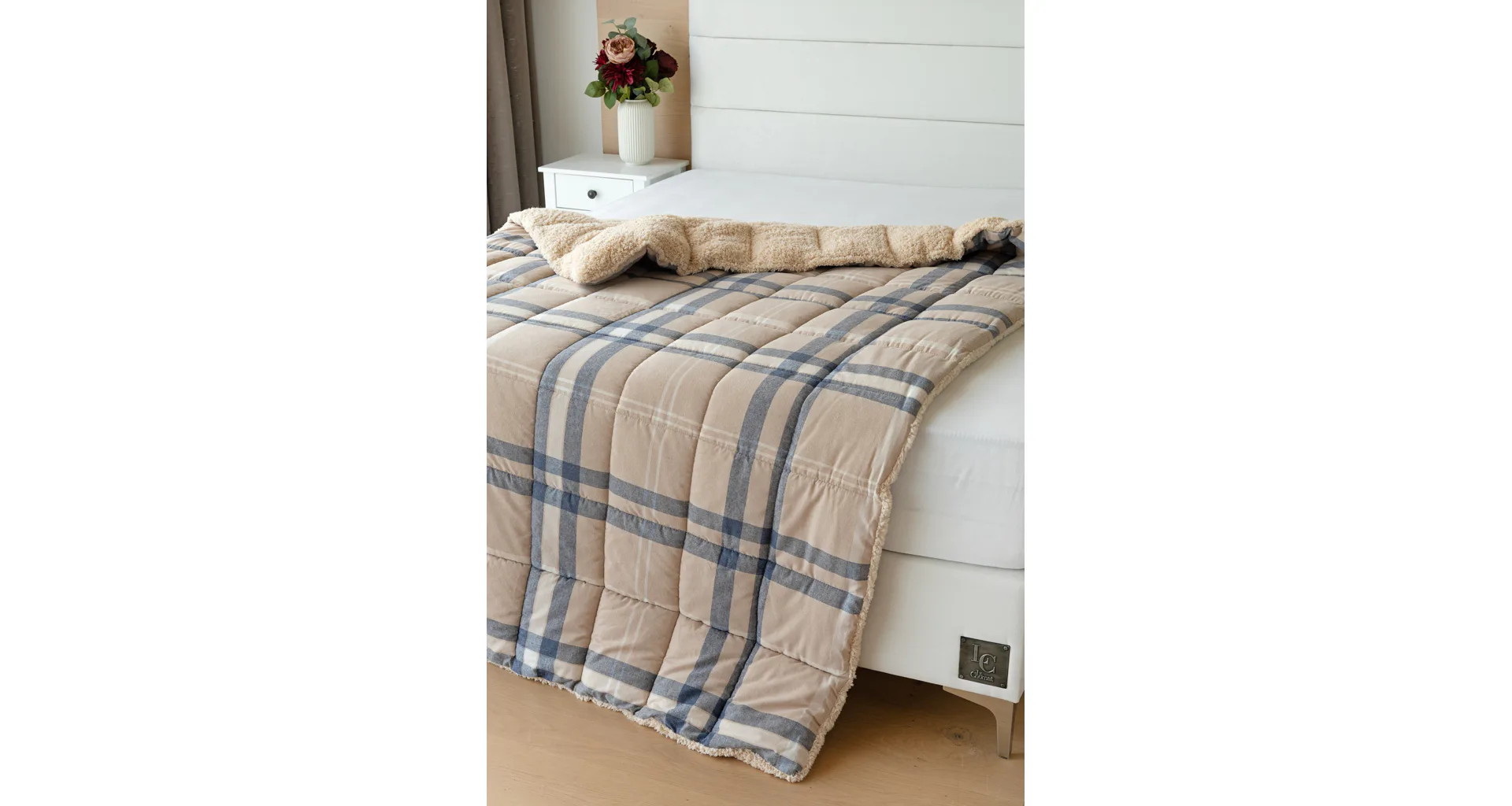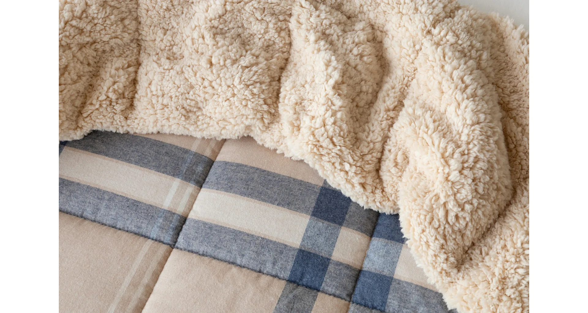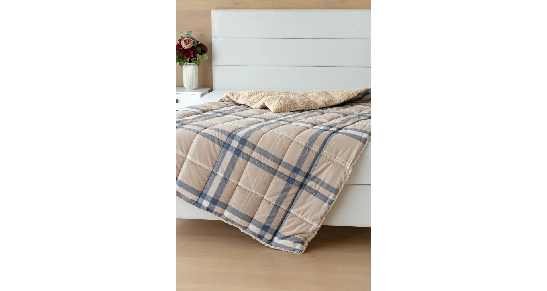 Atraktivní kostkovaný vzor Ella v kombinaci béžové, tmavě modré a bílé doplňuje barevně sladěný beránek v béžovém odstínu. K přikrývce lze dokoupit také polštář ve stejném designu.