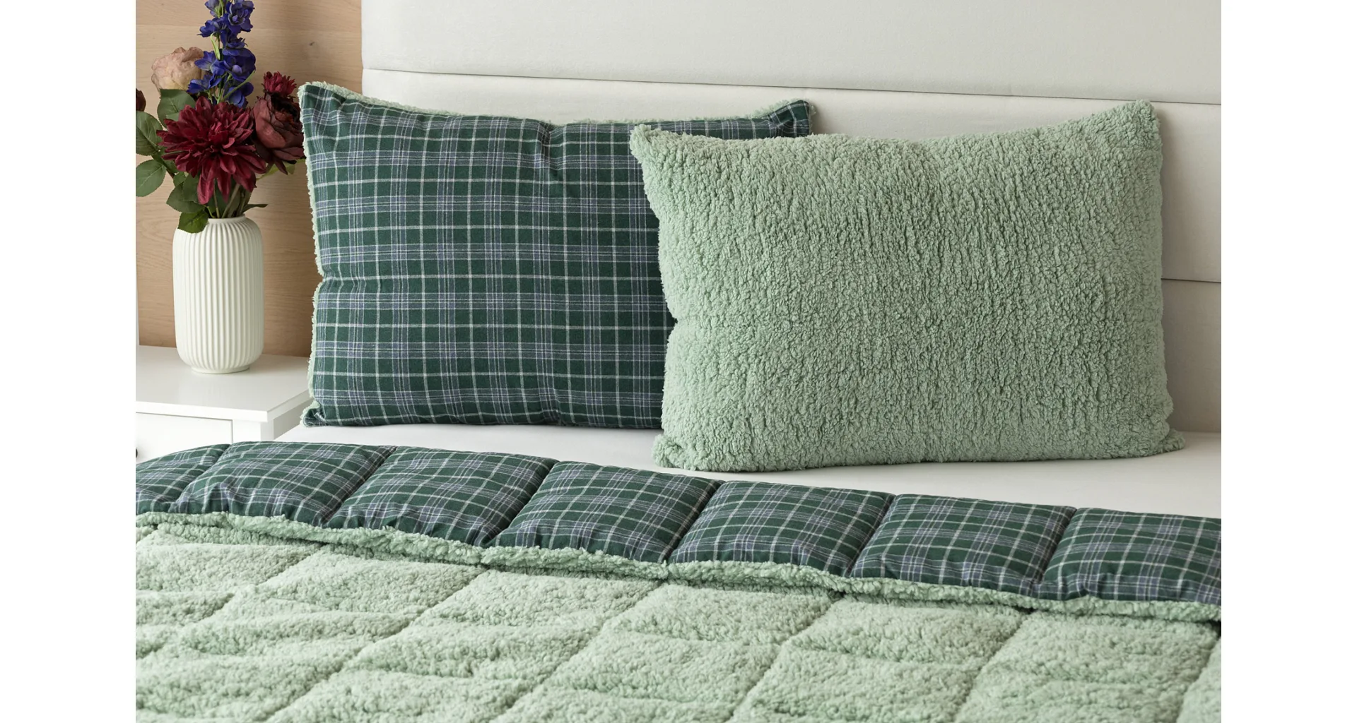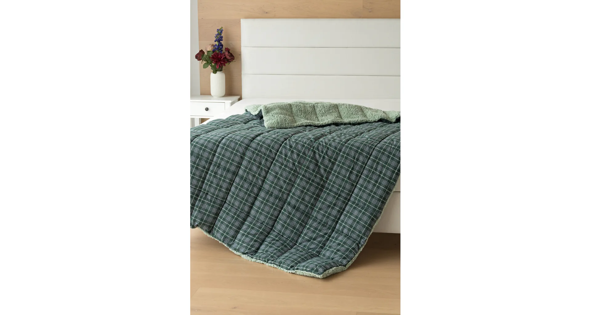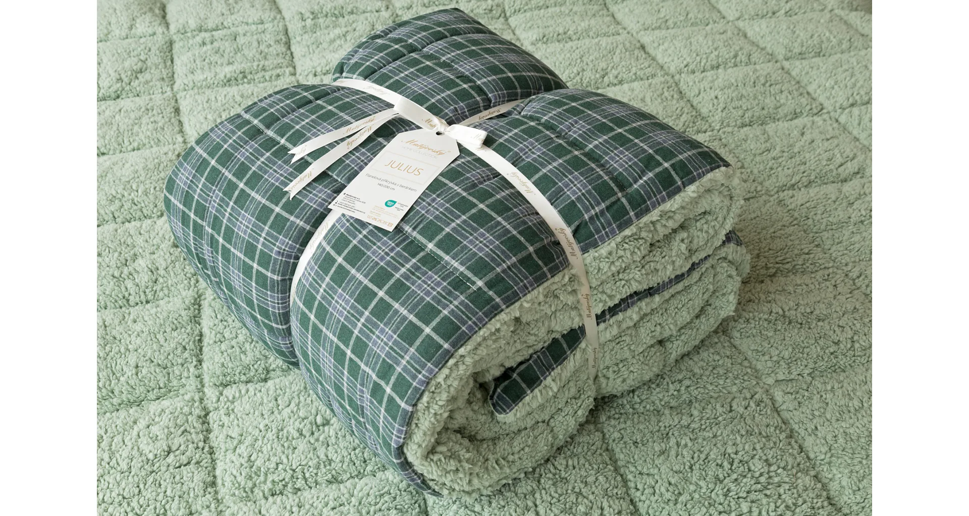 Atraktivní kostkovaný vzor Julius v paletě svátečních zelených a tlumených šedomodrých tónů doplňuje beránek světle zelené barvy. K přikrývce lze dokoupit také polštář ve stejném designu.