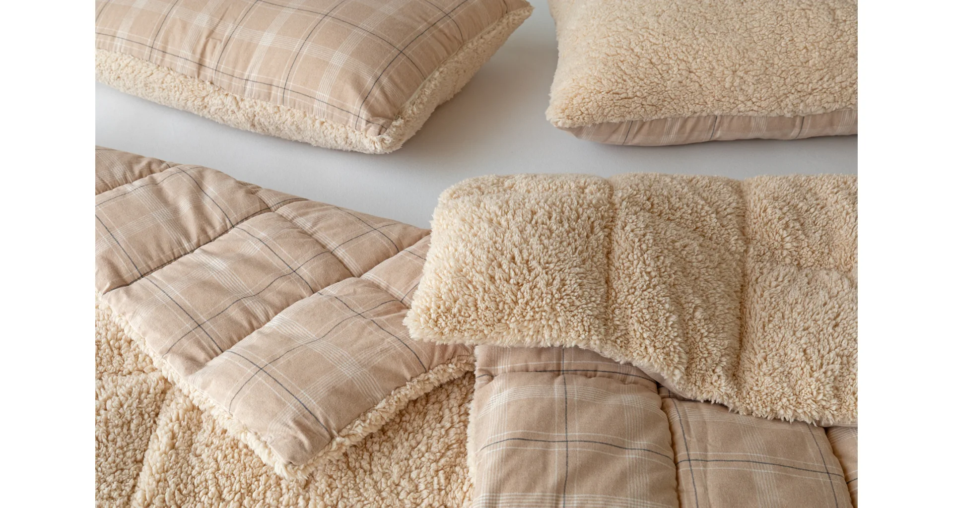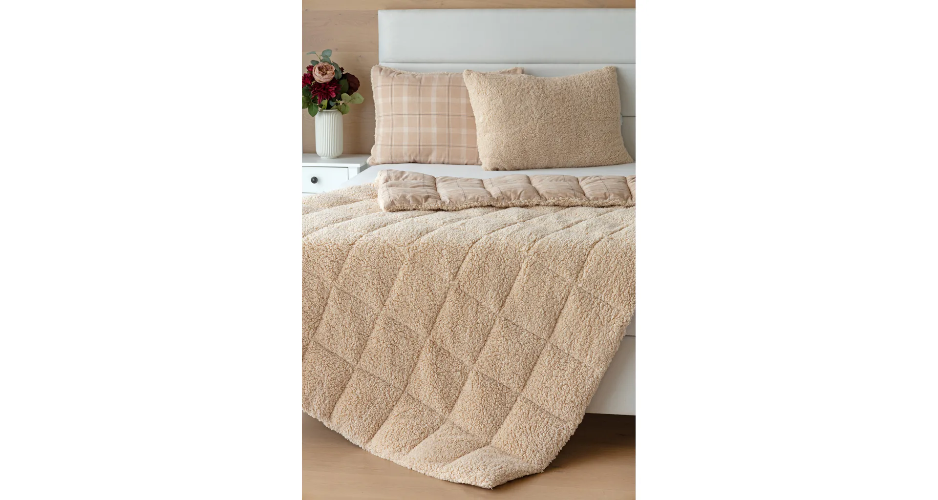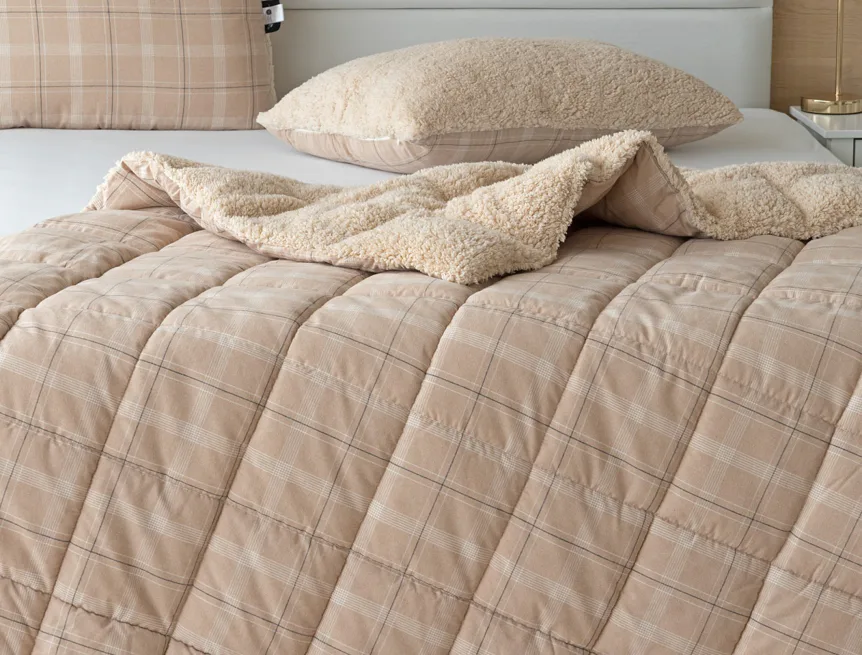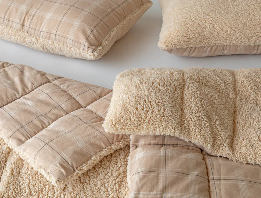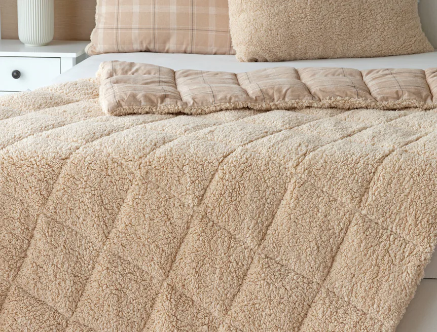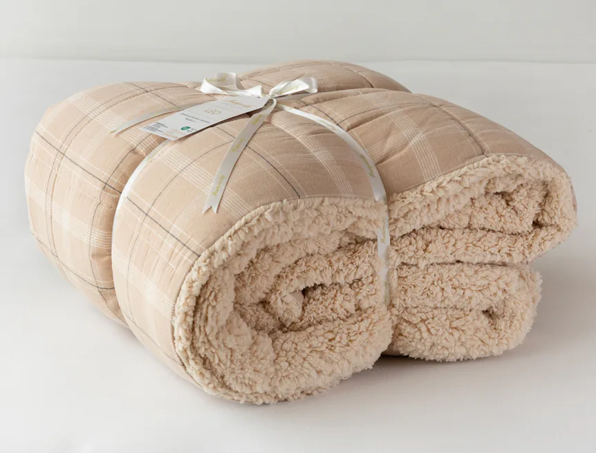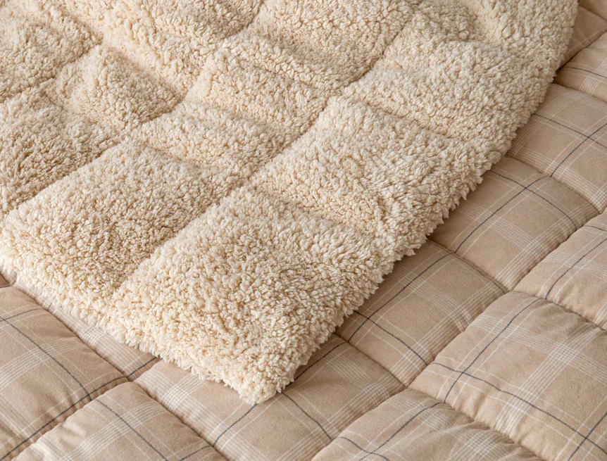 Nová kolekce prošívaných flanelových přikrývek s beránkem vám zajistí jedinečný tepelný komfort a úžasné pohodlí během sychravých dnů, chladných večerů a zimních nocí. Vrchní stranu prošívané deky tvoří hebký flanel s jemným chloupkem, spodní stranu pokrývá hřejivý nadýchaný beránek. Vnitřní výplň s plošnou gramáží 250 g/m2 tvoří mikrogelové polyesterové nano vlákno, které je prodyšné, lehké a nesléhá. Stabilitu výplně zajišťuje precizní prošití po celé ploše.