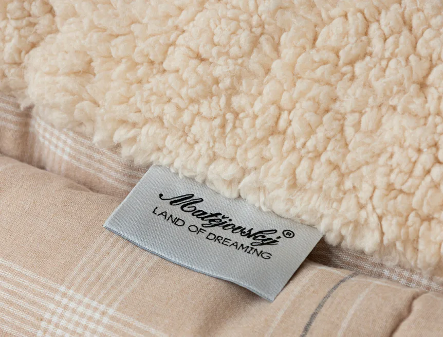 Vzor Leo s decentní kostkou v paletě béžových a krémových tónů doplňuje barevně sladěný beránek v béžovém odstínu. K přikrývce lze dokoupit také polštář ve stejném designu.