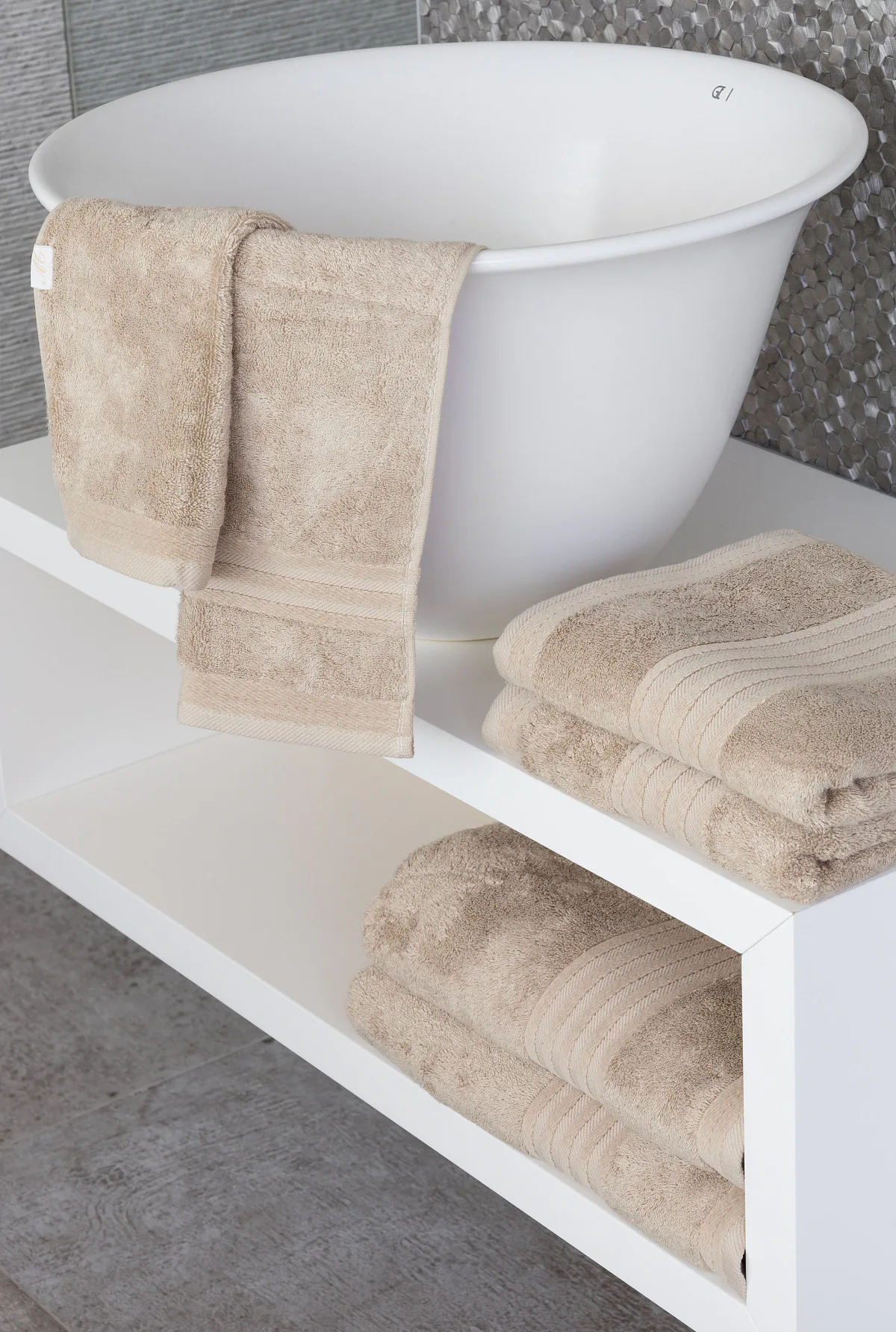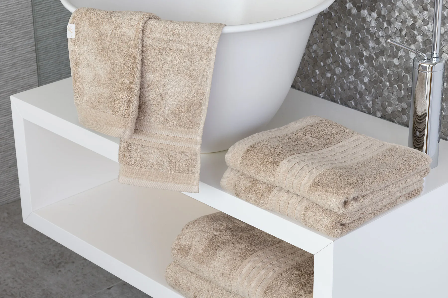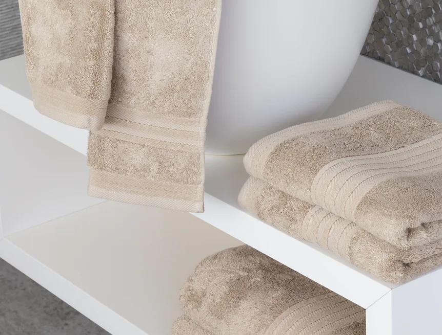 Vybírejte ze tří okouzlujících barev, které působivě doladí interiér vaší koupelny: krémová, béžová a hnědá. Kolekci zdobí decentní bordura tvořená vytkávanými proužky.