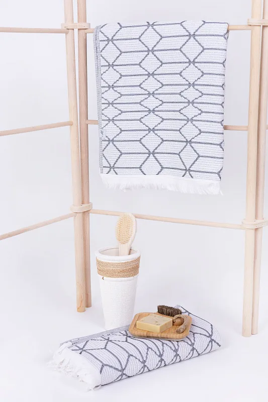 Vytkáváním vzniklo inverzní provedení osušky, která je z jedné strany světlejší a z druhé tmavší. Delší strany osušky jsou olemované a krátké strany zdobí jemné tenké bílé třásně. Poutko pro zavěšení je umístěno na delší straně osušky.