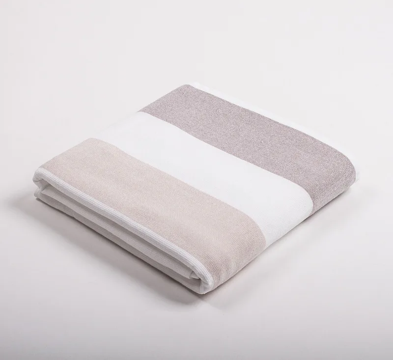 Saunová osuška je zajímavá svým praktickým provedením. Vrchní strana je hladká s jemnou přírodní strukturou a vytkanými proužky ve sladěných odstínech pastelově hnědé, spodní stranu tvoří hebké bílé froté. Díky své jednoduché eleganci se osušky stanou nepostradatelným společníkem při saunování, na zahradě u bazénu, na pláži u moře nebo jen nenápadnou ozdobou Vaší koupelny. Saunové osušky mají všechny čtyři strany lemované.