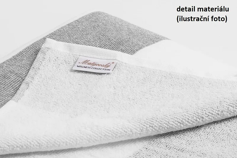 Saunová osuška je zajímavá svým praktickým provedením. Vrchní strana je hladká s jemnou přírodní strukturou a vytkanými proužky ve sladěných odstínech pastelově modré, spodní stranu tvoří hebké bílé froté. Díky své jednoduché eleganci se osušky stanou nepostradatelným společníkem při saunování, na zahradě u bazénu, na pláži u moře nebo jen nenápadnou ozdobou Vaší koupelny. Saunové osušky mají všechny čtyři strany lemované.