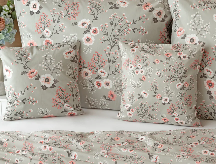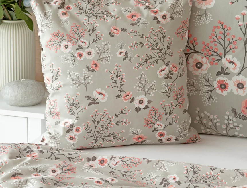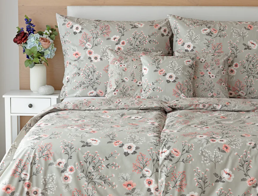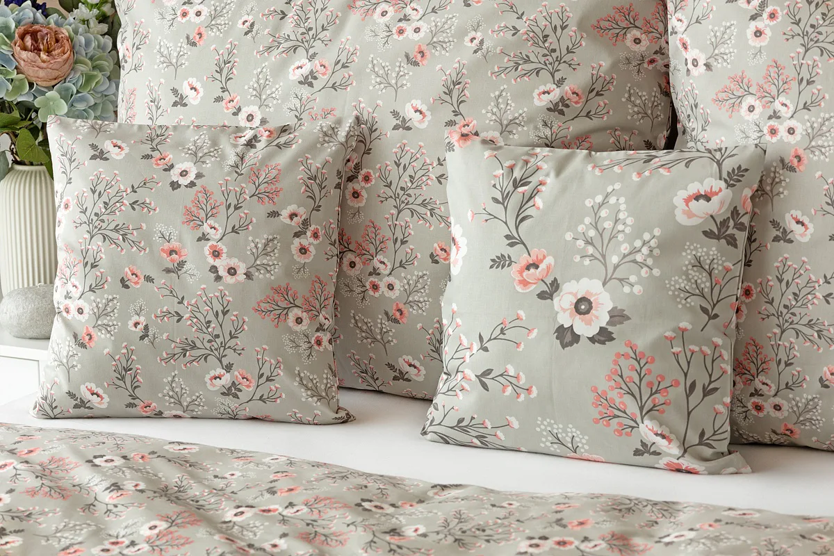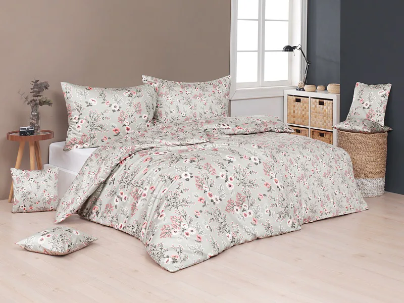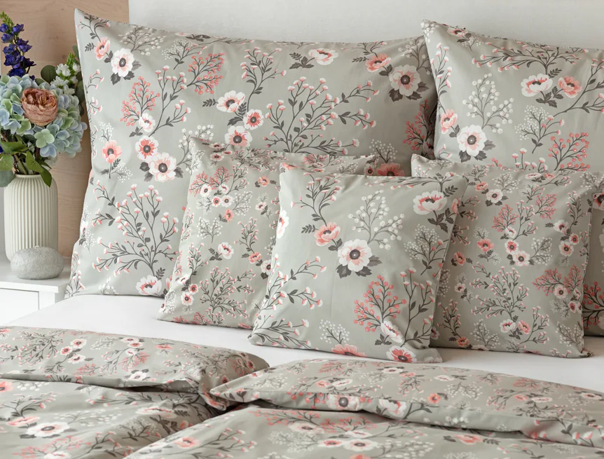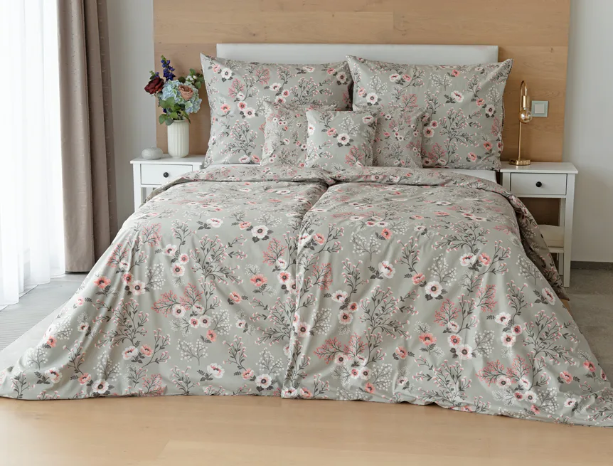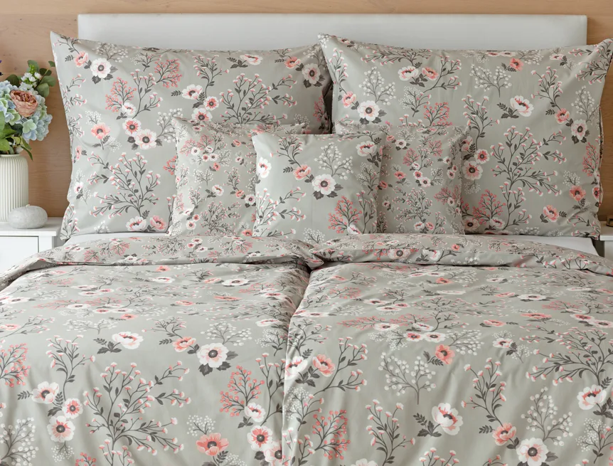 Perfectly tender and charming is the Scarlett cotton bedding. The delicate floral motif in a palette of pink and dark grey tones stands out on the pastel grey ground. Treat yourself to a sweet falling asleep and an even sweeter waking...
