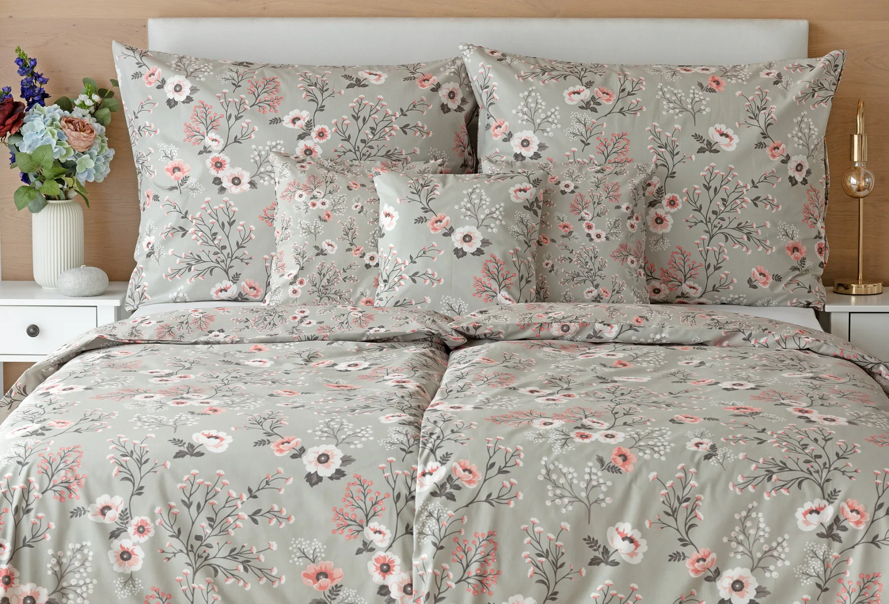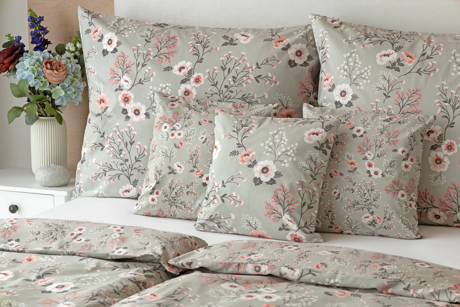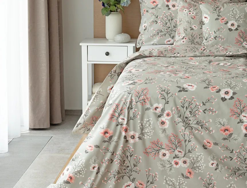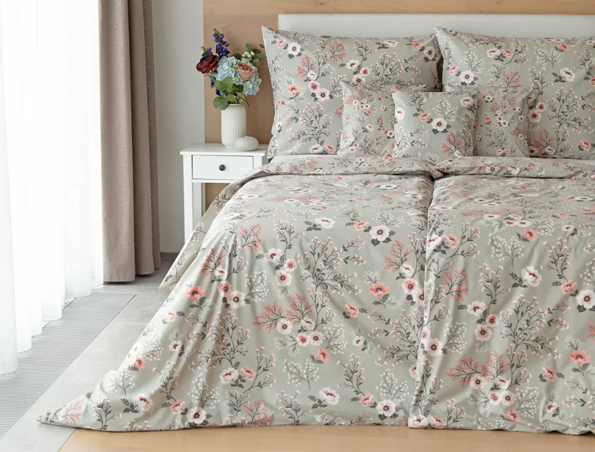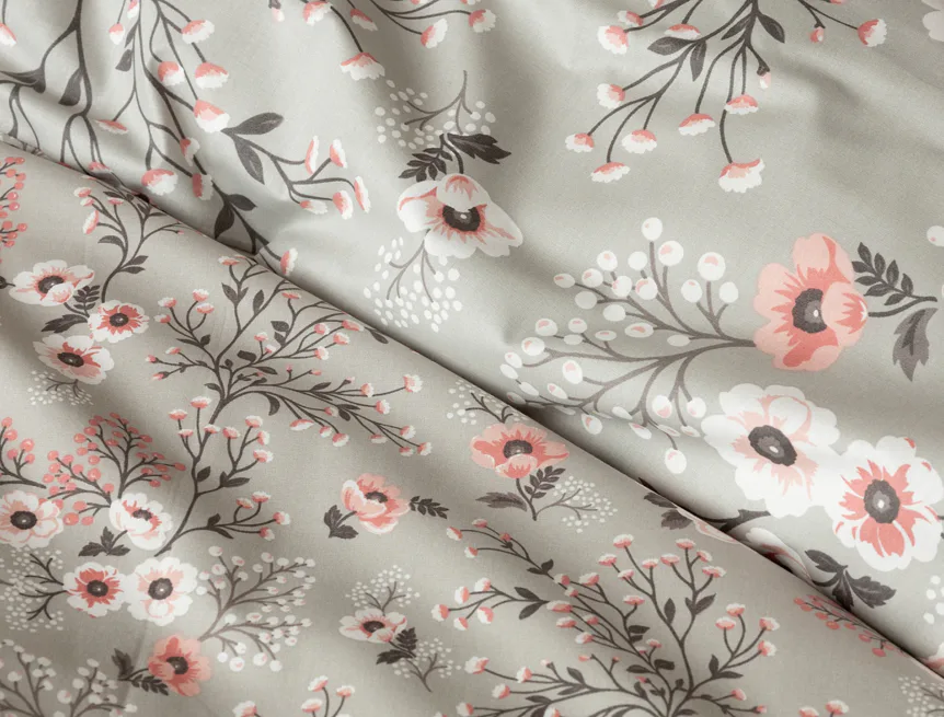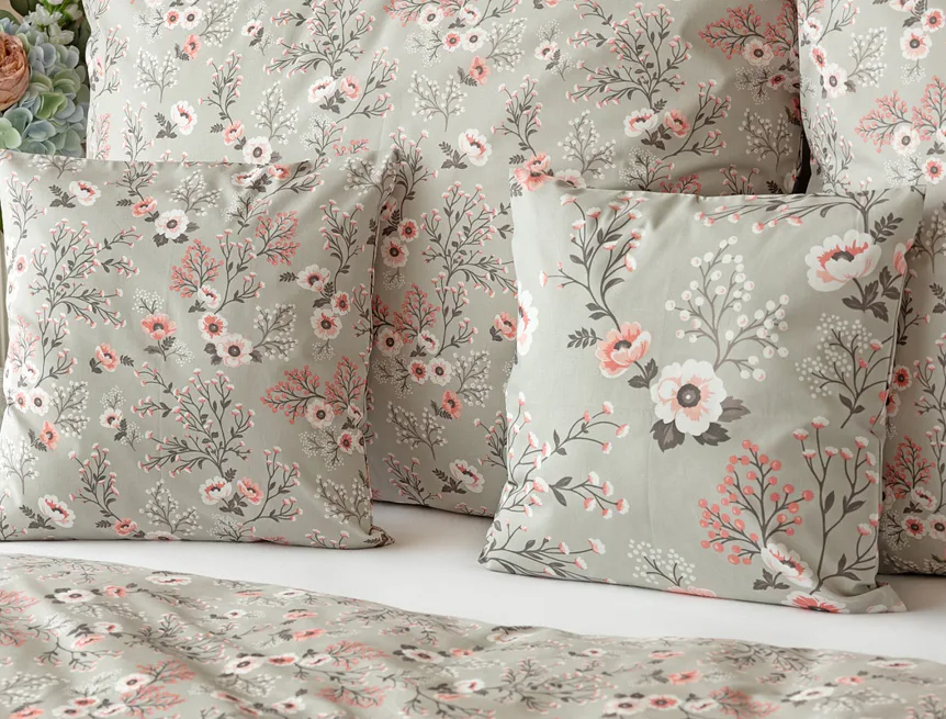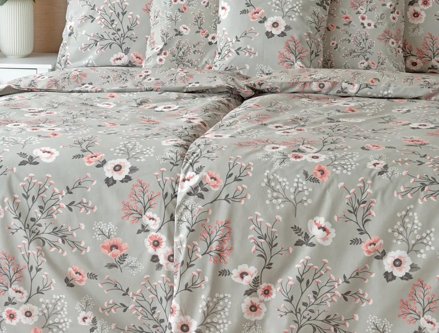 Perfectly tender and charming is the Scarlett cotton bedding. The delicate floral motif in a palette of pink and dark grey tones stands out on the pastel grey ground. Treat yourself to a sweet falling asleep and an even sweeter waking...