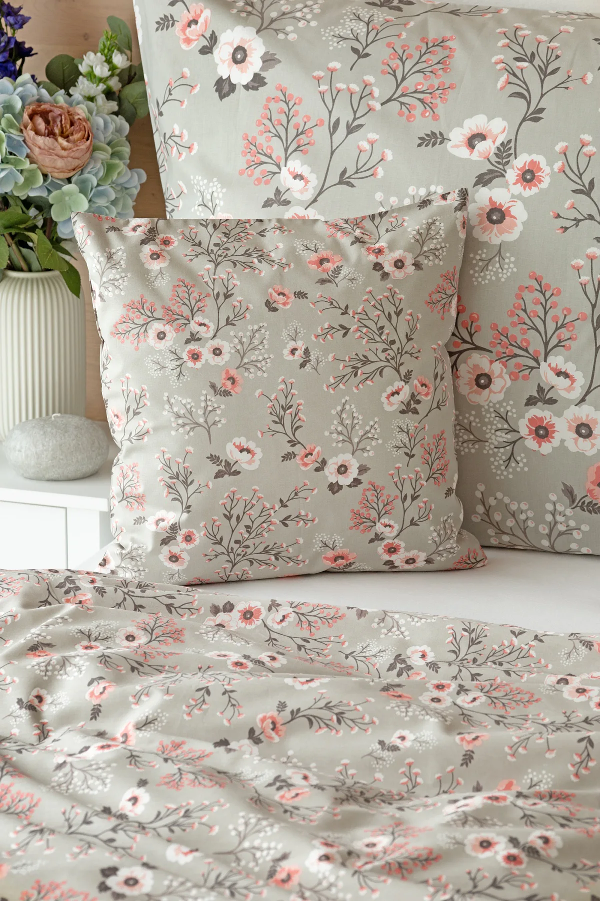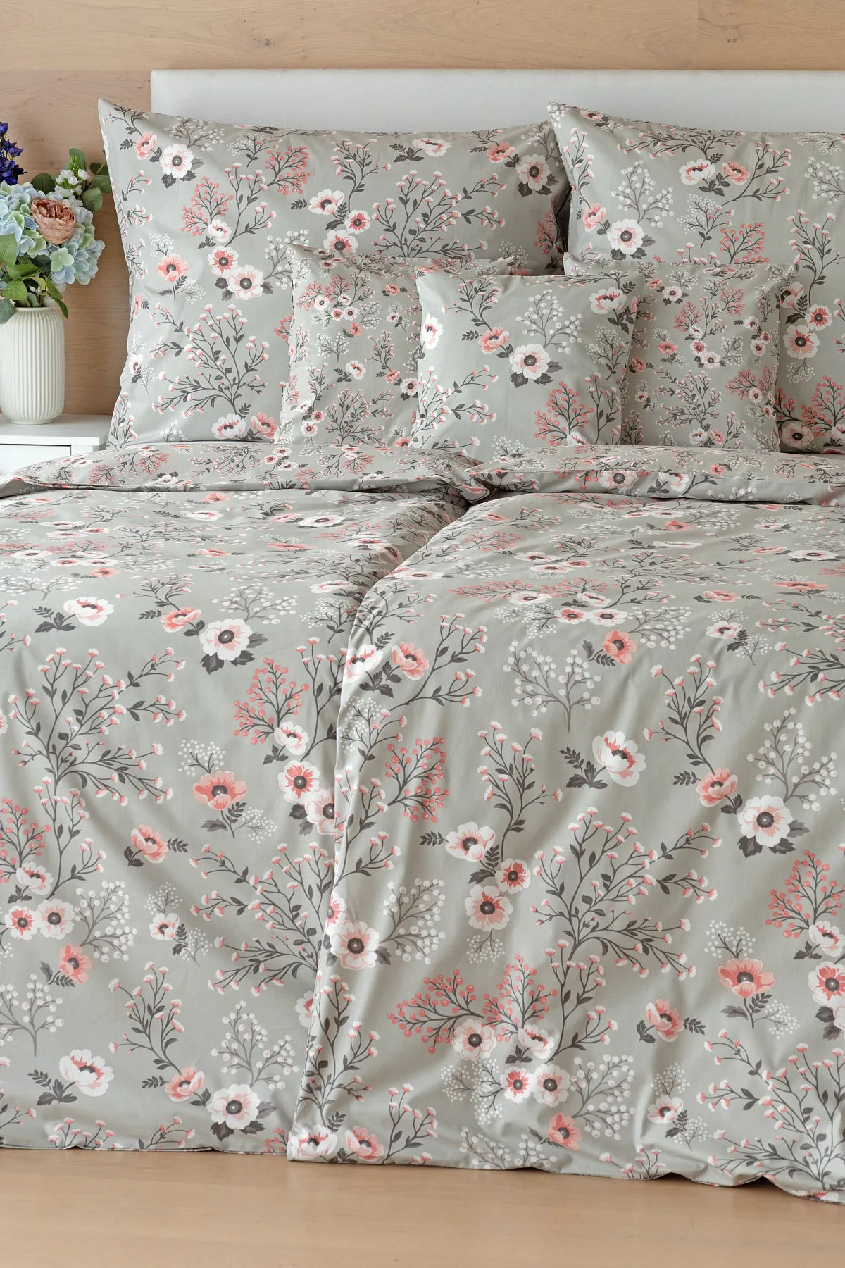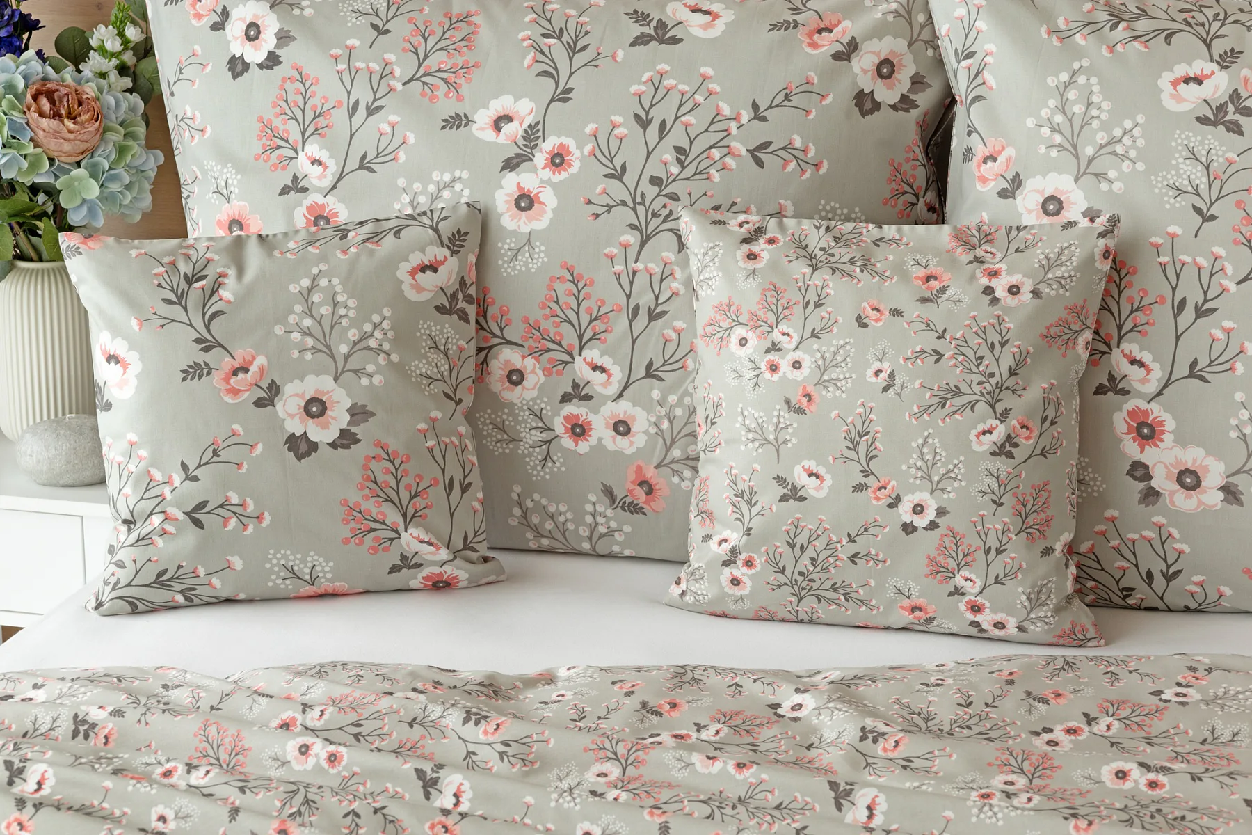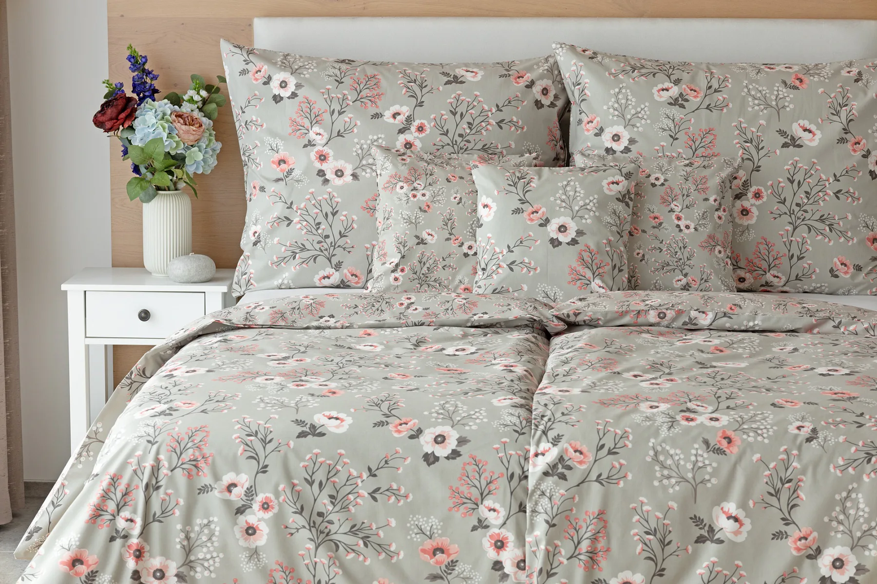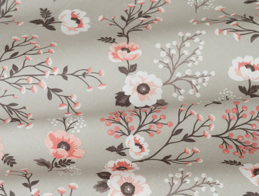 Perfectly tender and charming is the Scarlett cotton bedding. The delicate floral motif in a palette of pink and dark grey tones stands out on the pastel grey ground. Treat yourself to a sweet falling asleep and an even sweeter waking...