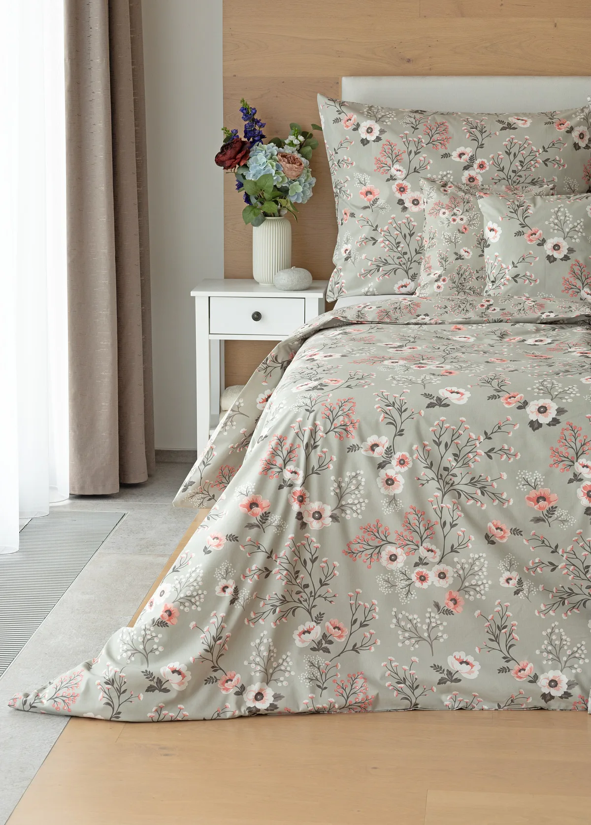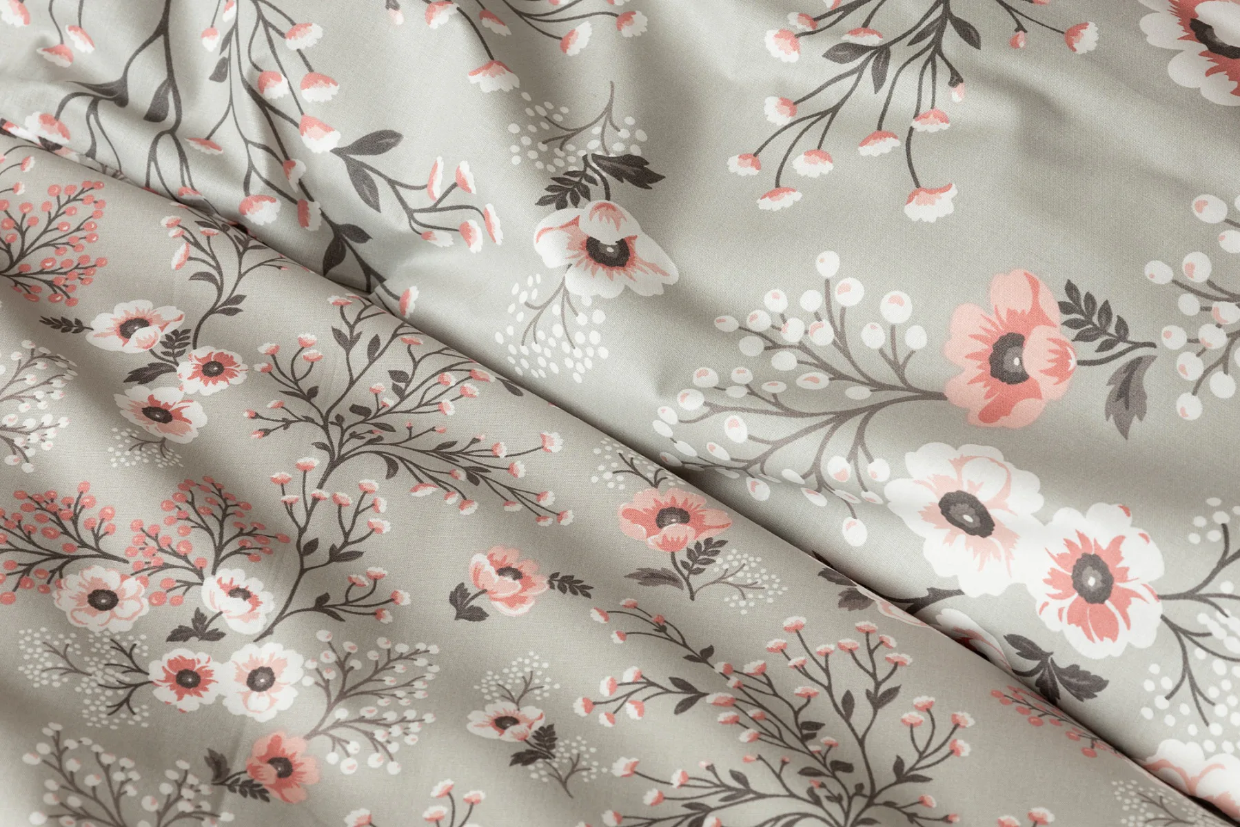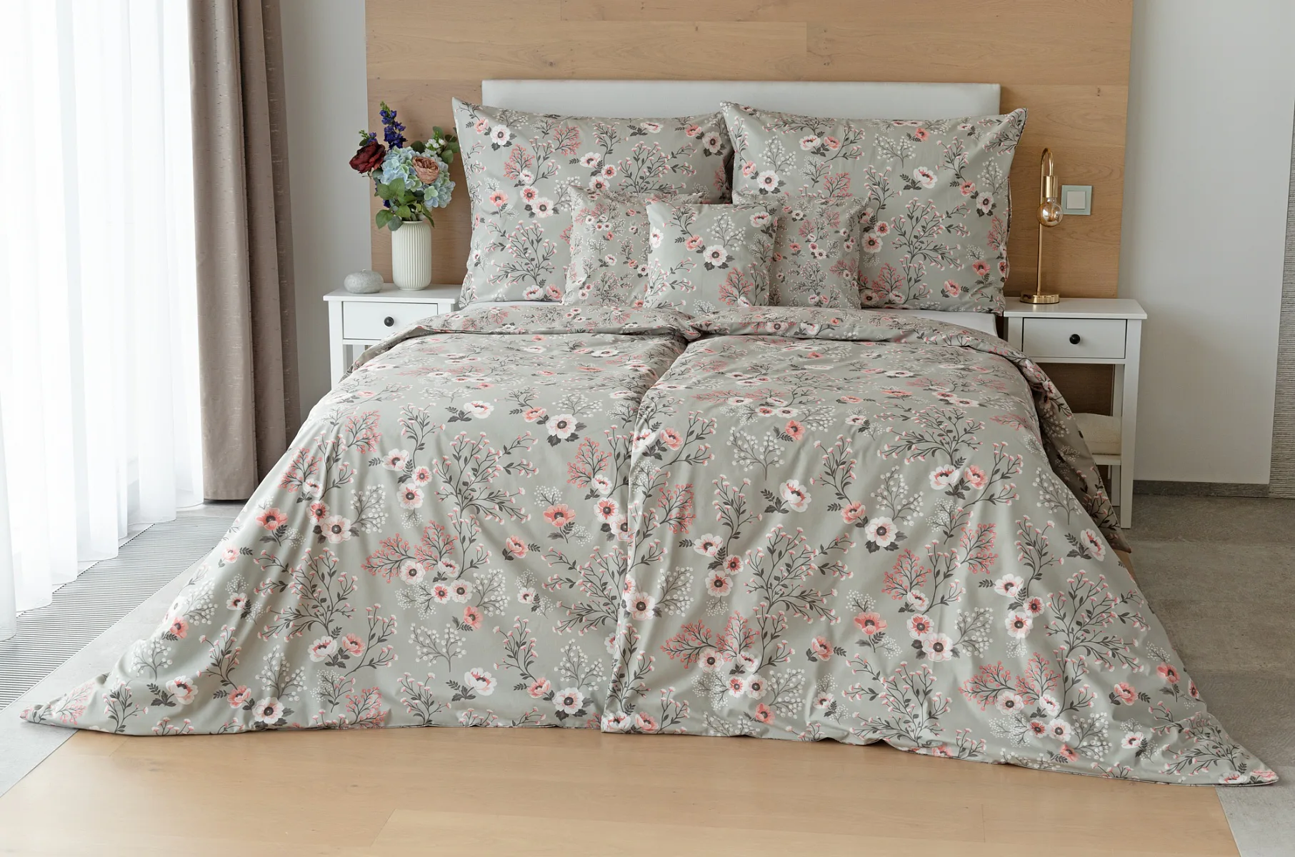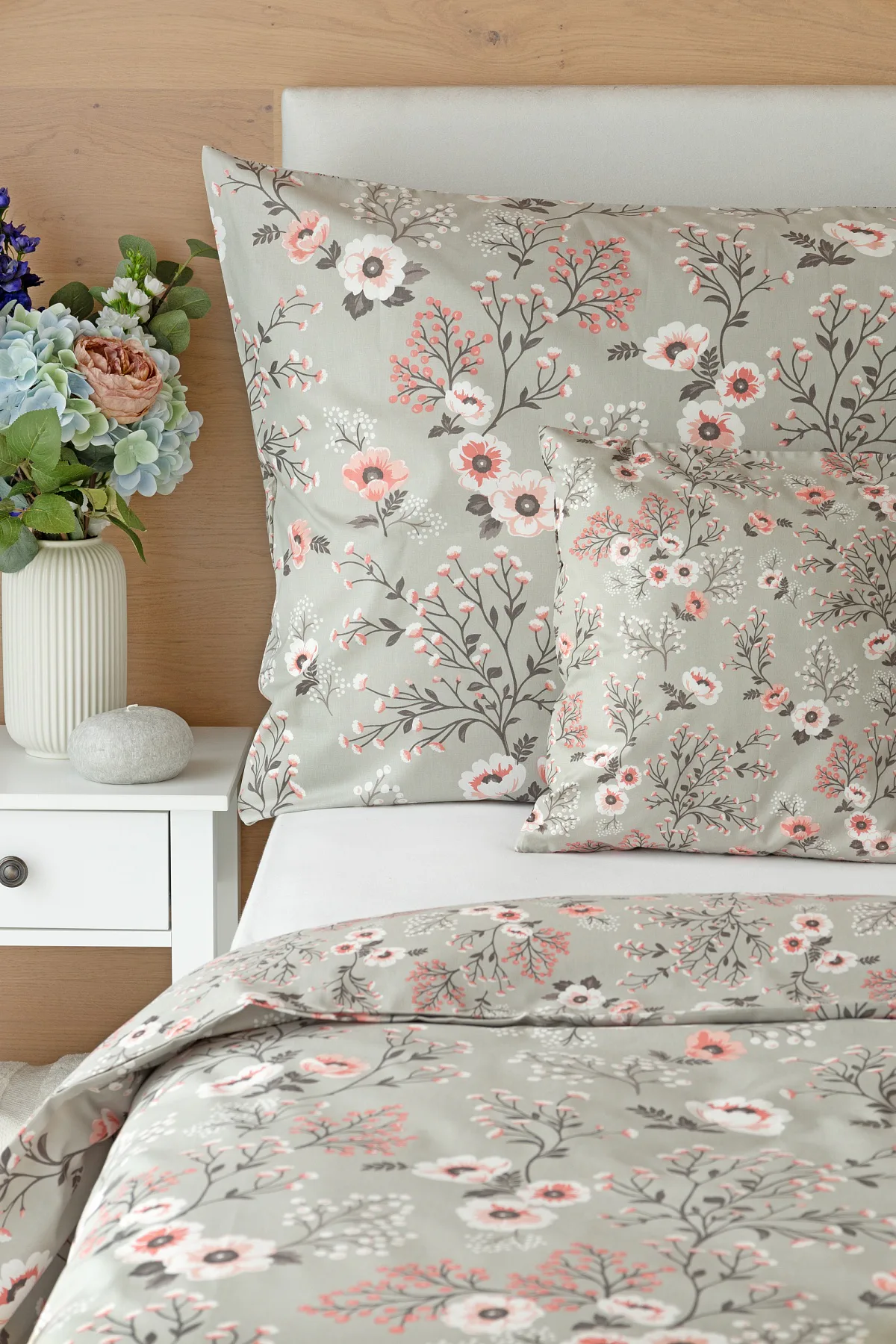 Perfectly tender and charming is the Scarlett cotton bedding. The delicate floral motif in a palette of pink and dark grey tones stands out on the pastel grey ground. Treat yourself to a sweet falling asleep and an even sweeter waking...
