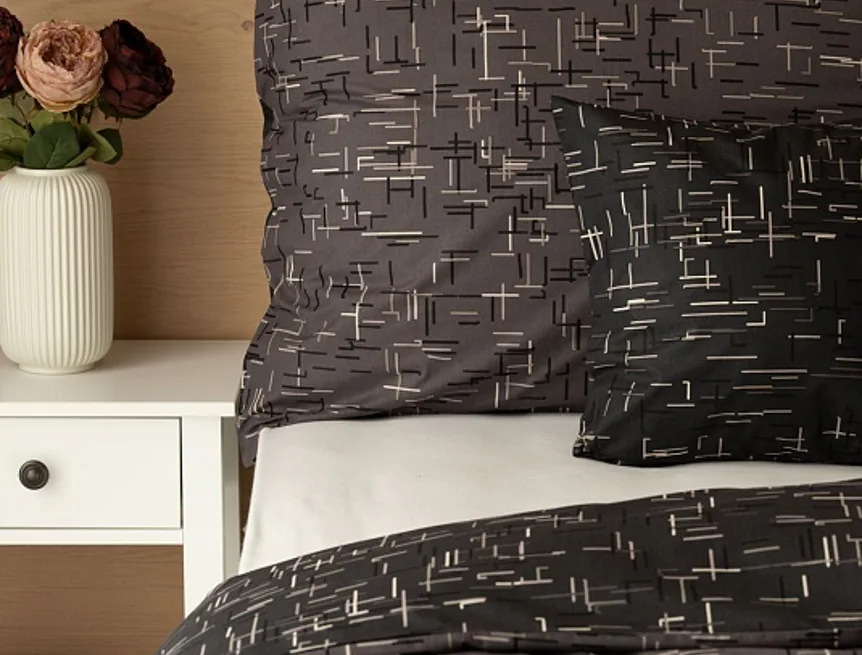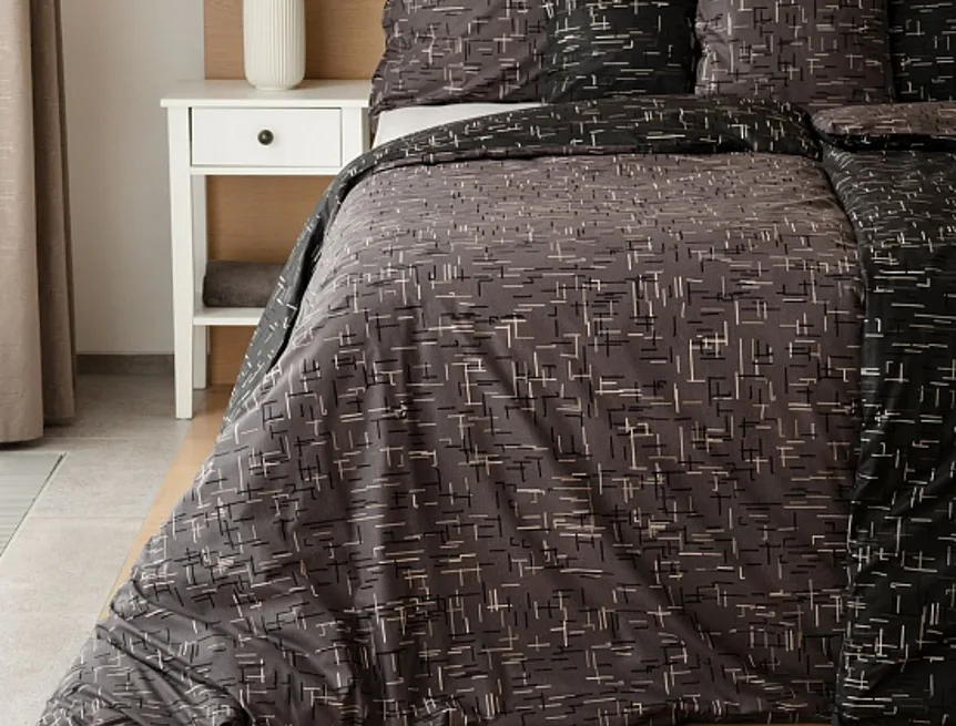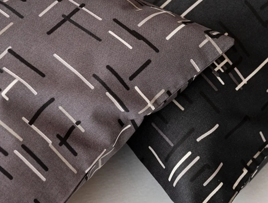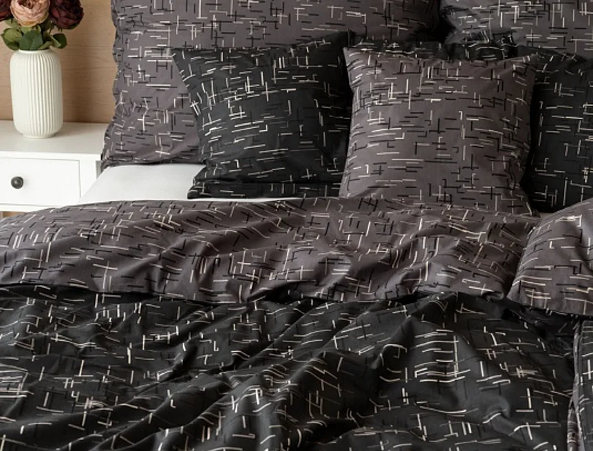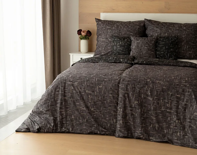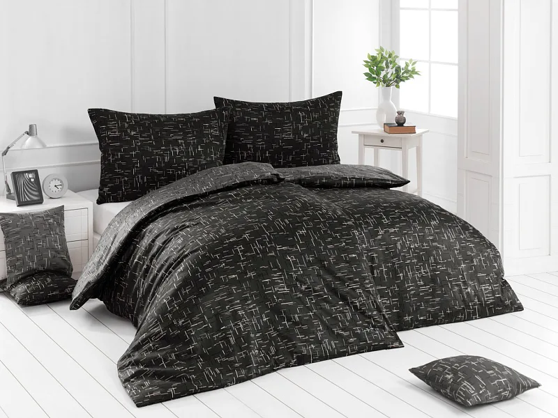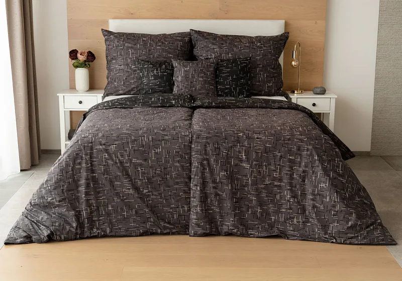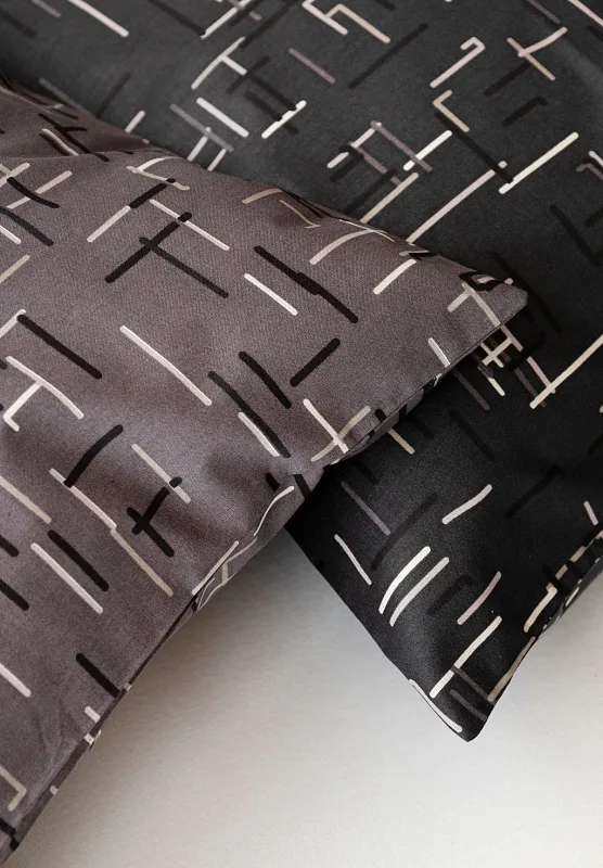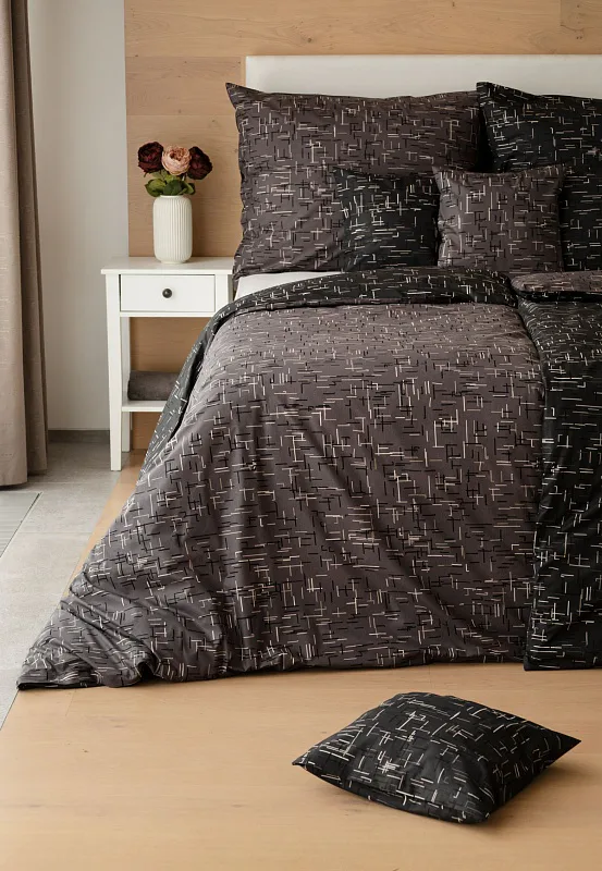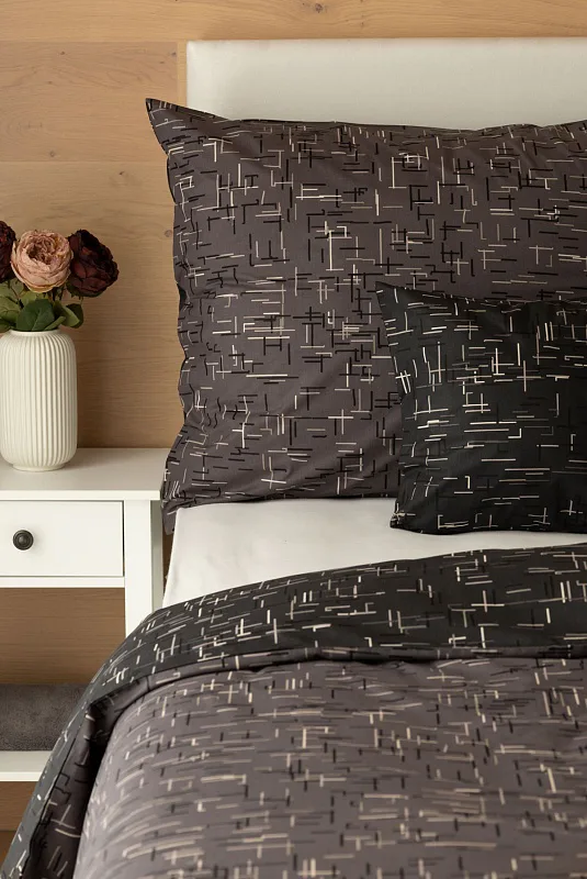 Setter cotton bedding transforms your bedroom into a perfectly elegant place. A simple geometric pattern that combines black and white with shades of grey stands out on a medium grey background on one side, the other side is dark anthracite.