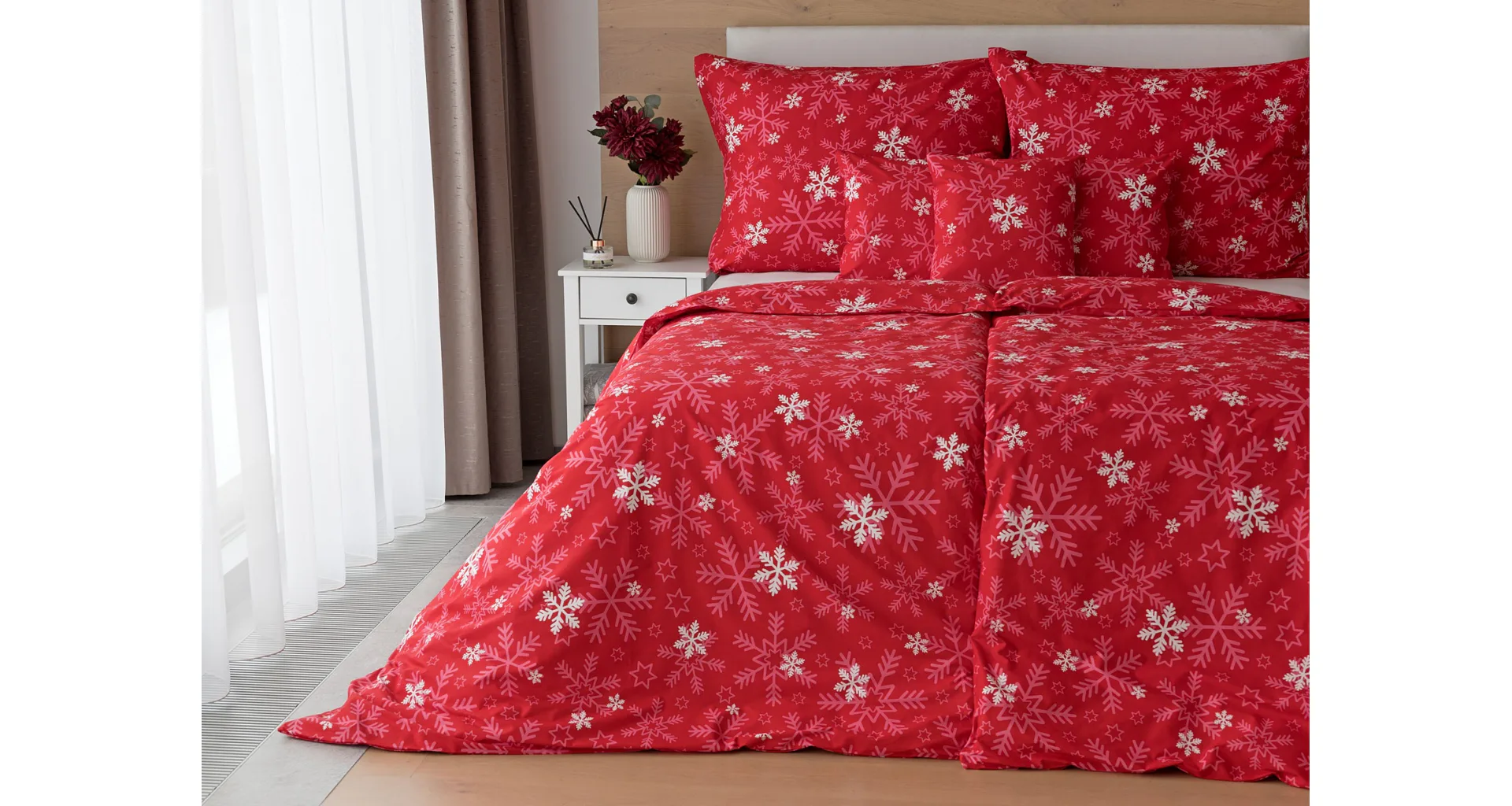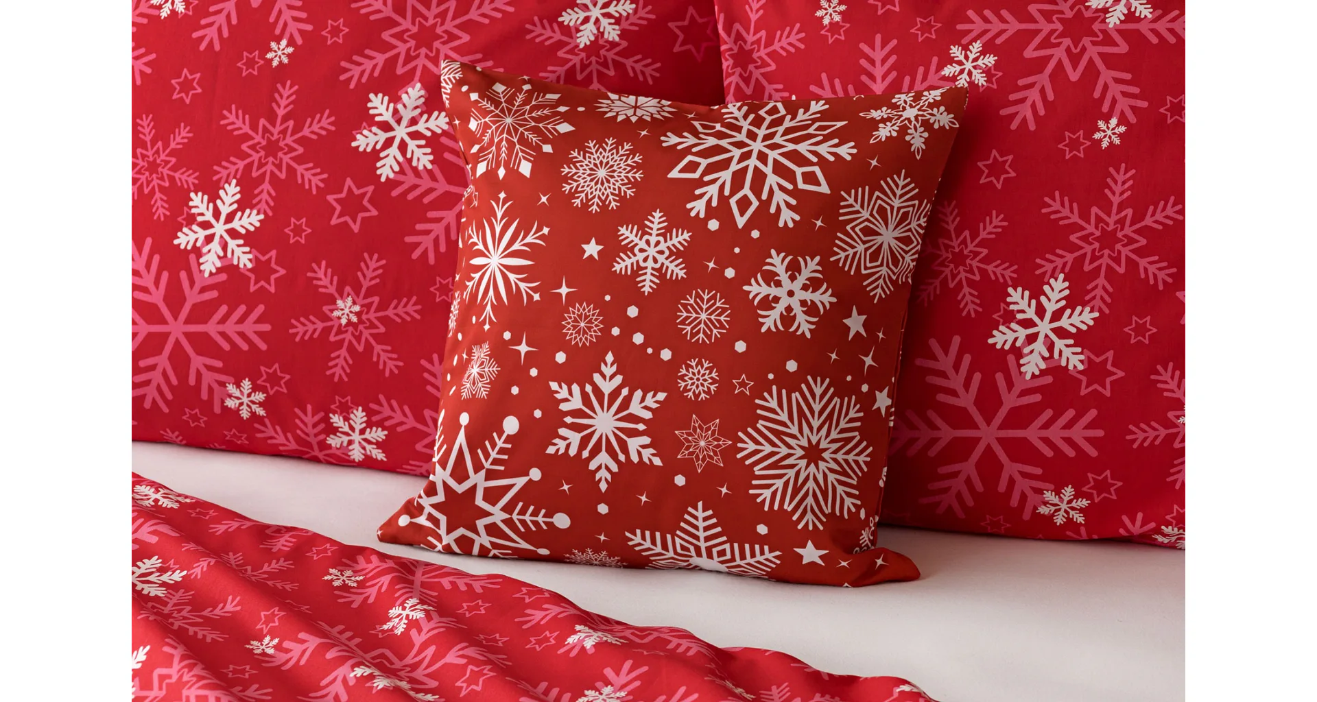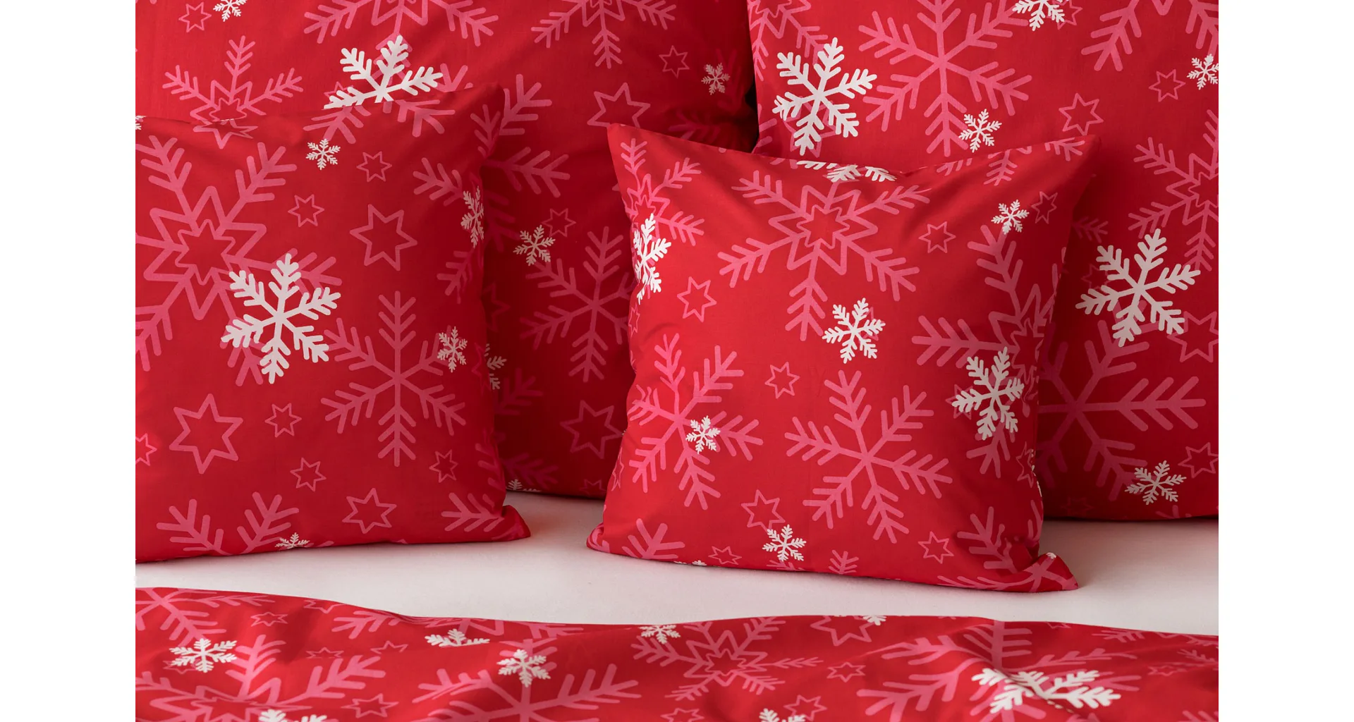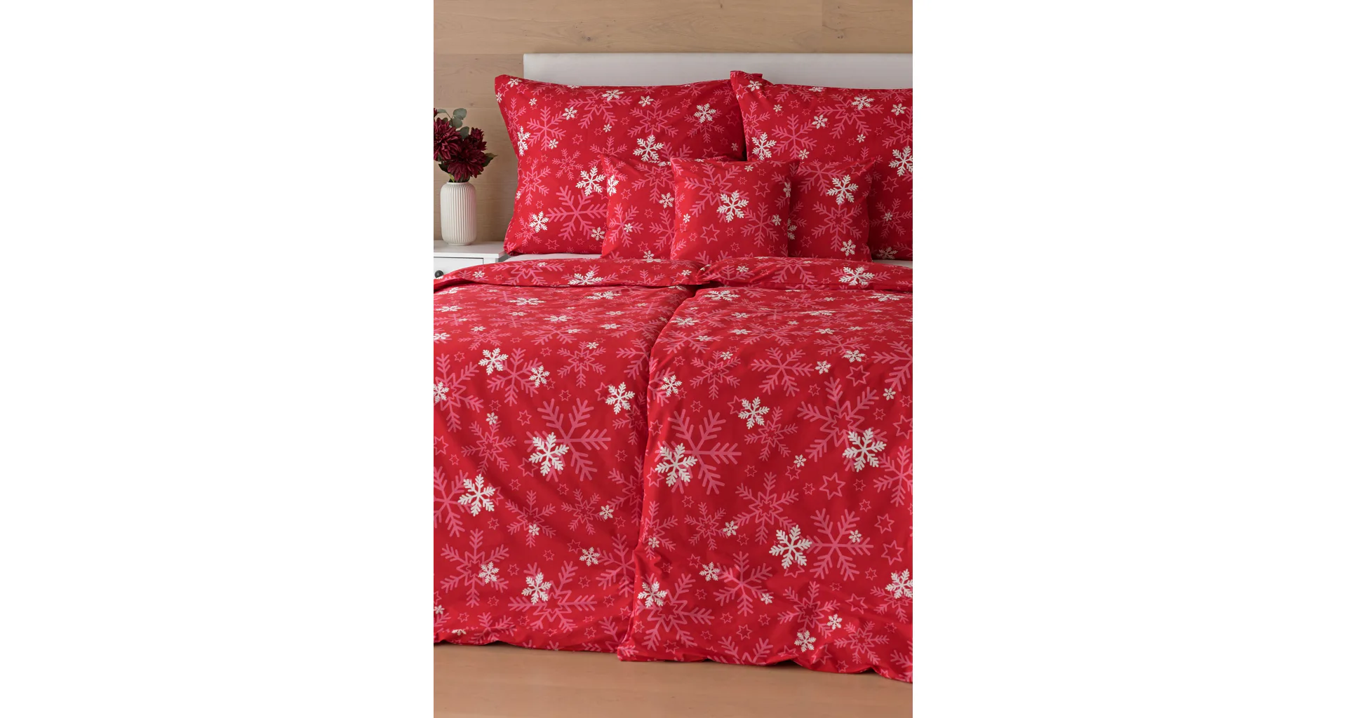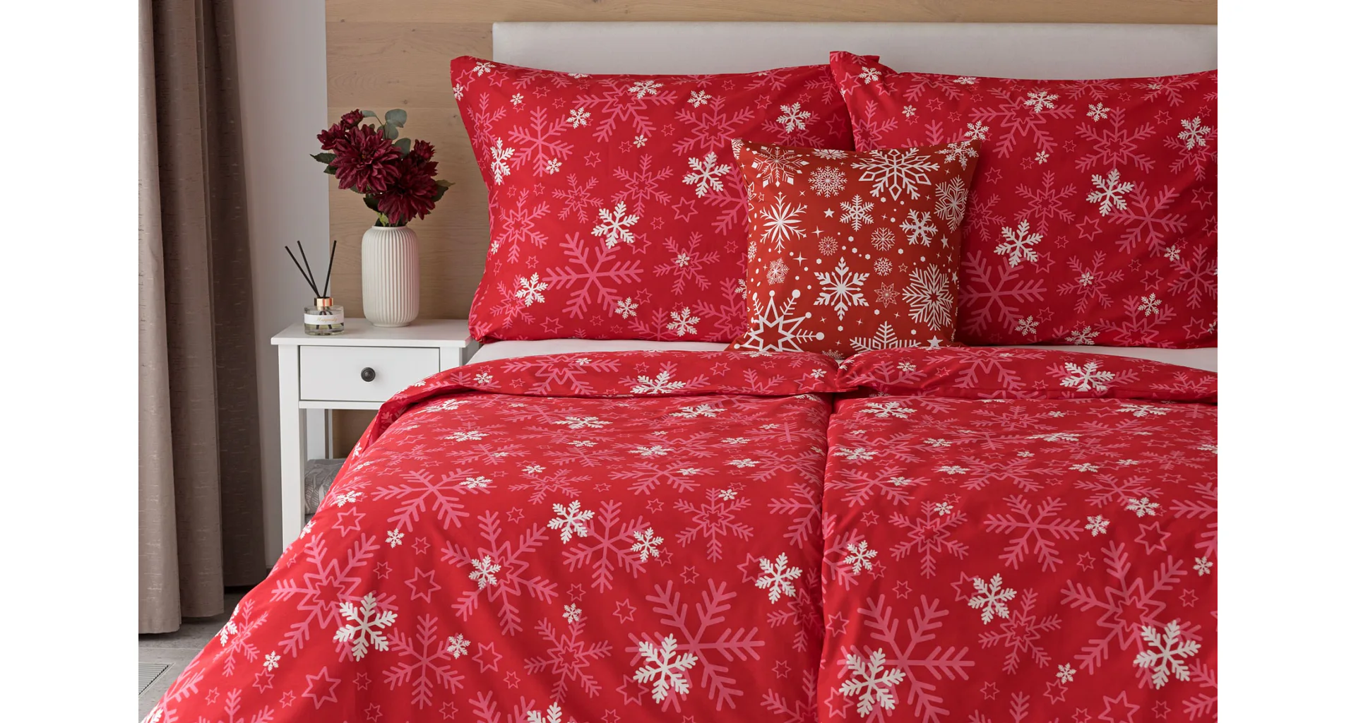 The popular Snowflakes bedding brings a festive atmosphere to our homes. A rich pink red color studded with snowflakes will brighten up any interior.