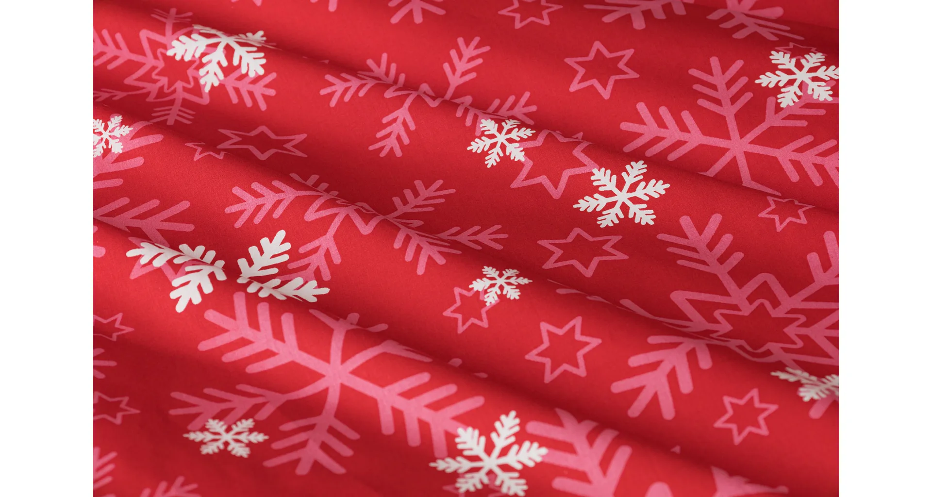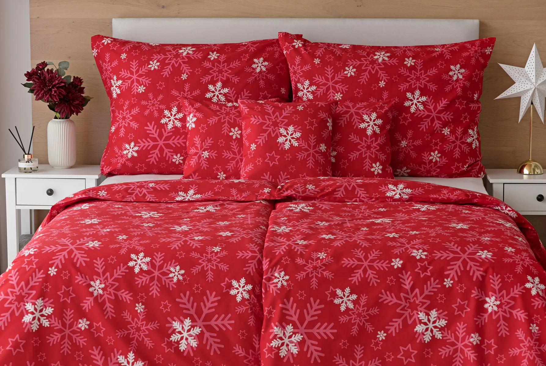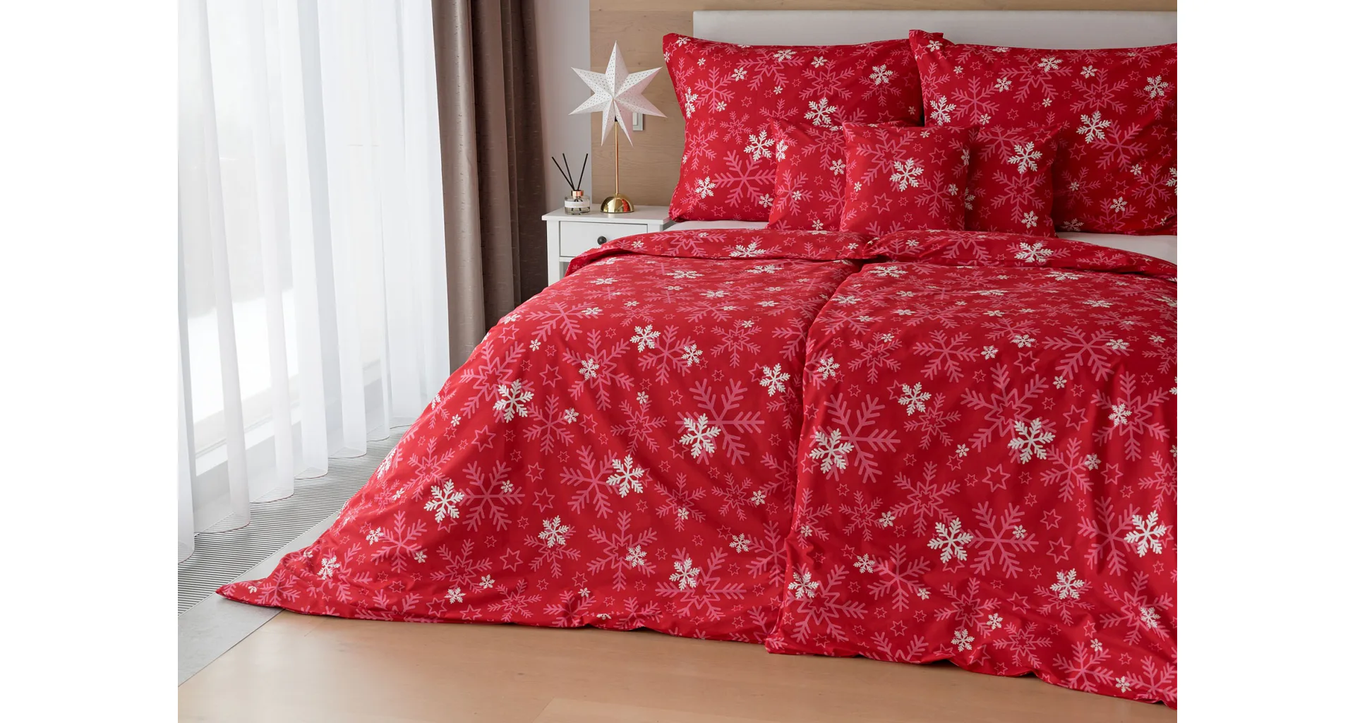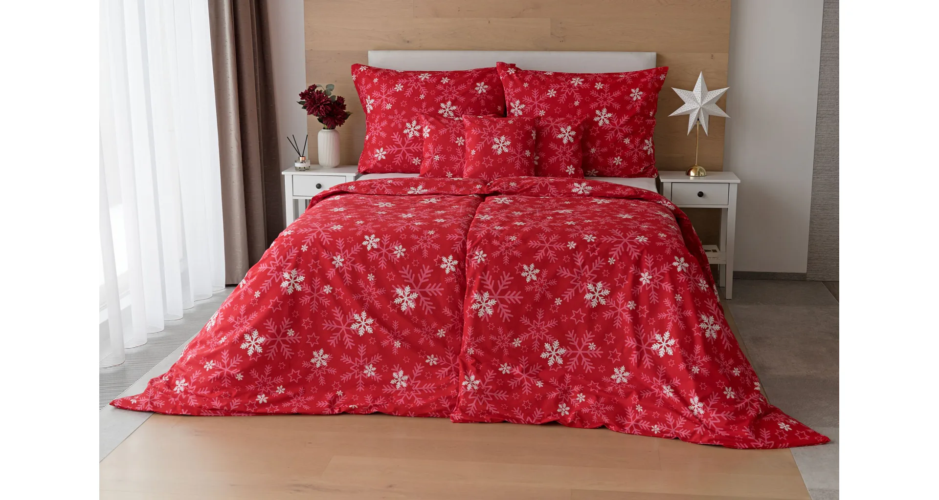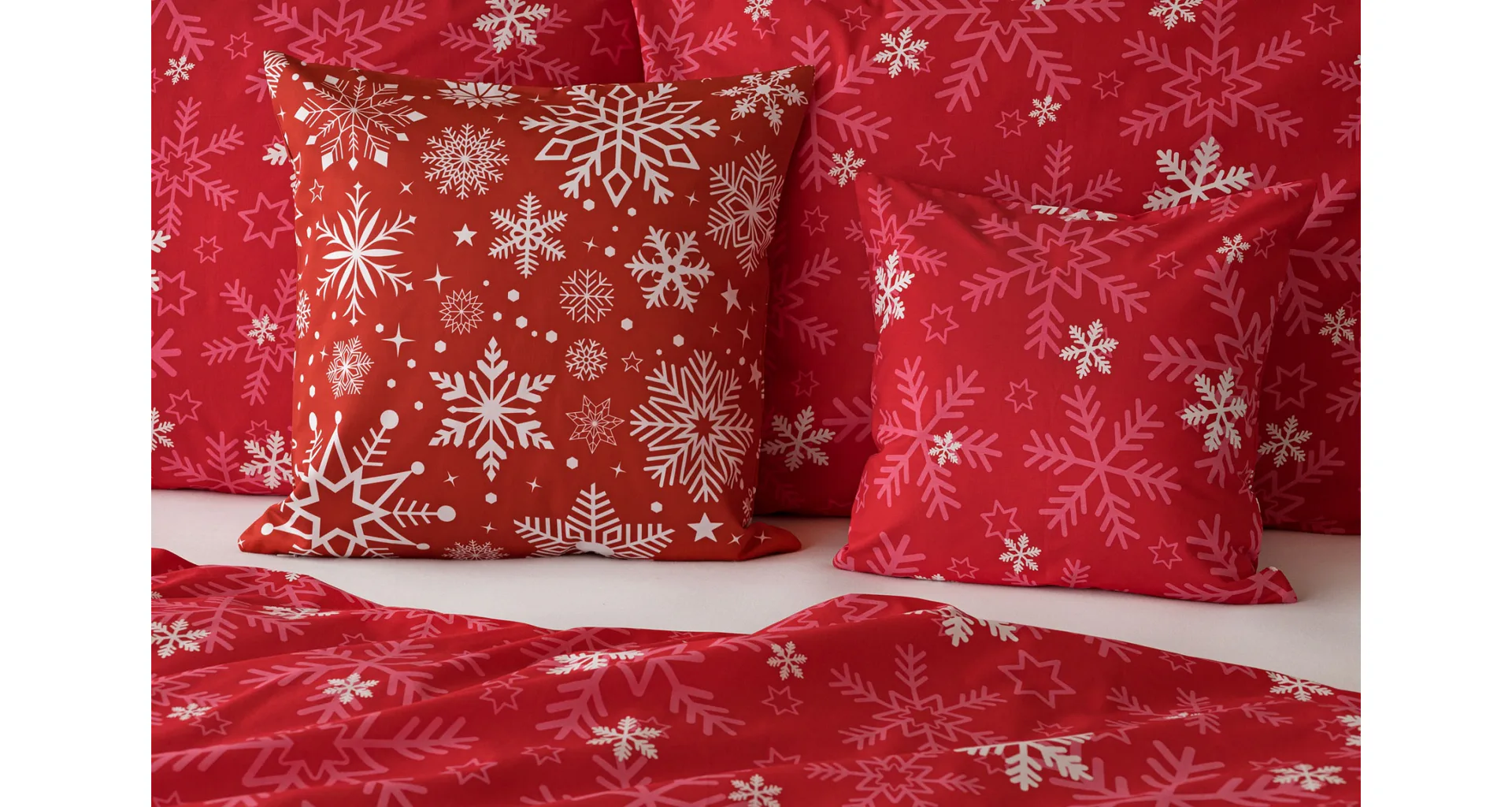 The popular Snowflakes bedding brings a festive atmosphere to our homes. A rich pink red color studded with snowflakes will brighten up any interior.